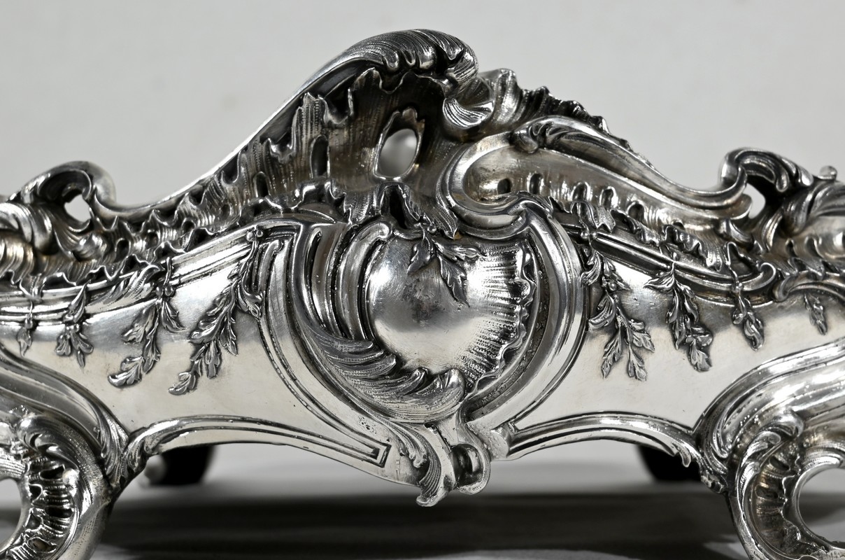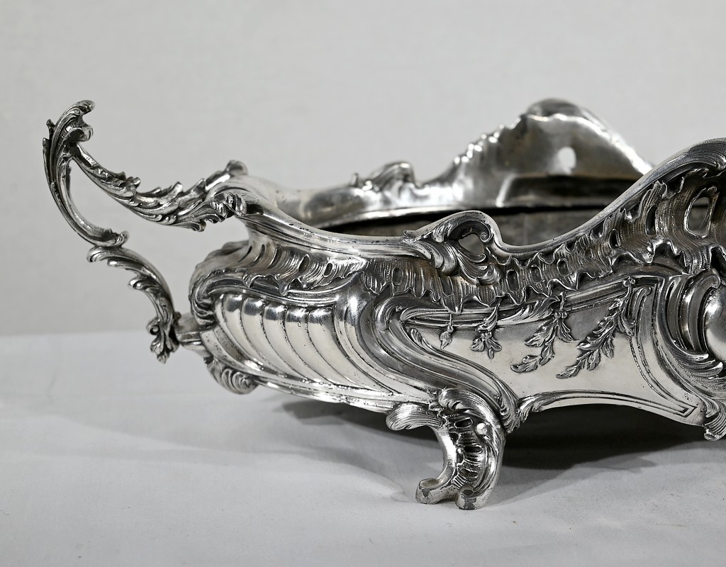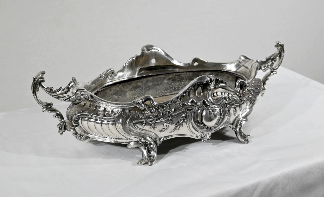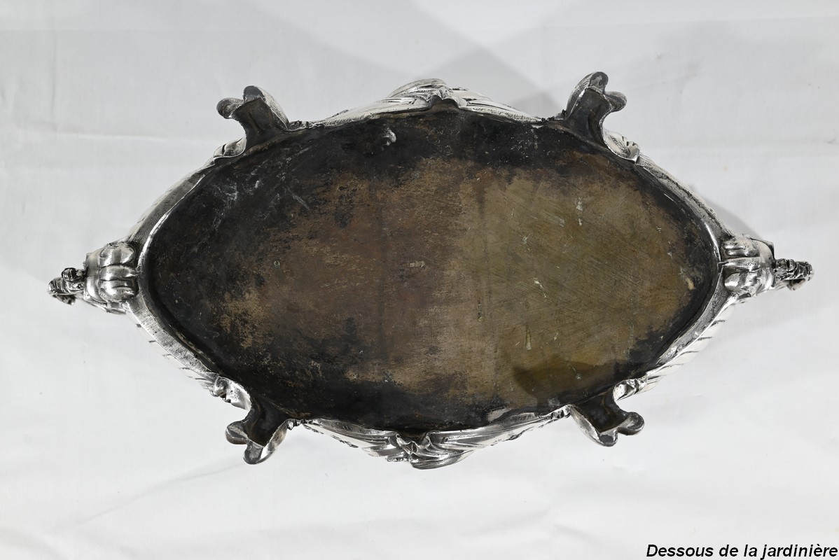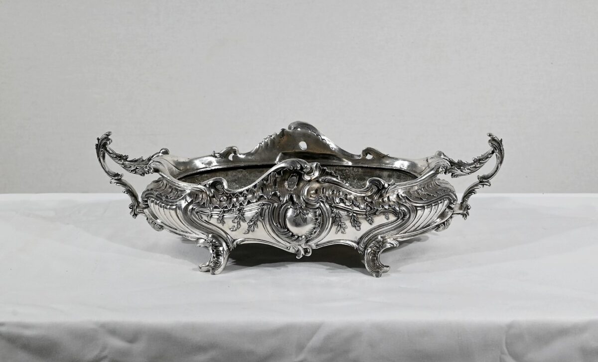 Jardinière ovale, en bronze argenté, de style Louis XV. Le corps, orné sur les parties pansues de coquilles centrales, est entièrement ciselé de rocaille, de rinceaux et de branches fleuries.