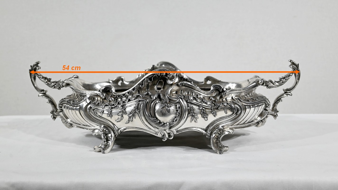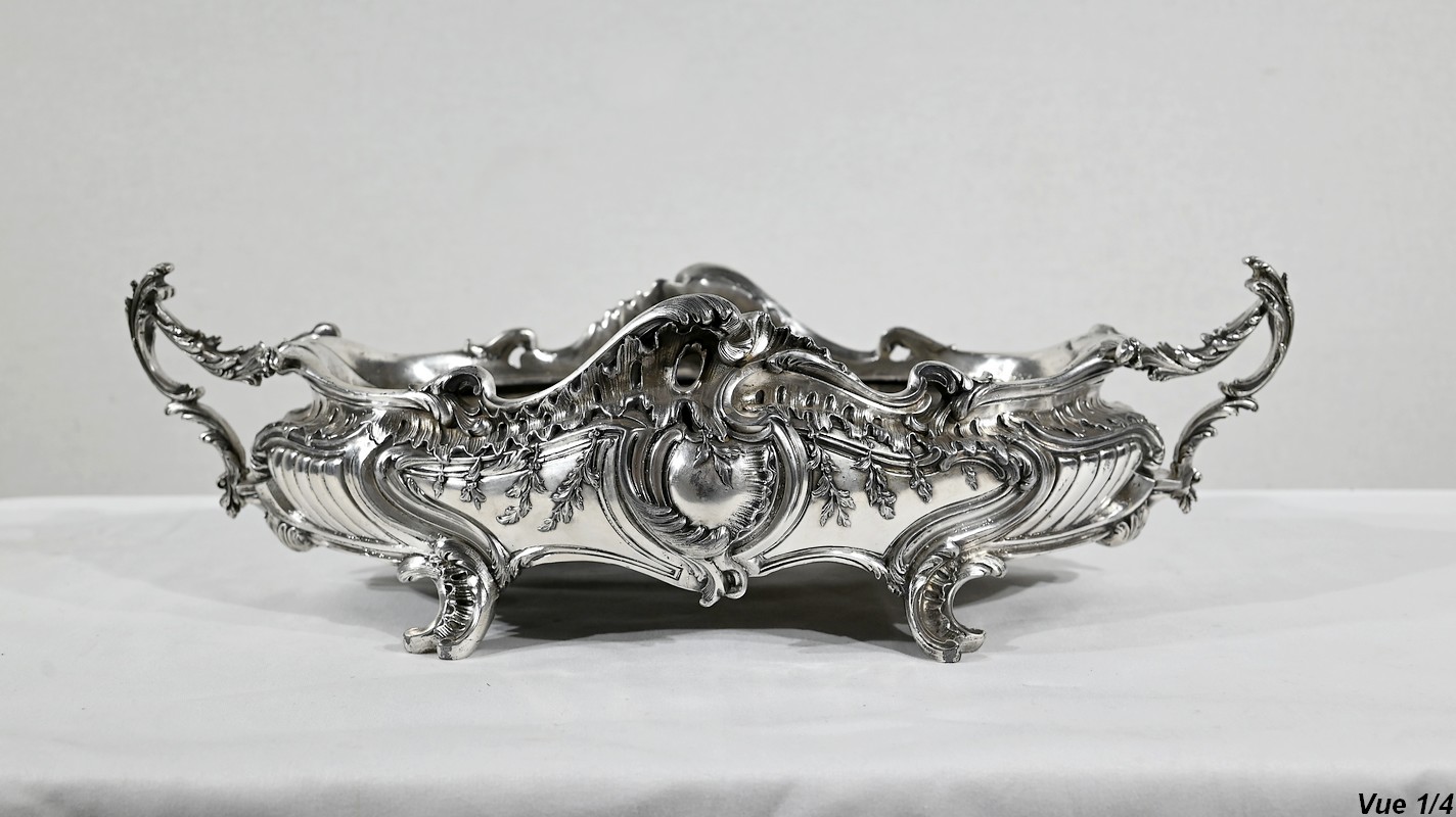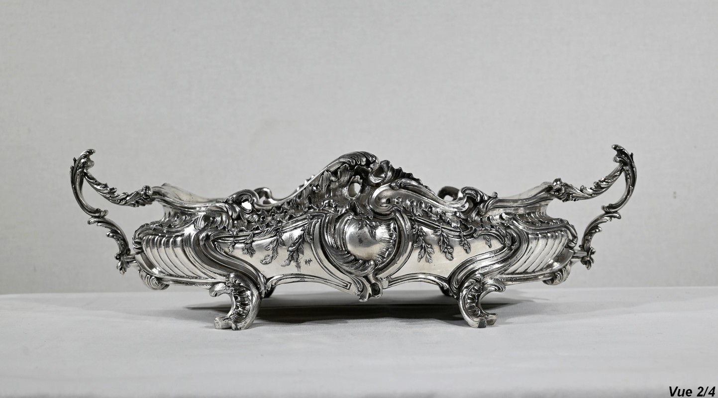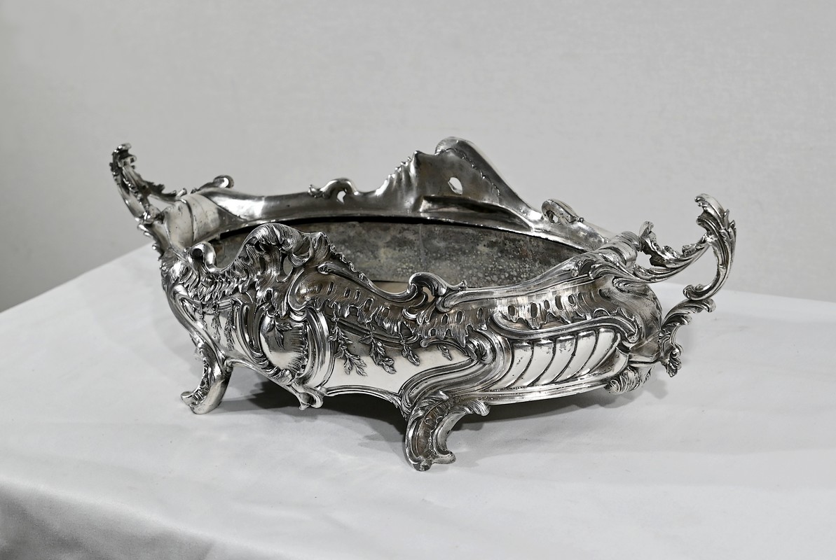 Jardinière ovale, en bronze argenté, de style Louis XV. Le corps, orné sur les parties pansues de coquilles centrales, est entièrement ciselé de rocaille, de rinceaux et de branches fleuries.