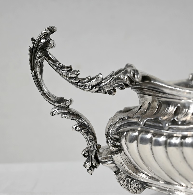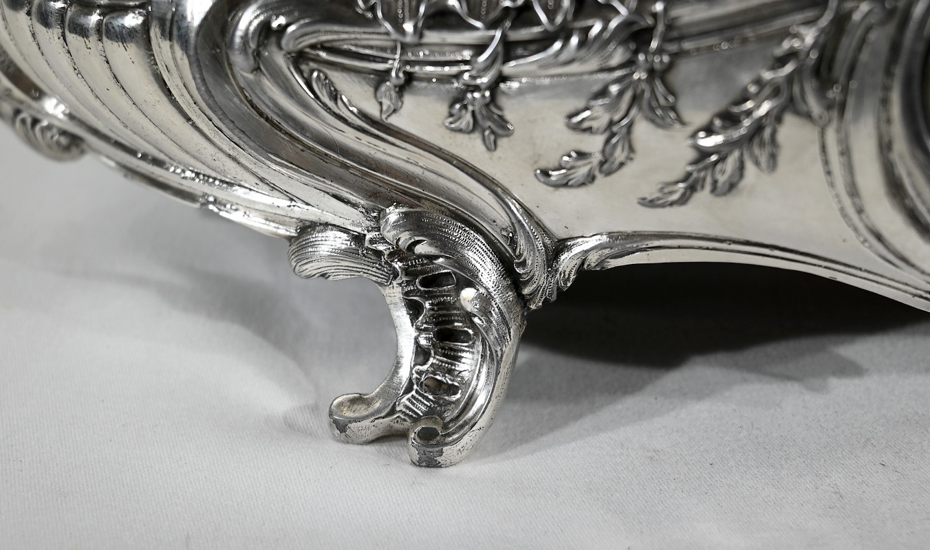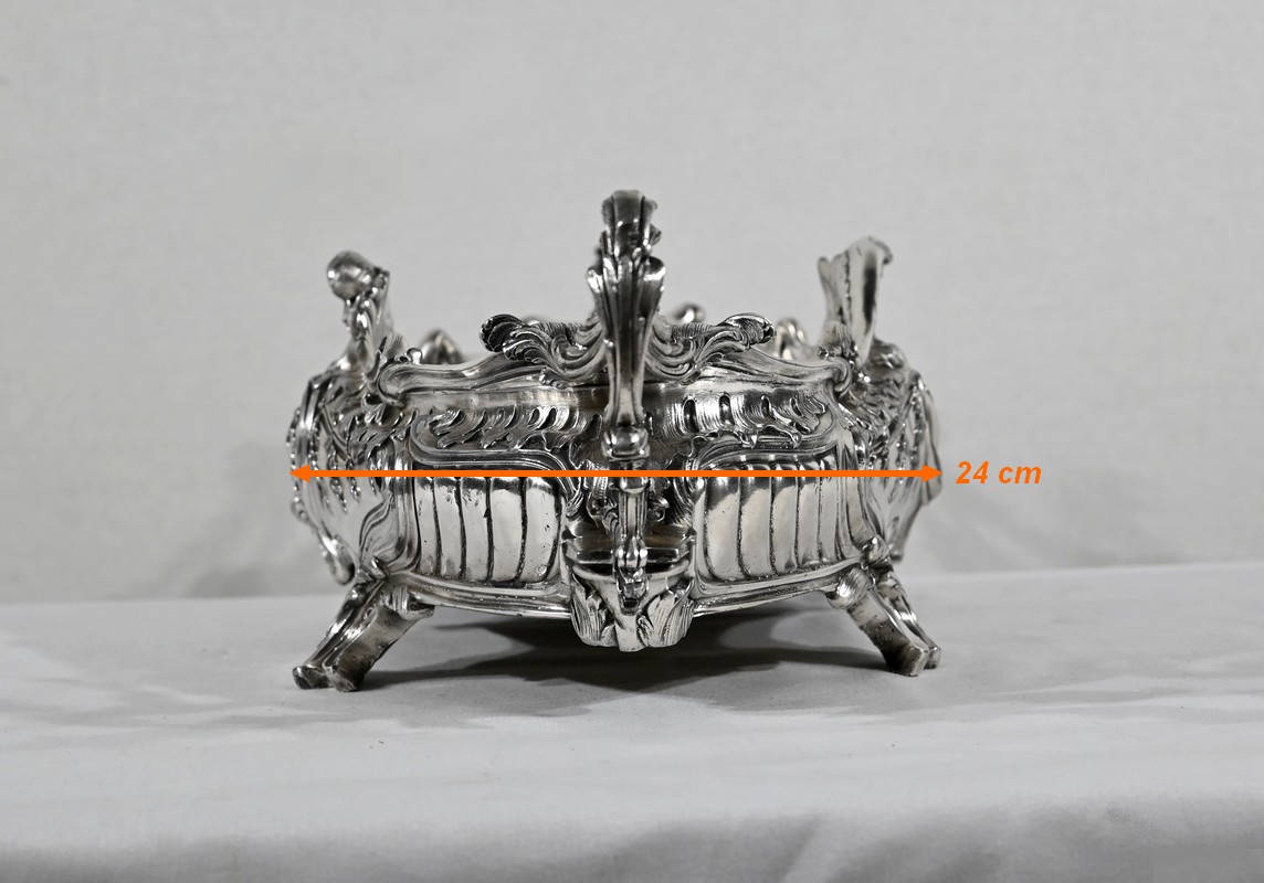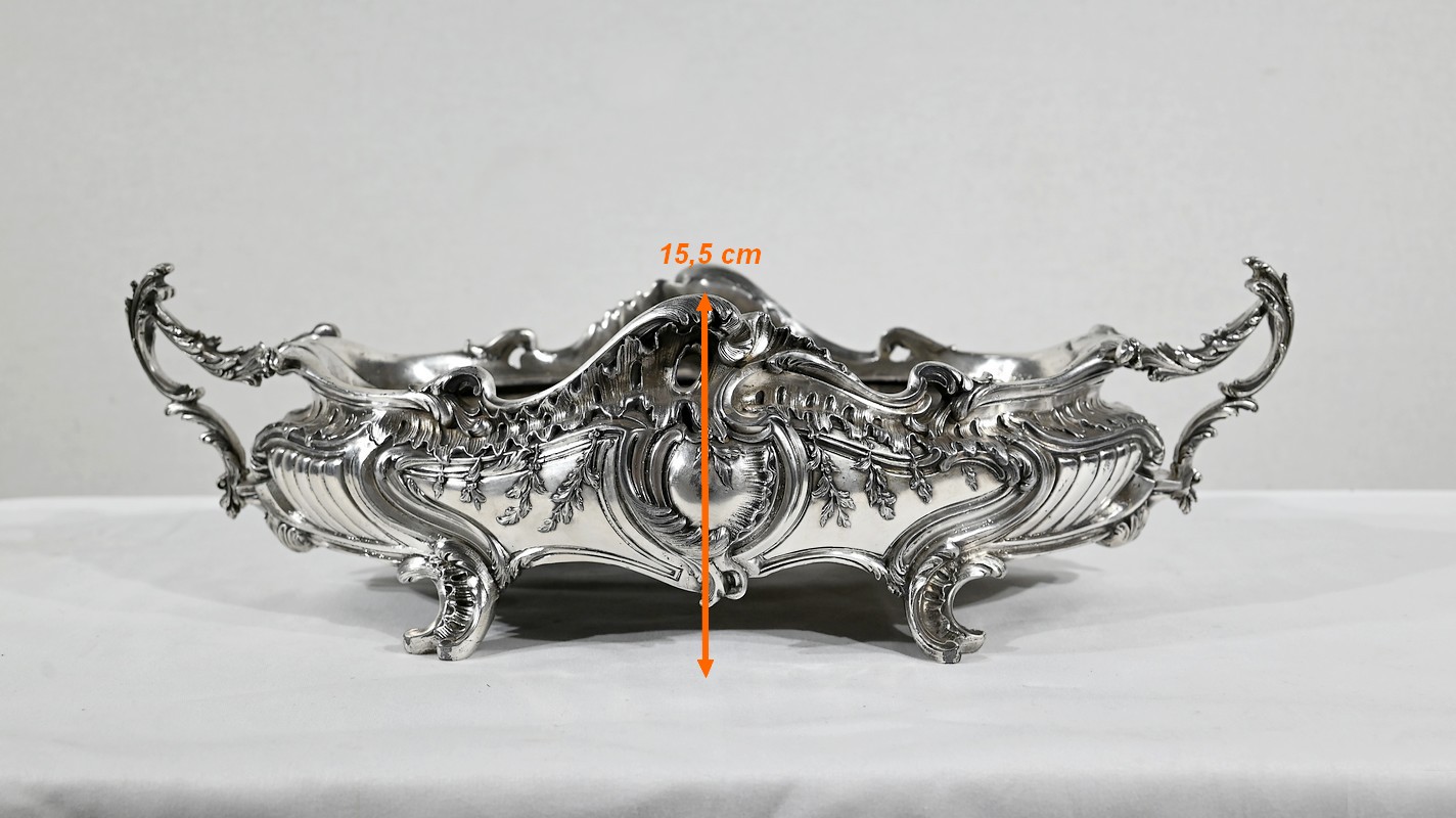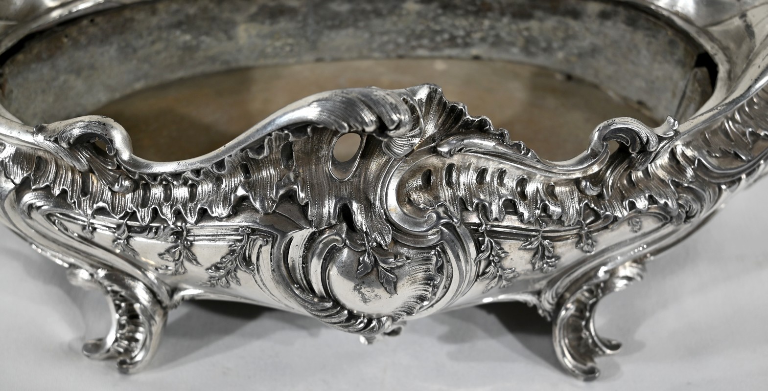 Jardinière ovale, en bronze argenté, de style Louis XV. Le corps, orné sur les parties pansues de coquilles centrales, est entièrement ciselé de rocaille, de rinceaux et de branches fleuries.