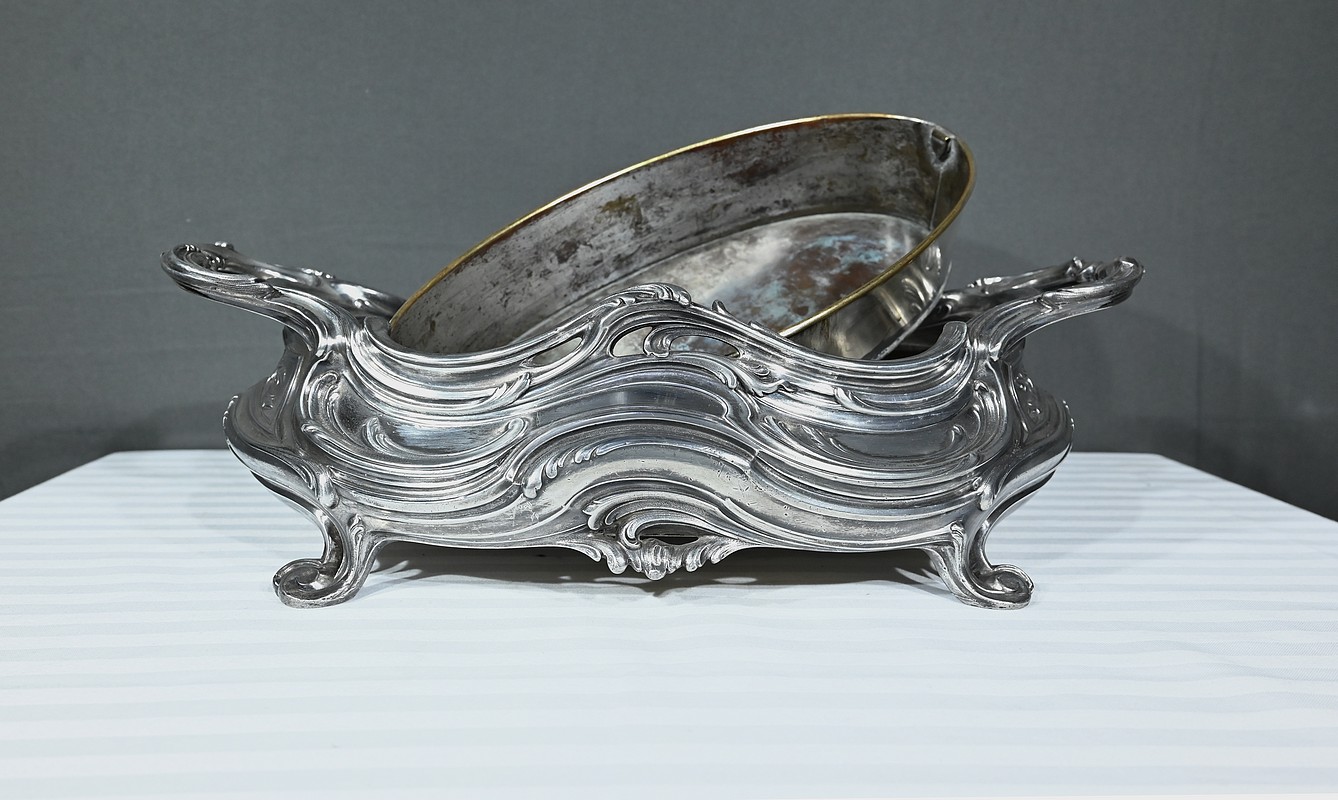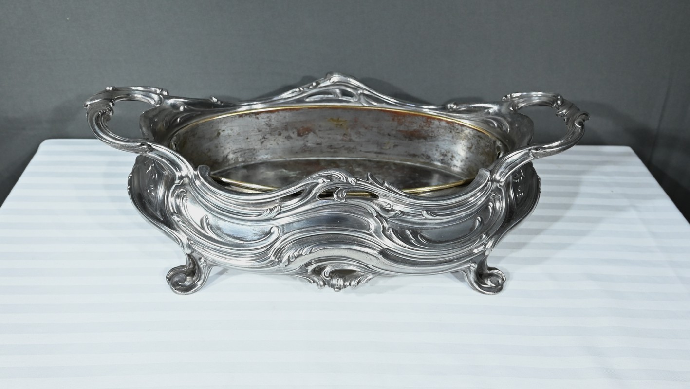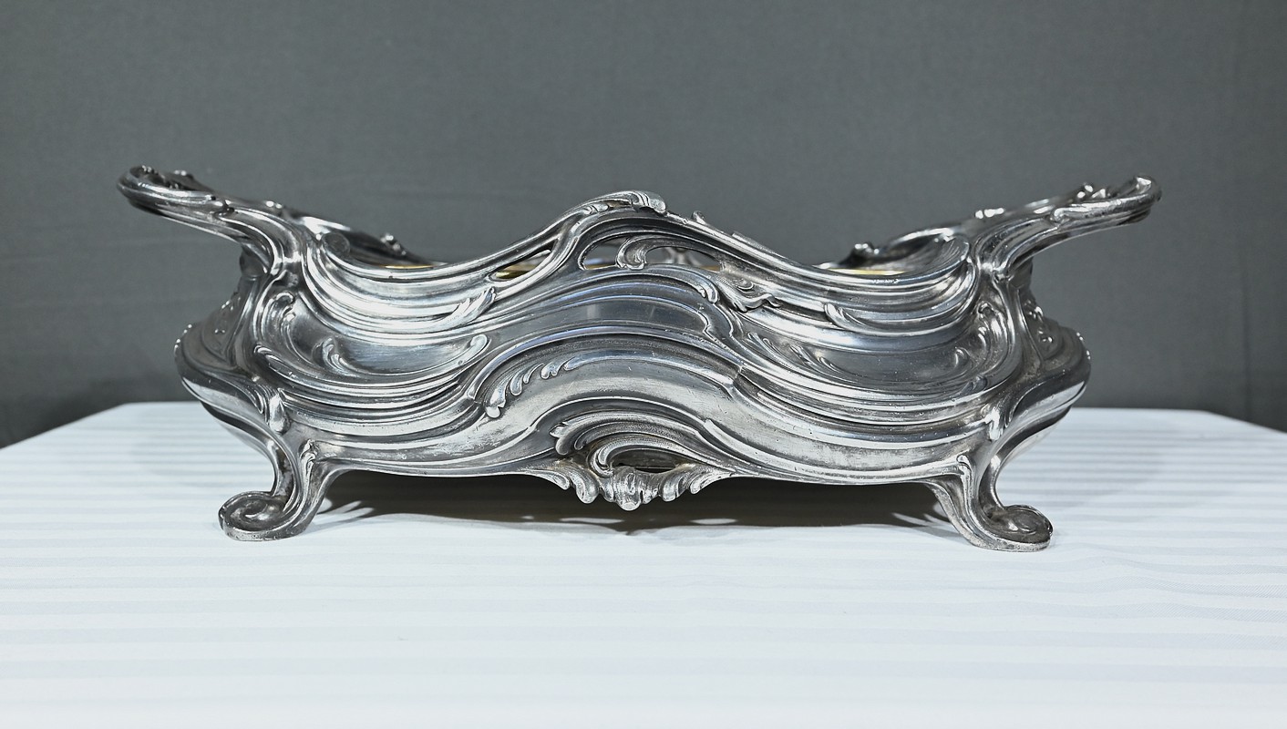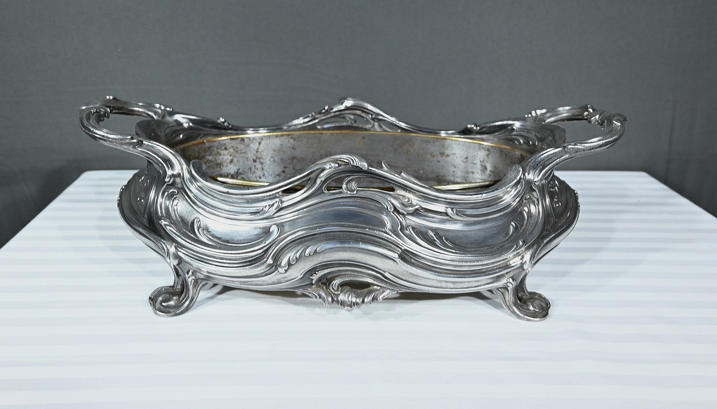 Jardinière de la Belle Époque en bronze argenté à décor de volutes. Ce centre de table ovale repose sur quatre pieds et possède deux poignées ajourées. Il est à noter la présence du poinçon du Maître Orfèvre Victor SAGLIER sous la jardinière. Cette dernière est également munie d’un petit bassin amovible en métal argenté.