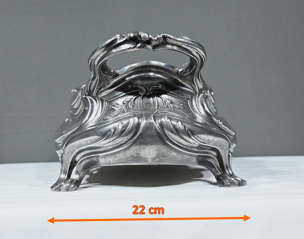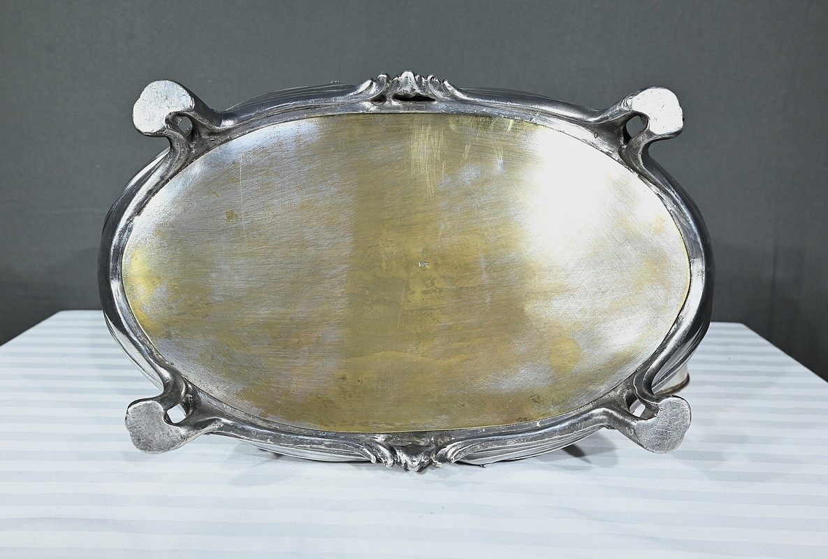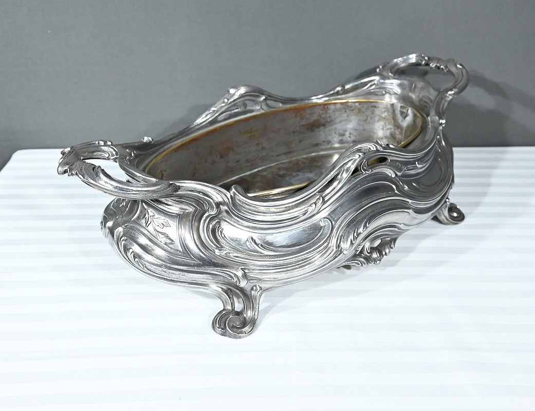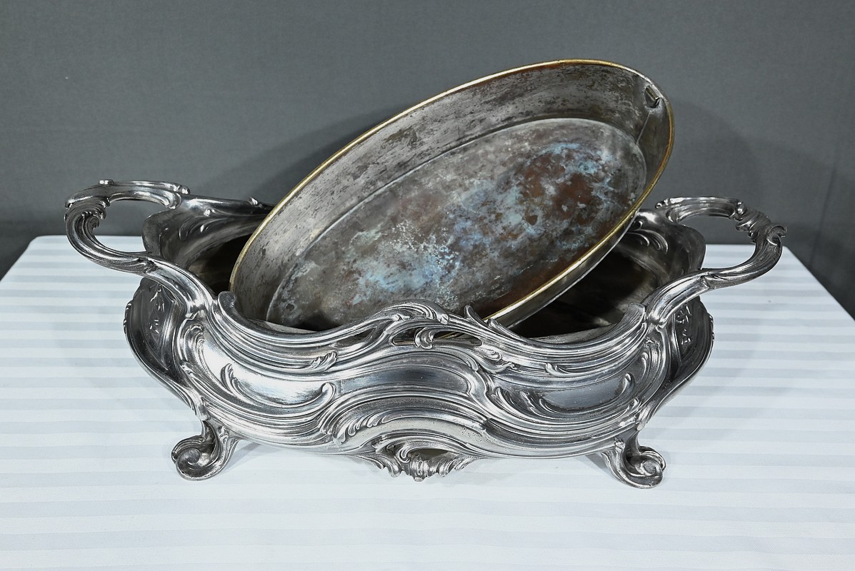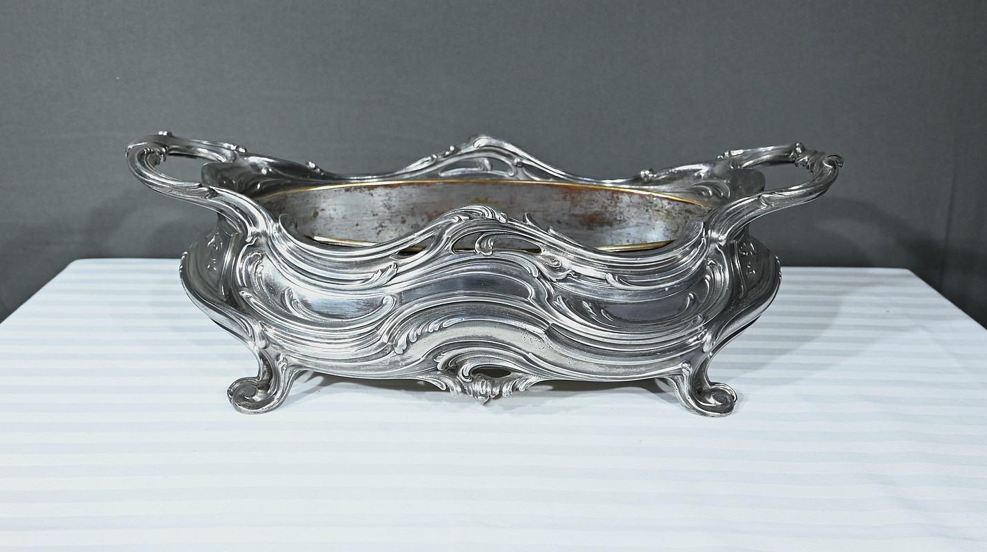 Jardinière de la Belle Époque en bronze argenté à décor de volutes. Ce centre de table ovale repose sur quatre pieds et possède deux poignées ajourées. Il est à noter la présence du poinçon du Maître Orfèvre Victor SAGLIER sous la jardinière. Cette dernière est également munie d’un petit bassin amovible en métal argenté.