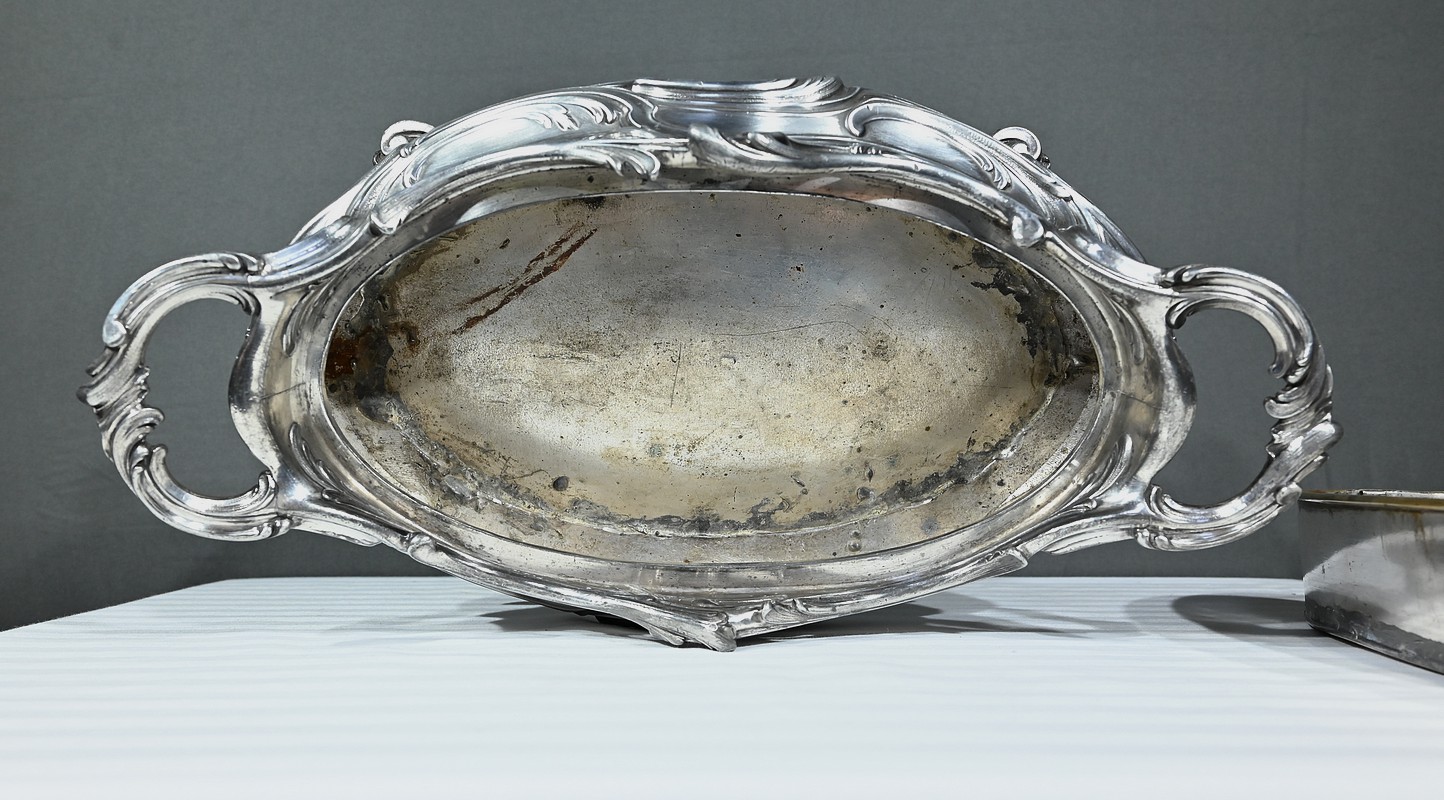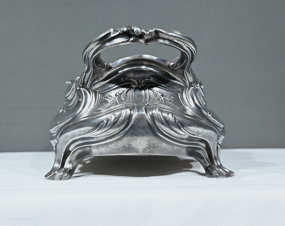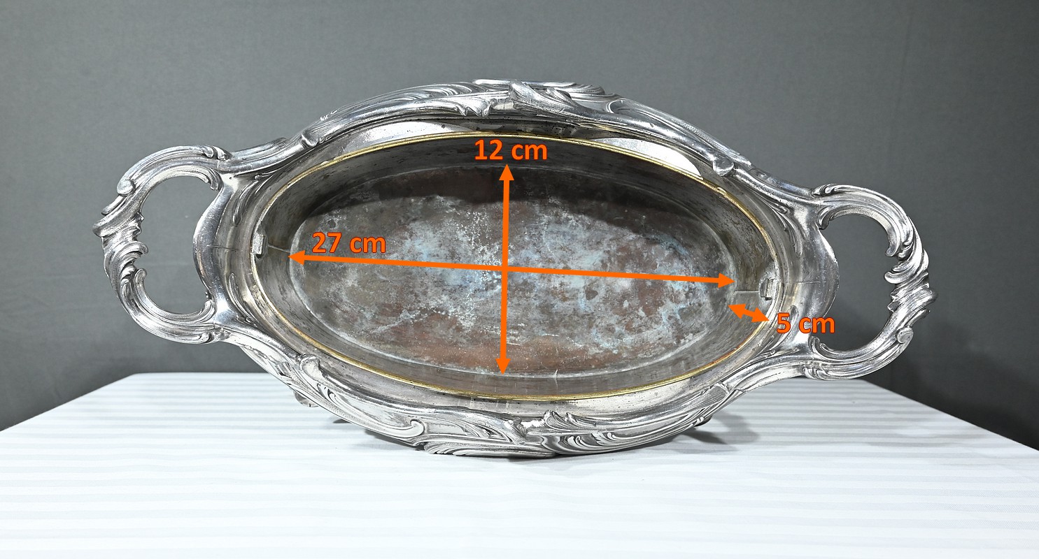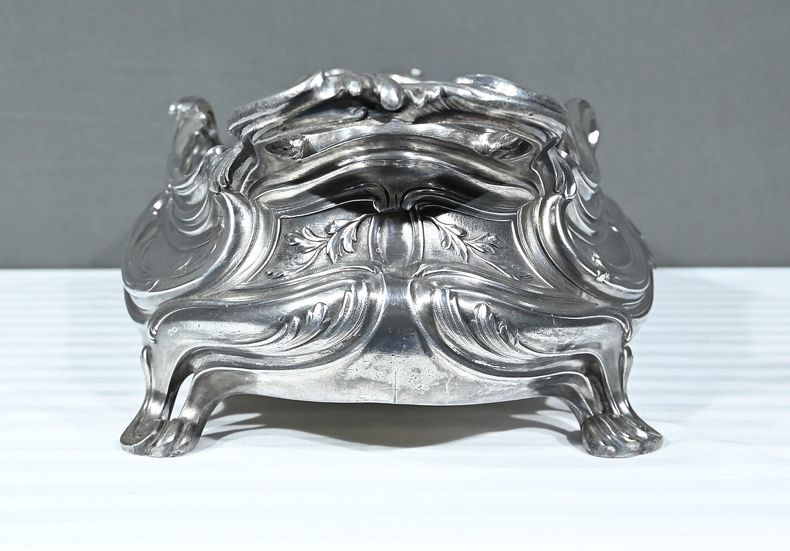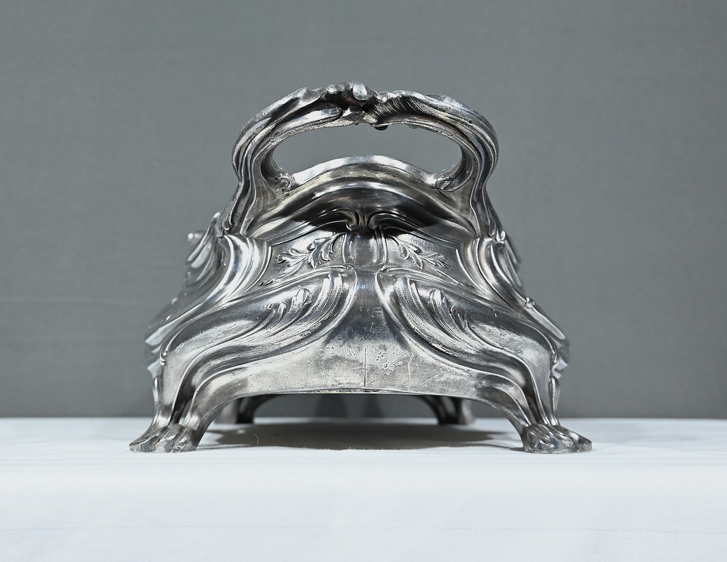Jardinière de la Belle Époque en bronze argenté à décor de volutes. Ce centre de table ovale repose sur quatre pieds et possède deux poignées ajourées. Il est à noter la présence du poinçon du Maître Orfèvre Victor SAGLIER sous la jardinière. Cette dernière est également munie d’un petit bassin amovible en métal argenté.