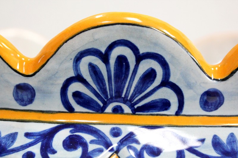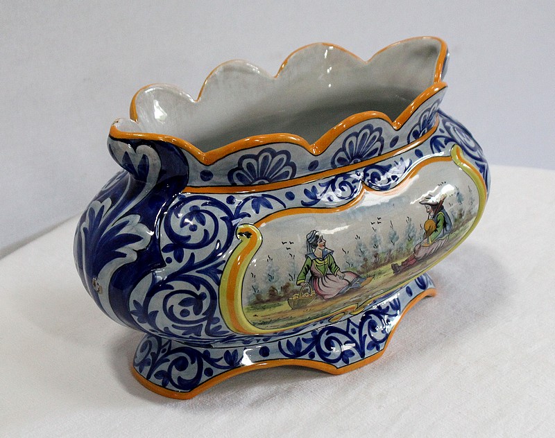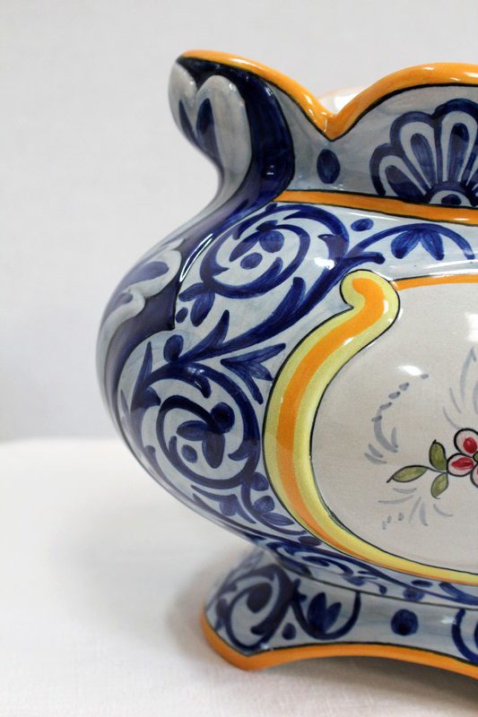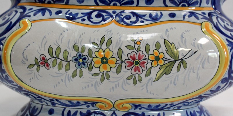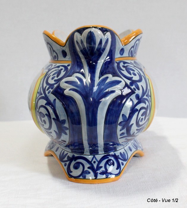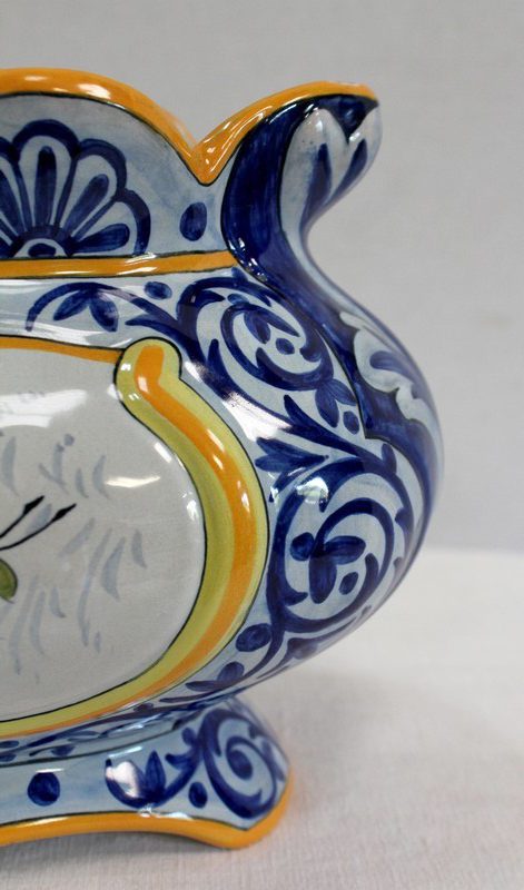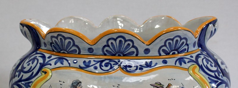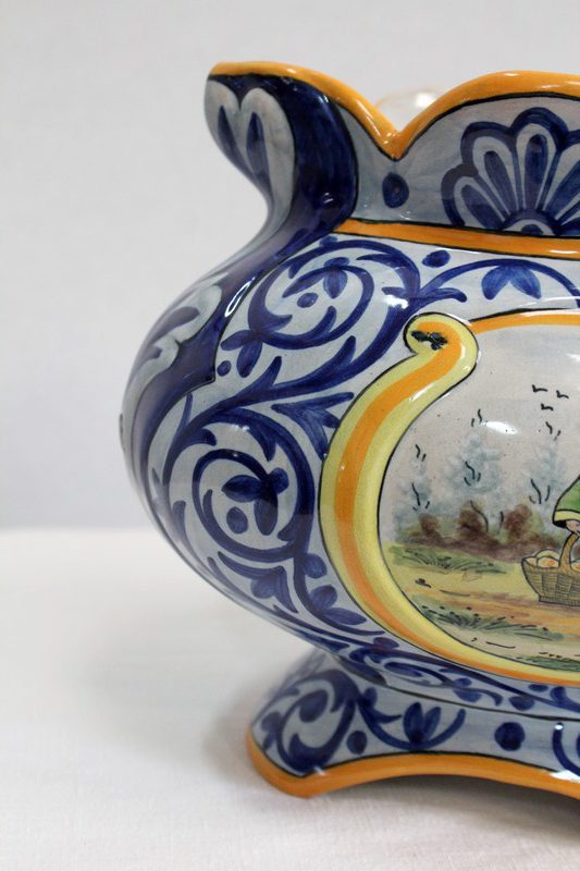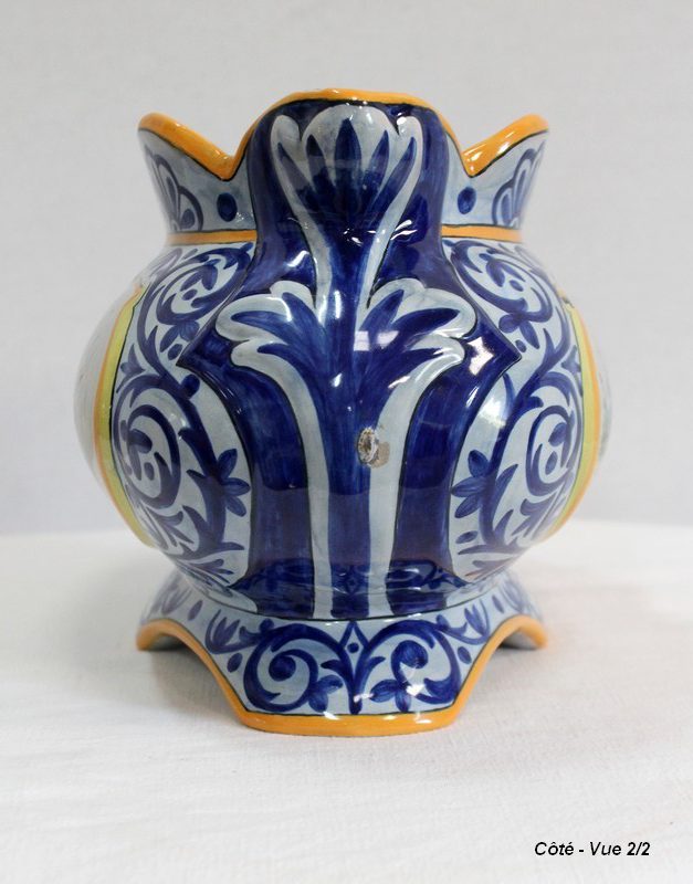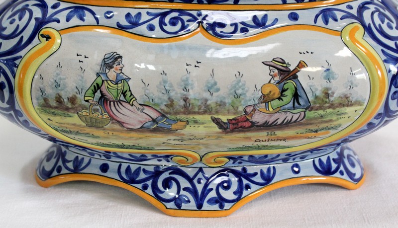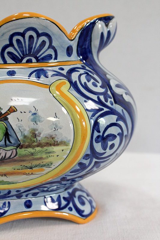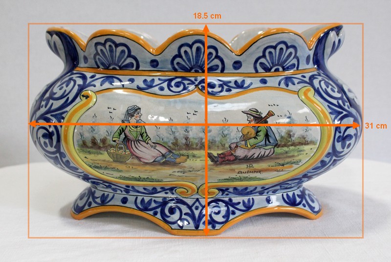 Objet incontournable du patrimoine breton offrant à votre regard une scène de cette riche culture, cette Jardinière égayera par ses vifs coloris tout meuble sur lequel vous jugerez bon de l’exposer. Elle pourra – ou non – être accompagnée d’un paire de vases assortis (réf 070921 Bis).