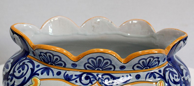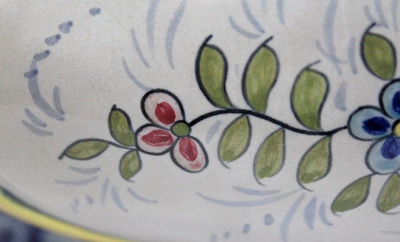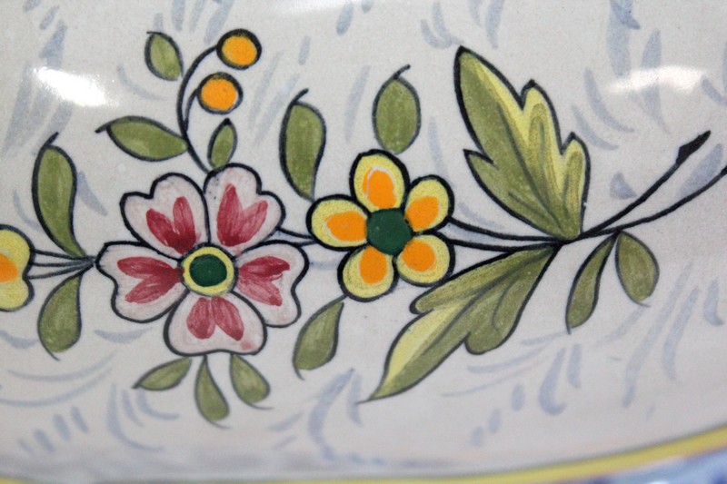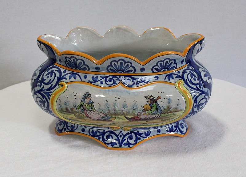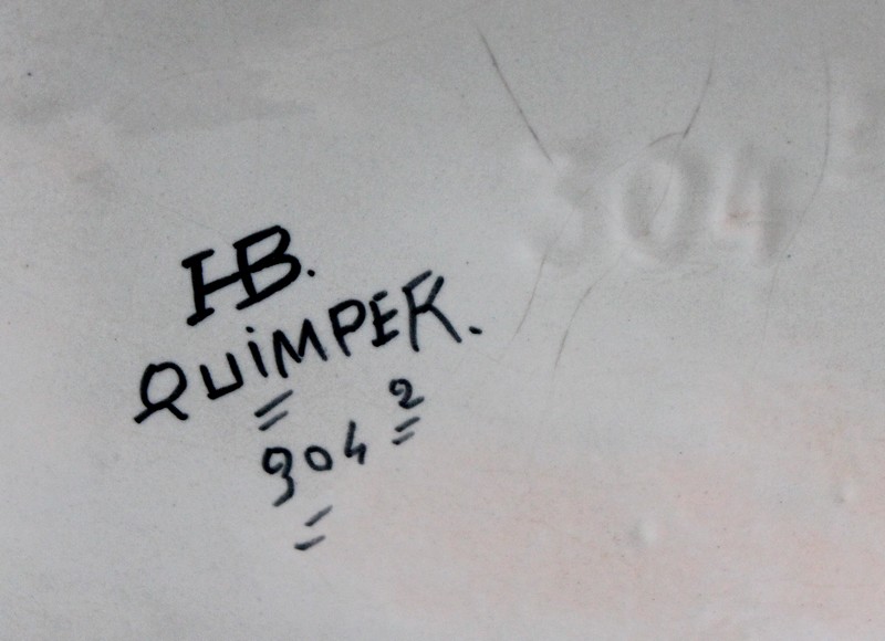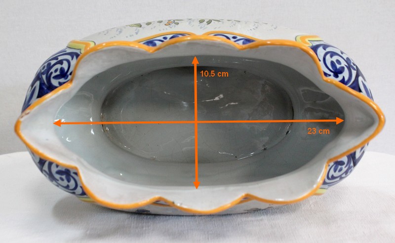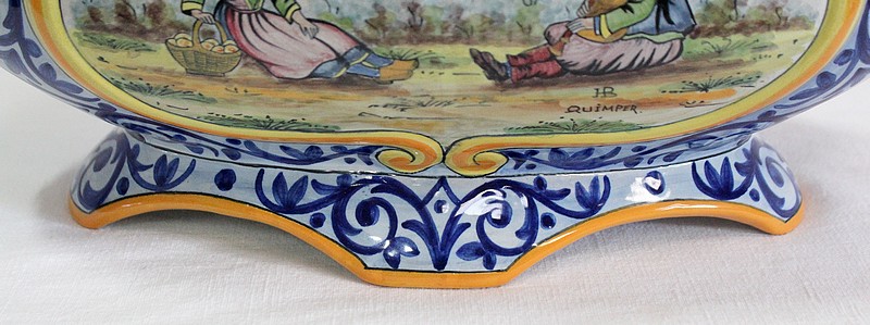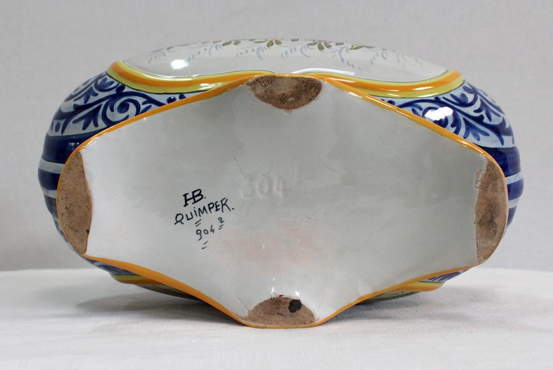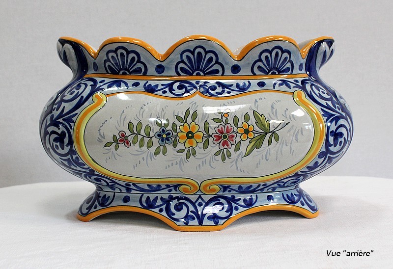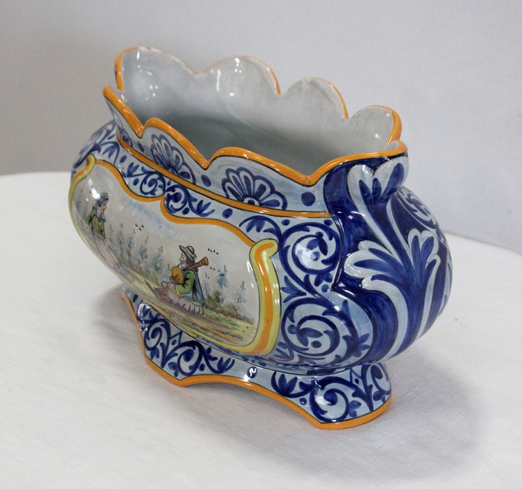 Jardinière de table en faïence à décors polychromes, réalisée par la manufacture quimpéroise HB, dont la signature est apposée à 2 reprises, sur et sous cette céramique.