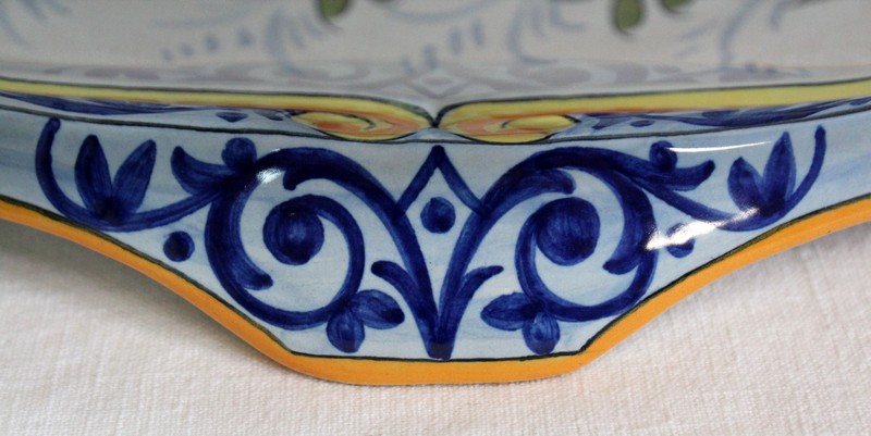 Ce modèle de forme ovale présente de chatoyantes couleurs, des motifs bleu foncé sur fond bleu ciel, contrasté par un festonnage de couleur jaune orangée.
