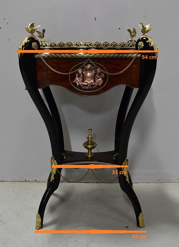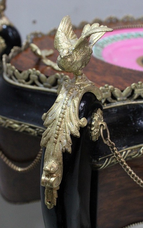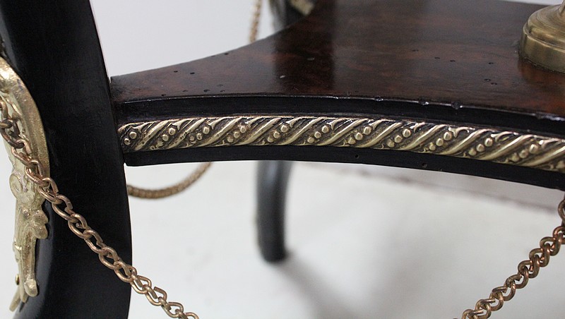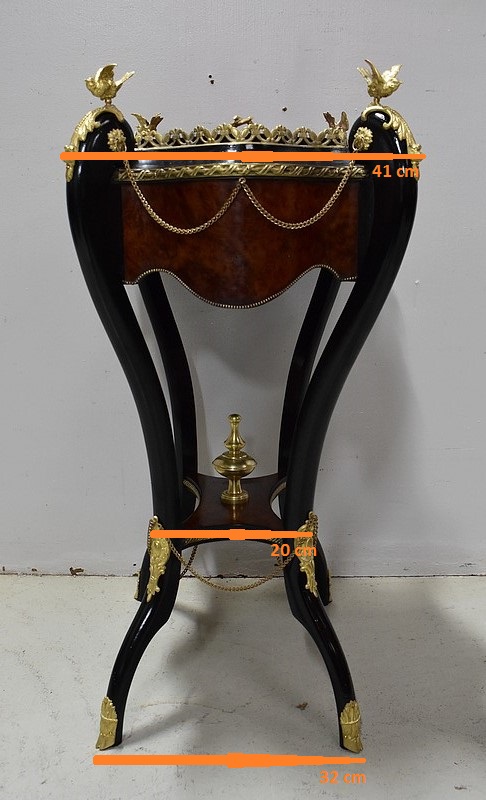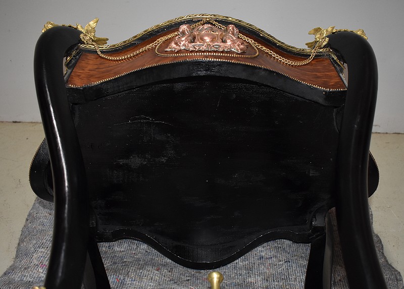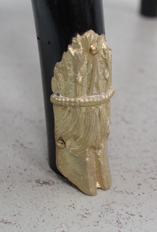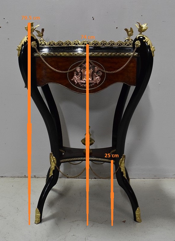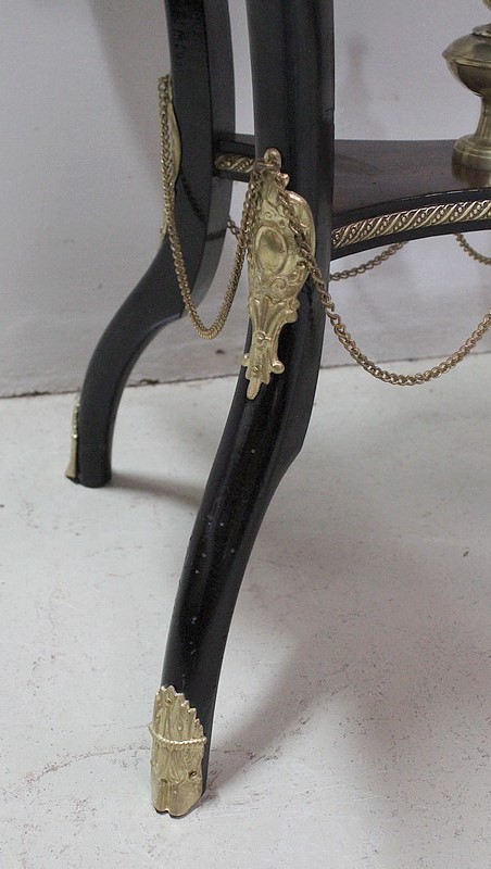 L’ensemble repose sur quatre jambes en bois noirci généreusement cambrées. Elle sont enjolivées en partie haute de Bronzes représentant des oiseaux aux ailes déployées sur des chutes feuillagées. Des ornements du même alliage précieux garnissent le creux de ces quatre pieds terminés par des Sabots. On notera la présence de fines chaines suspendues entre les Bronzes, apportant de la légèreté à ce meuble Décoratif déjà plein de finesse.