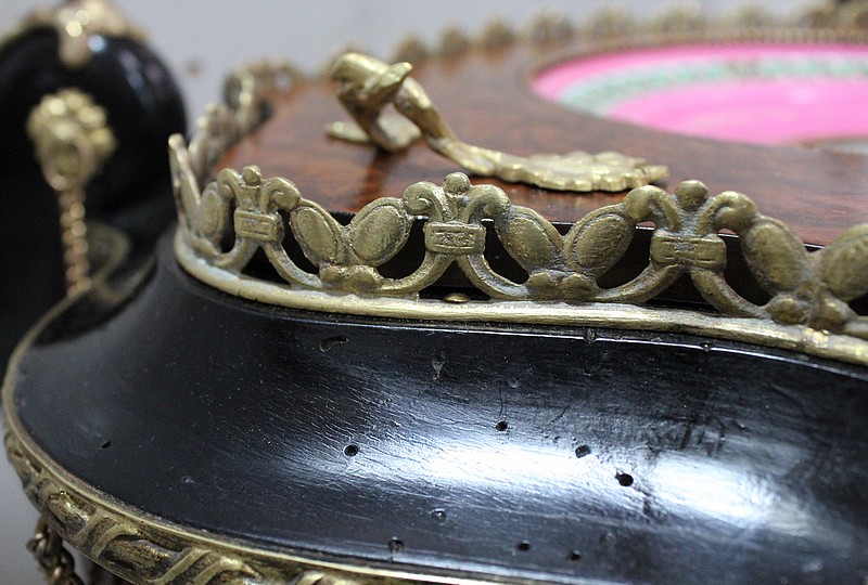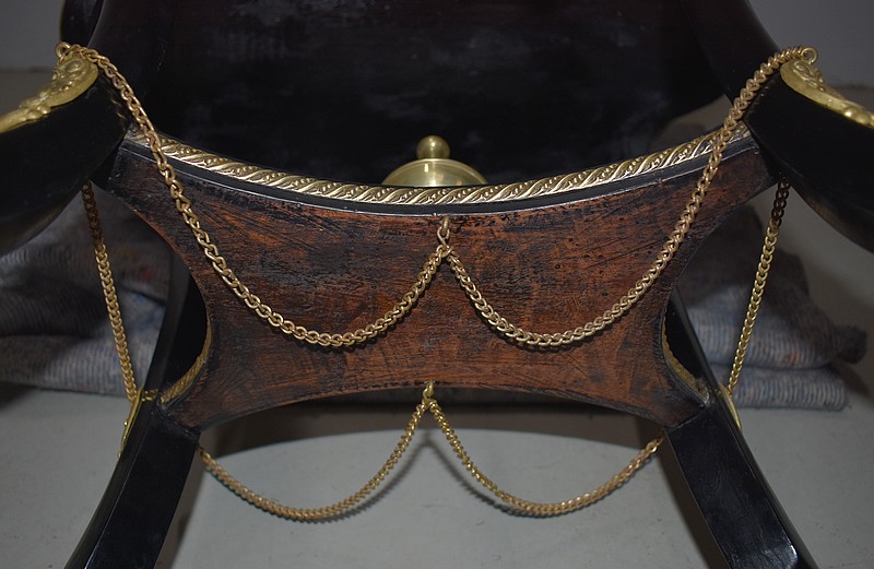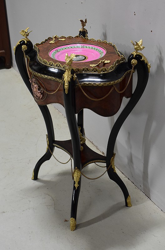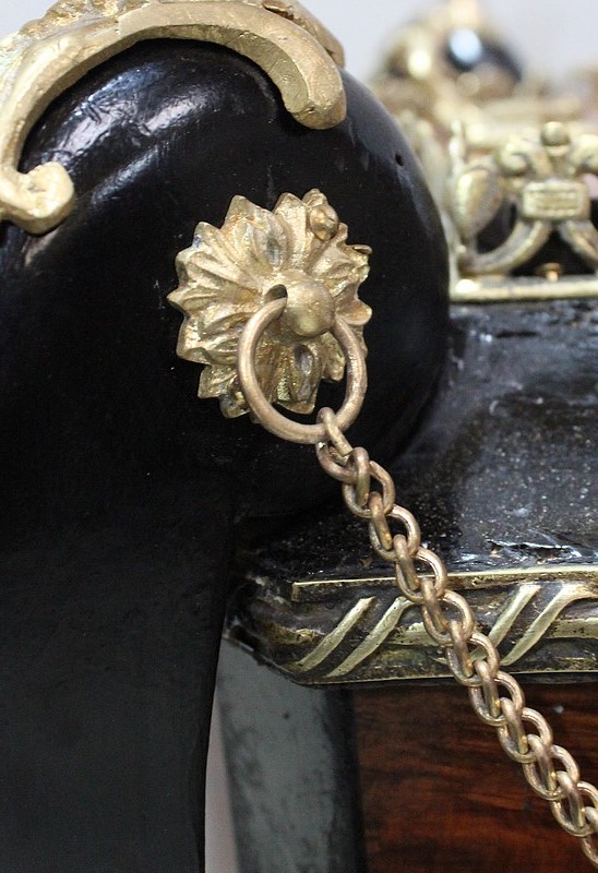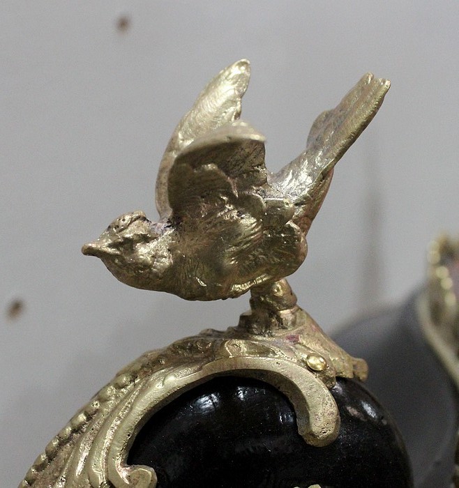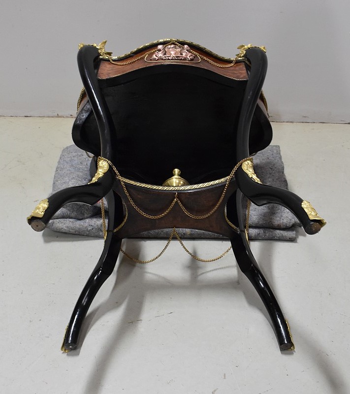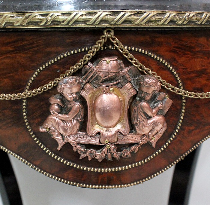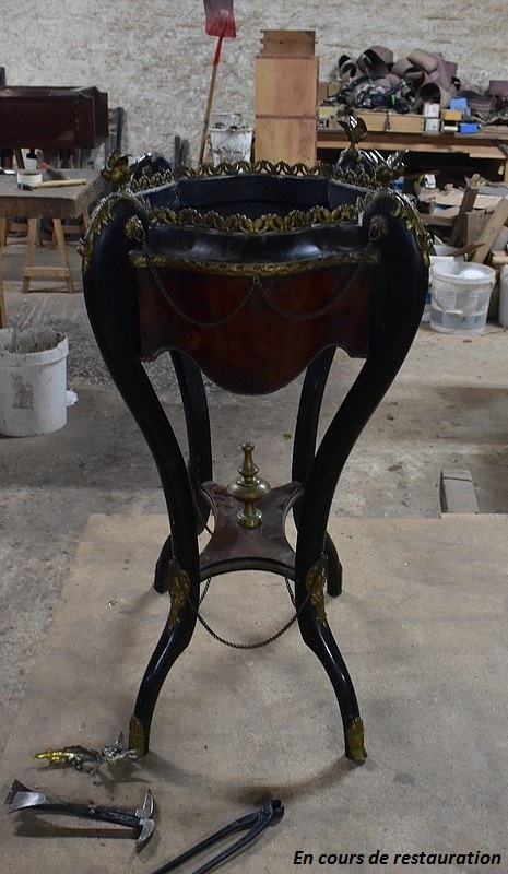 L’ensemble repose sur quatre jambes en bois noirci généreusement cambrées. Elle sont enjolivées en partie haute de Bronzes représentant des oiseaux aux ailes déployées sur des chutes feuillagées. Des ornements du même alliage précieux garnissent le creux de ces quatre pieds terminés par des Sabots. On notera la présence de fines chaines suspendues entre les Bronzes, apportant de la légèreté à ce meuble Décoratif déjà plein de finesse.