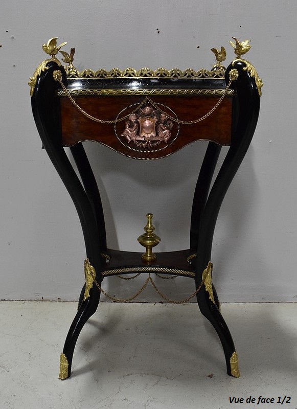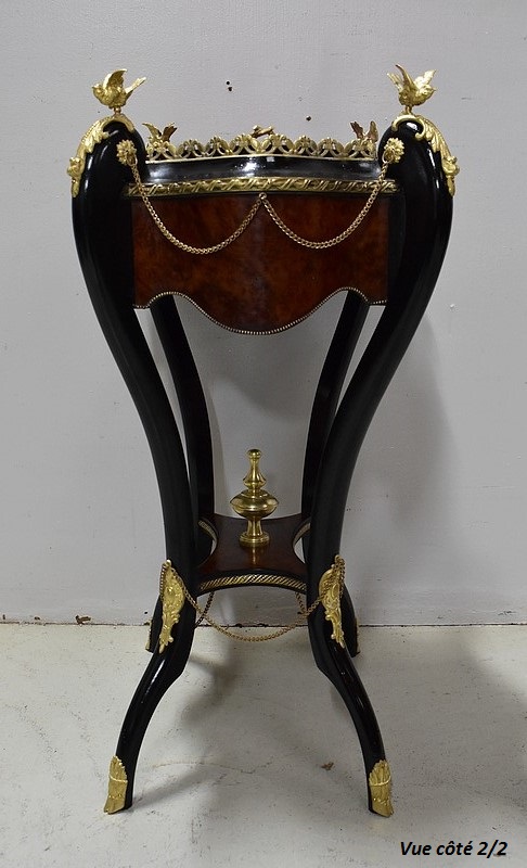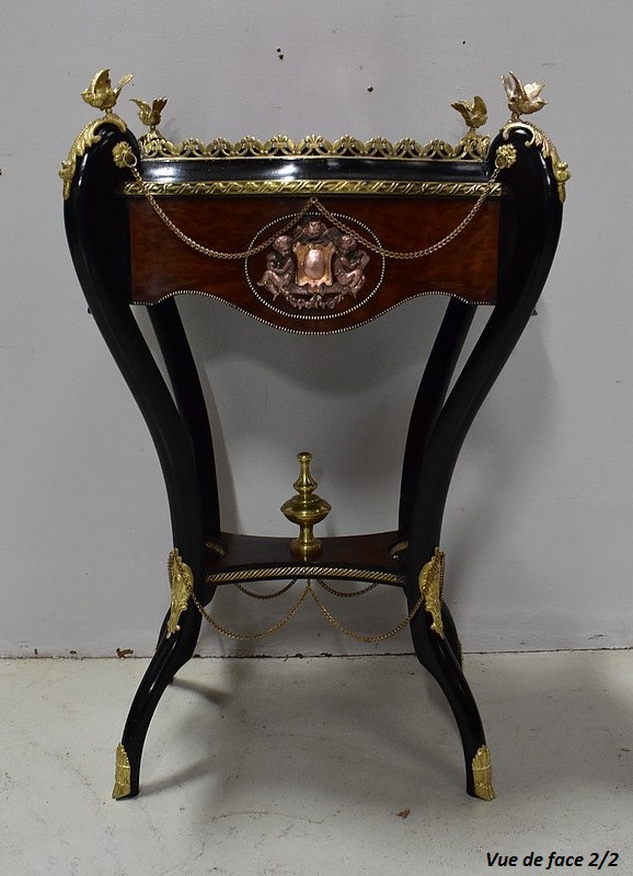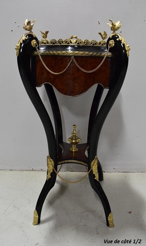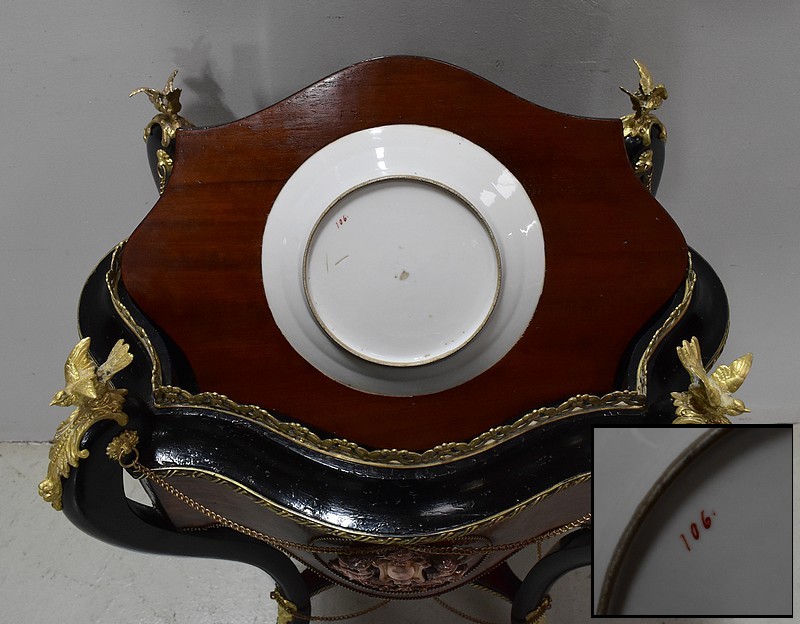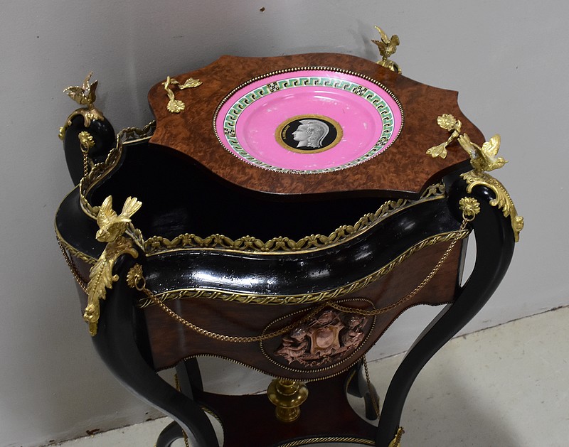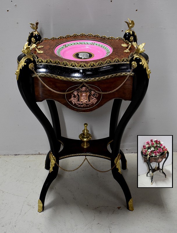 Jardinière à forme Mouvementée, ouvrant sur le dessus par un couvercle aux lignes arrondies, en Placage de Ronce de Thuya. Il est monté d’une assiette de Porcelaine à dominante Rose, agrémentée au centre un profil de soldat Antique, et sur son pourtour d’une frise colorée. Deux poignées en Bronze découpé permettent de retirer ce plateau et de découvrir un compartiment nu, de 12 cm de profondeur, bordé d’une Galerie ajourée. On pourra y installer une plante, un rosier, ou d’autres objets plus inattendus, comme des Bijoux ou des fruits, si l’on choisi de détourner cette Jardinière de sa fonction initiale.