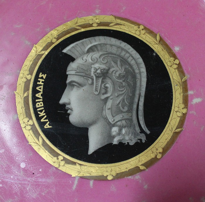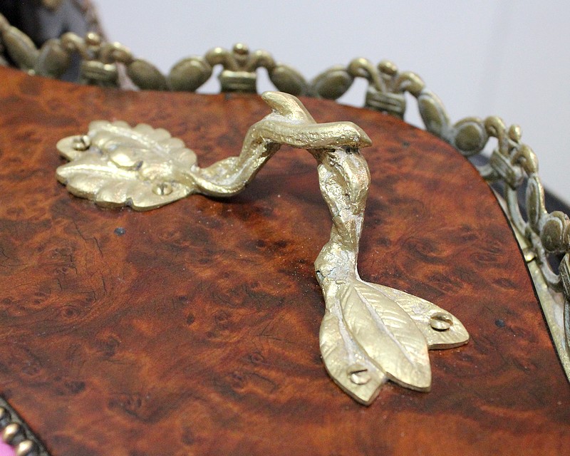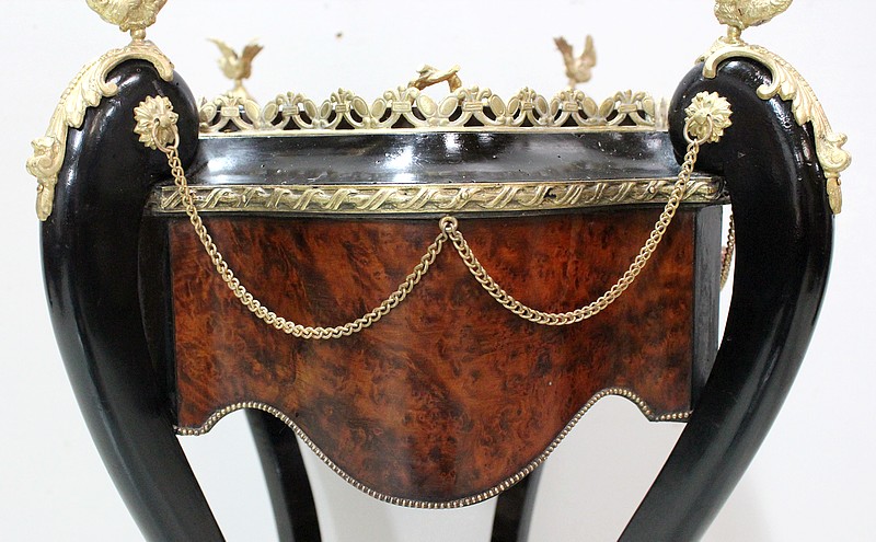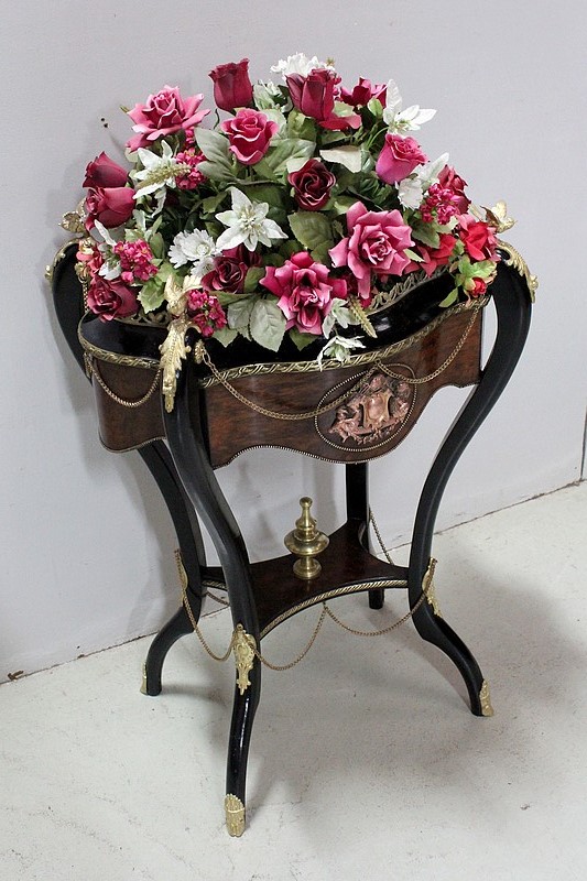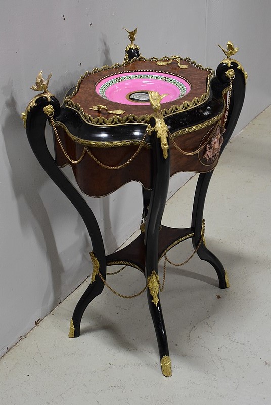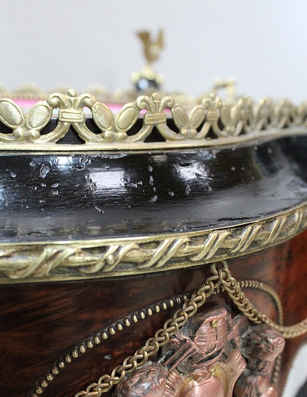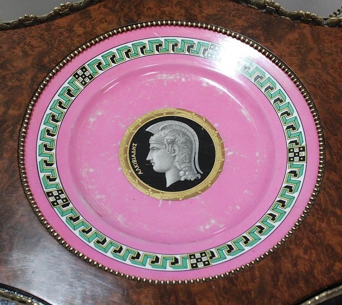 Jardinière à forme Mouvementée, ouvrant sur le dessus par un couvercle aux lignes arrondies, en Placage de Ronce de Thuya. Il est monté d’une assiette de Porcelaine à dominante Rose, agrémentée au centre un profil de soldat Antique, et sur son pourtour d’une frise colorée. Deux poignées en Bronze découpé permettent de retirer ce plateau et de découvrir un compartiment nu, de 12 cm de profondeur, bordé d’une Galerie ajourée. On pourra y installer une plante, un rosier, ou d’autres objets plus inattendus, comme des Bijoux ou des fruits, si l’on choisi de détourner cette Jardinière de sa fonction initiale.
