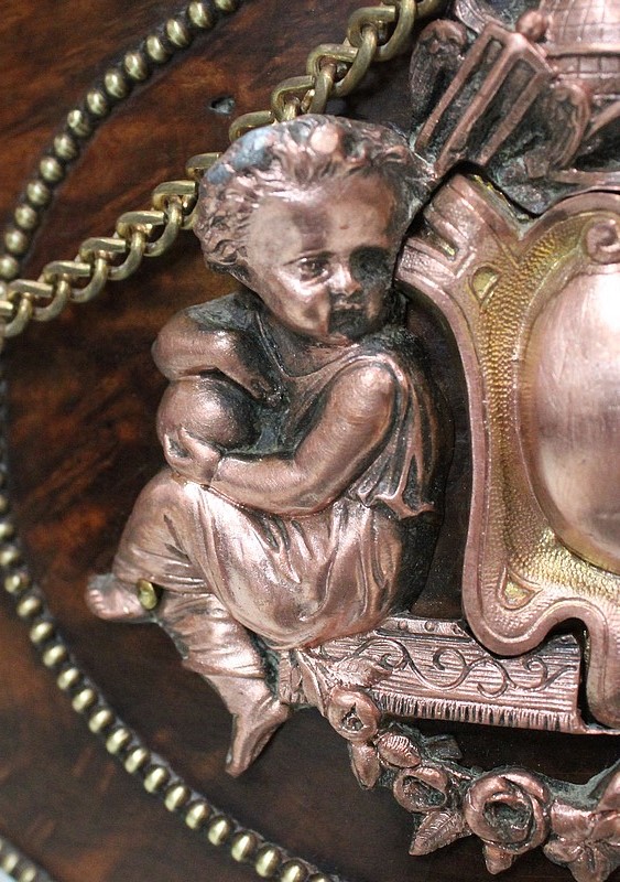 Sa ceinture aux quatre côtés galbés est ornée en façade avant et arrière d’une scène de Putti adossés à un Blason, encerclée d’une frise perlée.