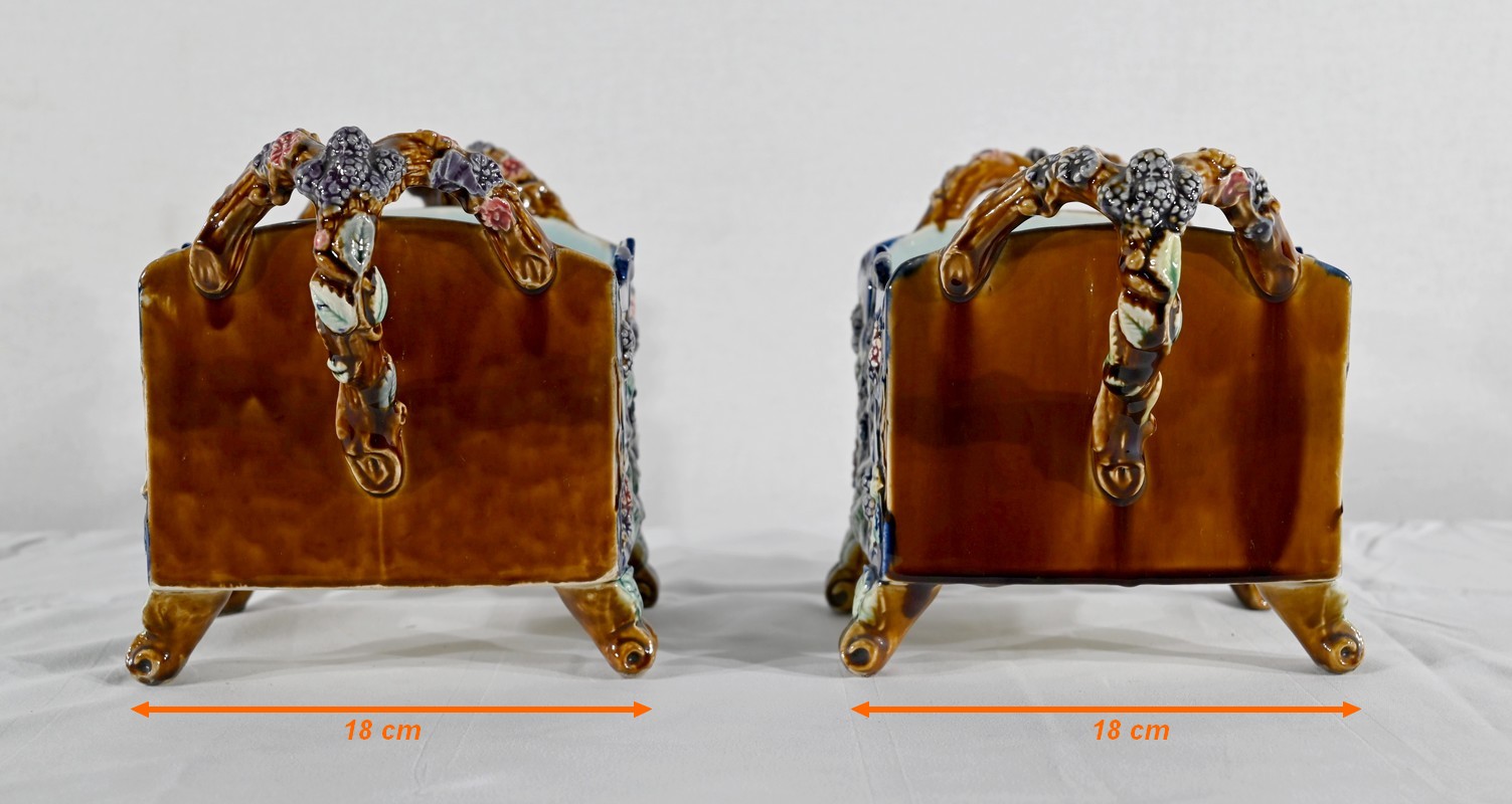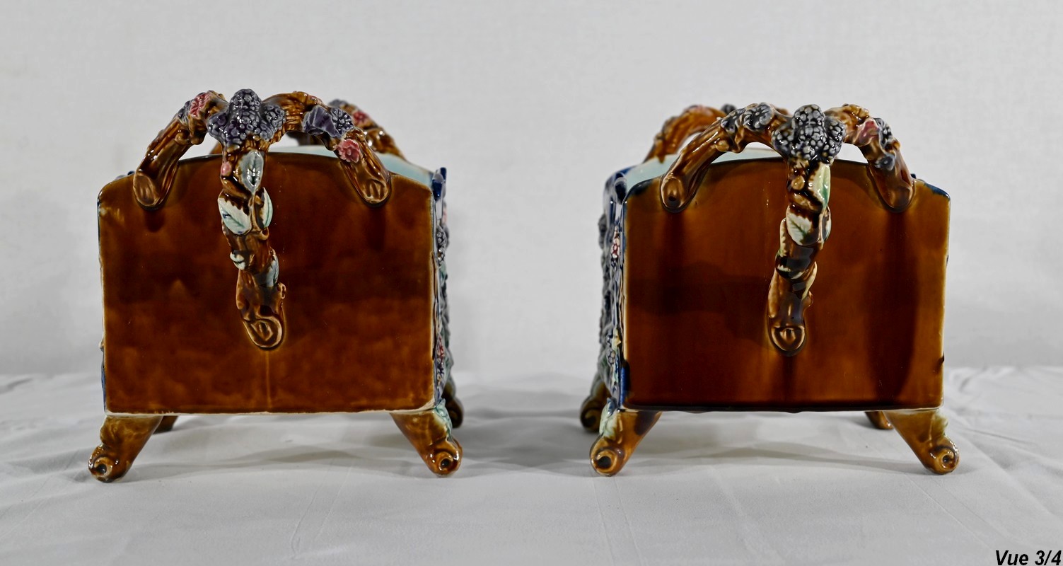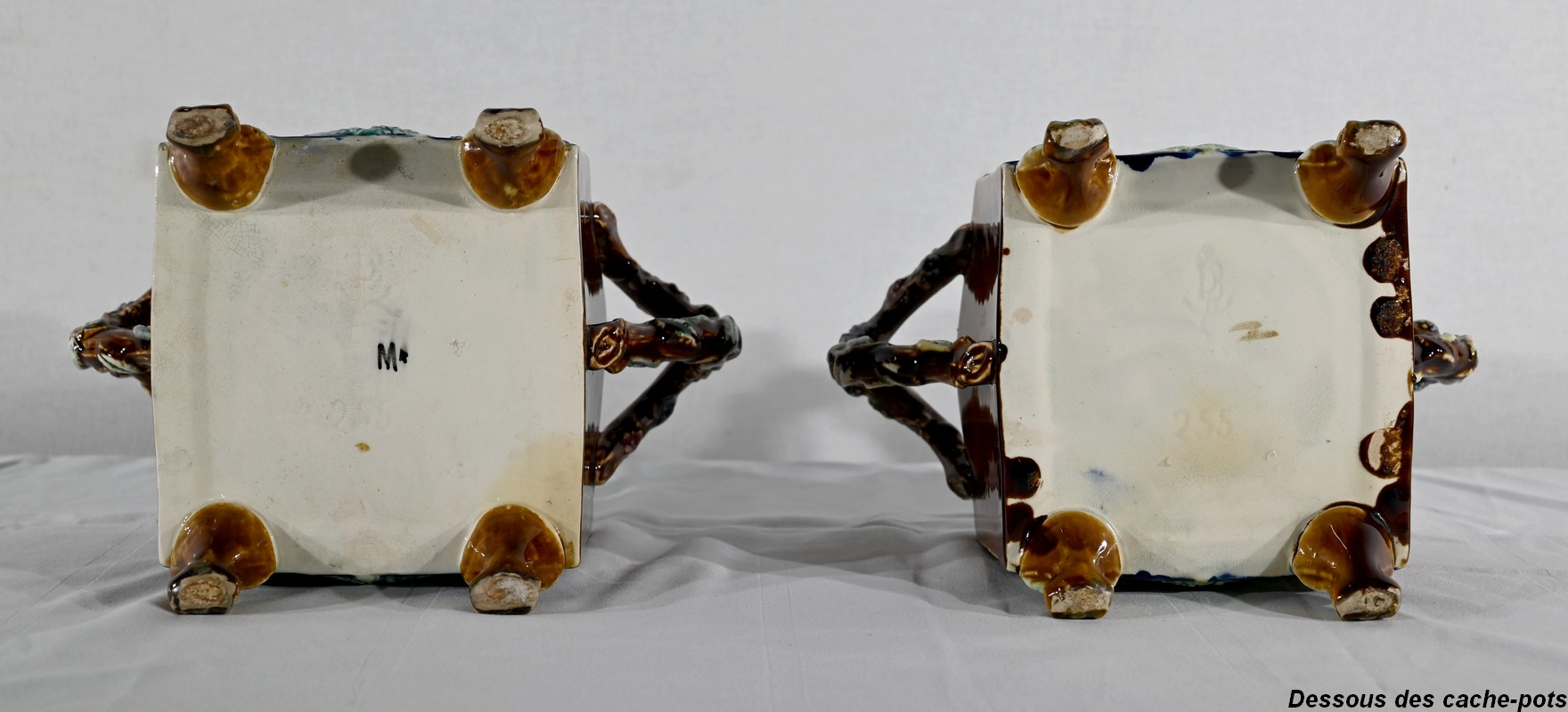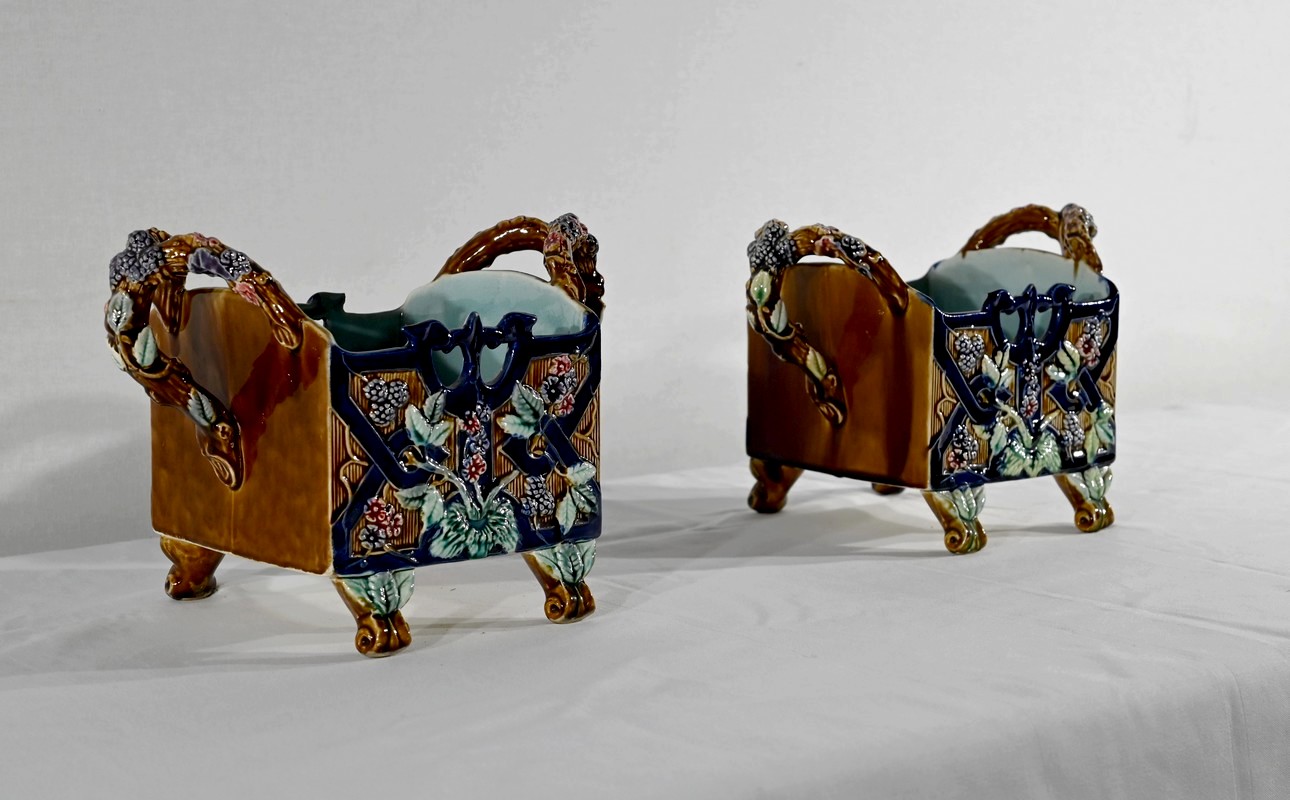 Paire de cache-pots carrés, en pâte d’Argile délayée dite ’’Barbotine’’, du faïencier Belge Gustave De Bruyn (1838-1916) dont le blason est gravé sous le fond de chaque article.