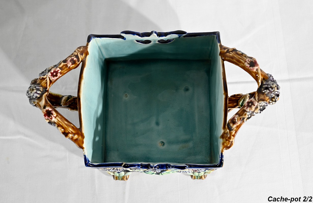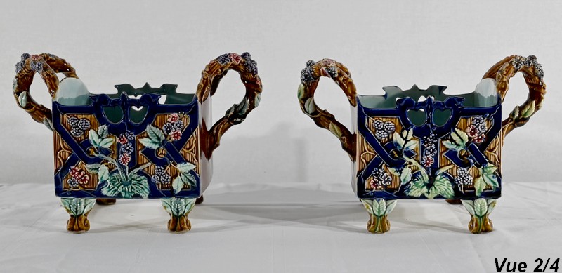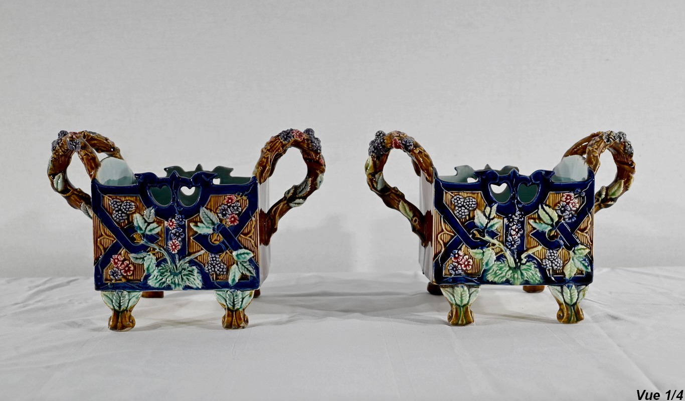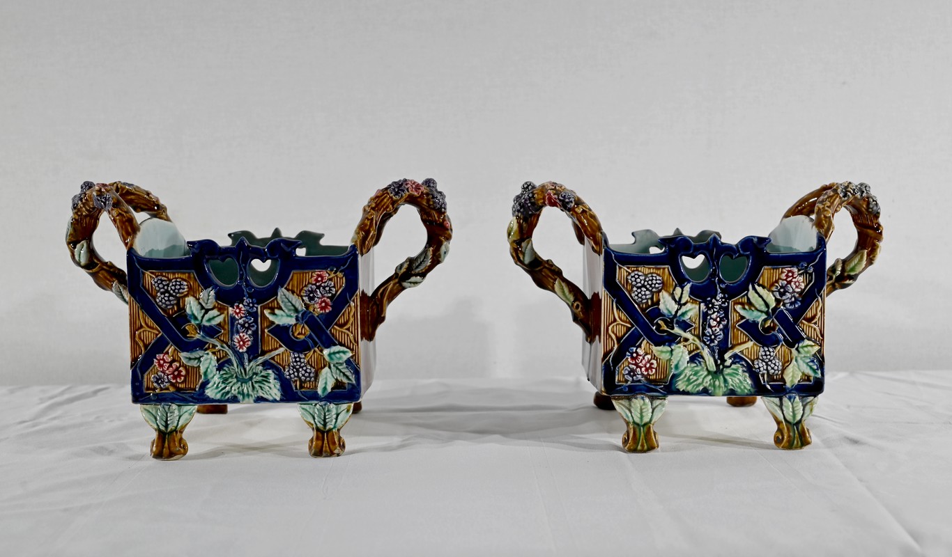 Paire de cache-pots carrés, en pâte d’Argile délayée dite ’’Barbotine’’, du faïencier Belge Gustave De Bruyn (1838-1916) dont le blason est gravé sous le fond de chaque article.