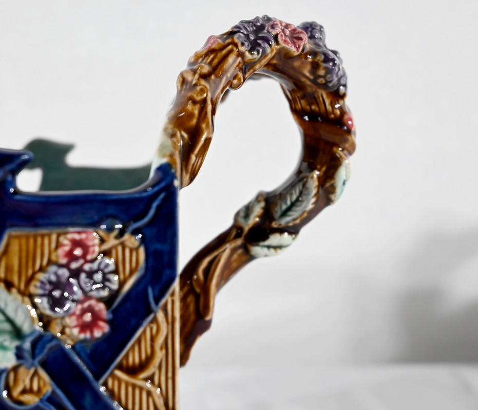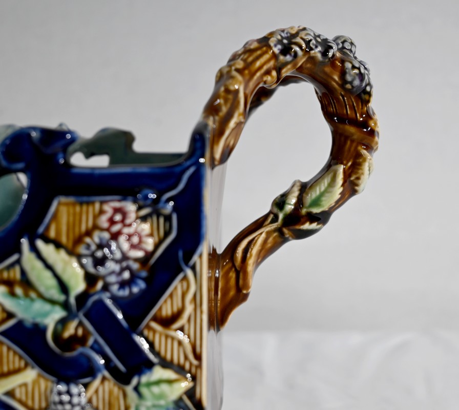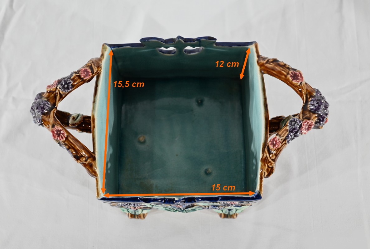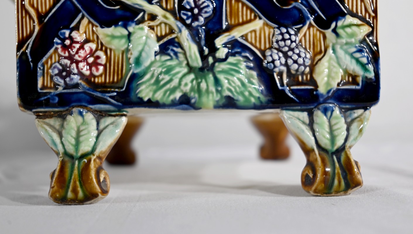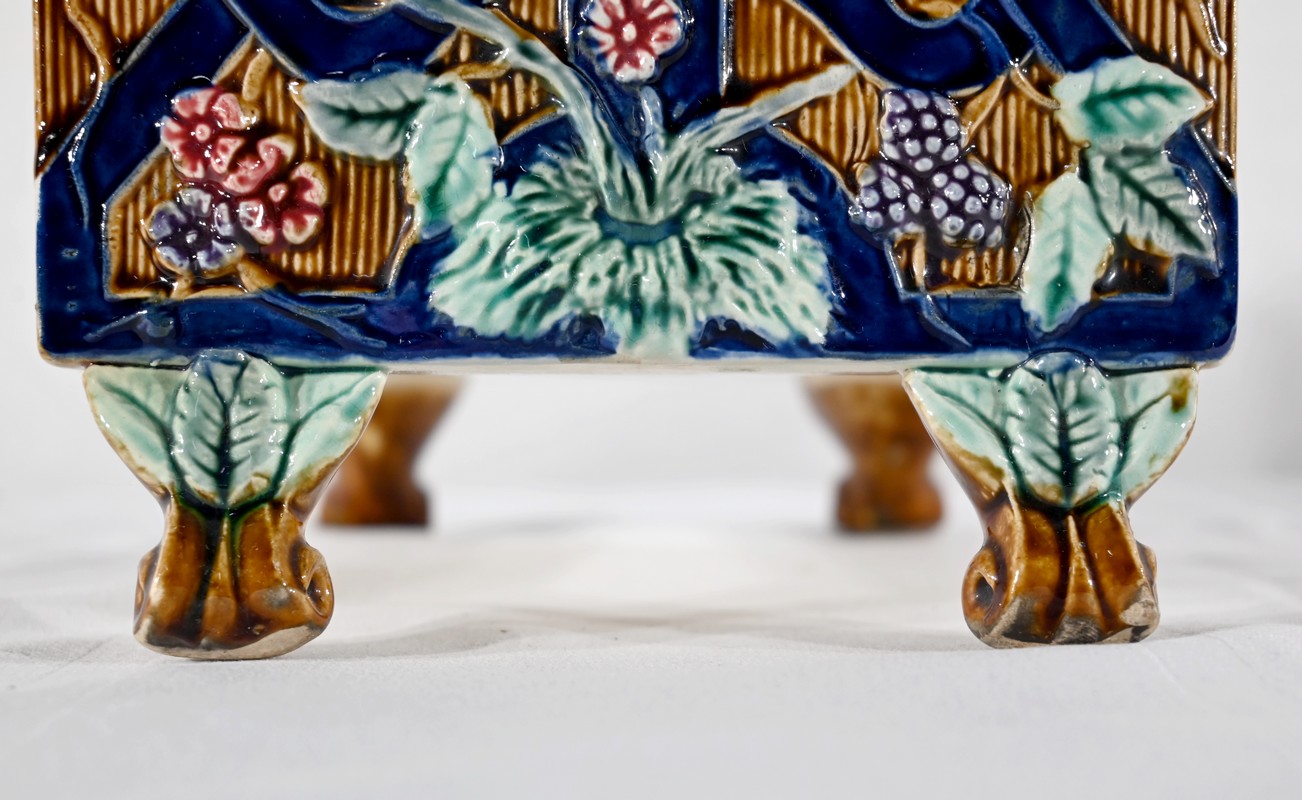 Paire de cache-pots carrés, en pâte d’Argile délayée dite ’’Barbotine’’, du faïencier Belge Gustave De Bruyn (1838-1916) dont le blason est gravé sous le fond de chaque article.