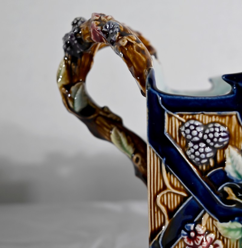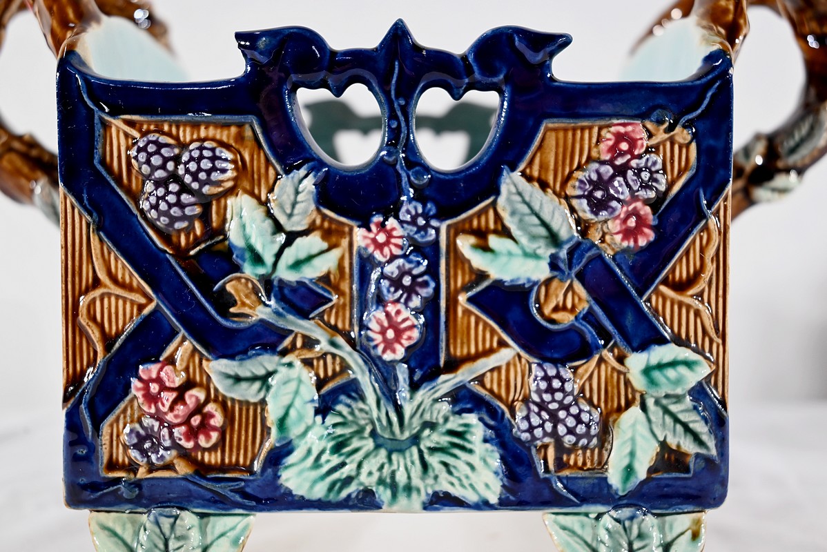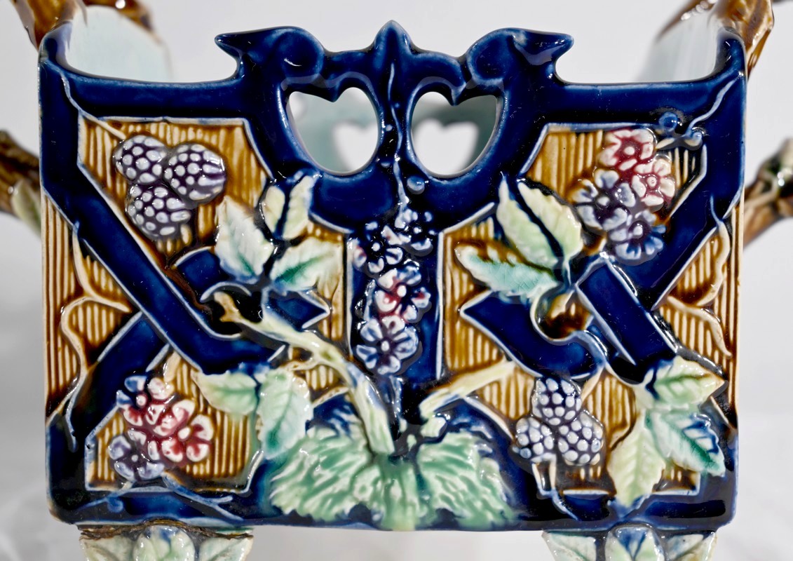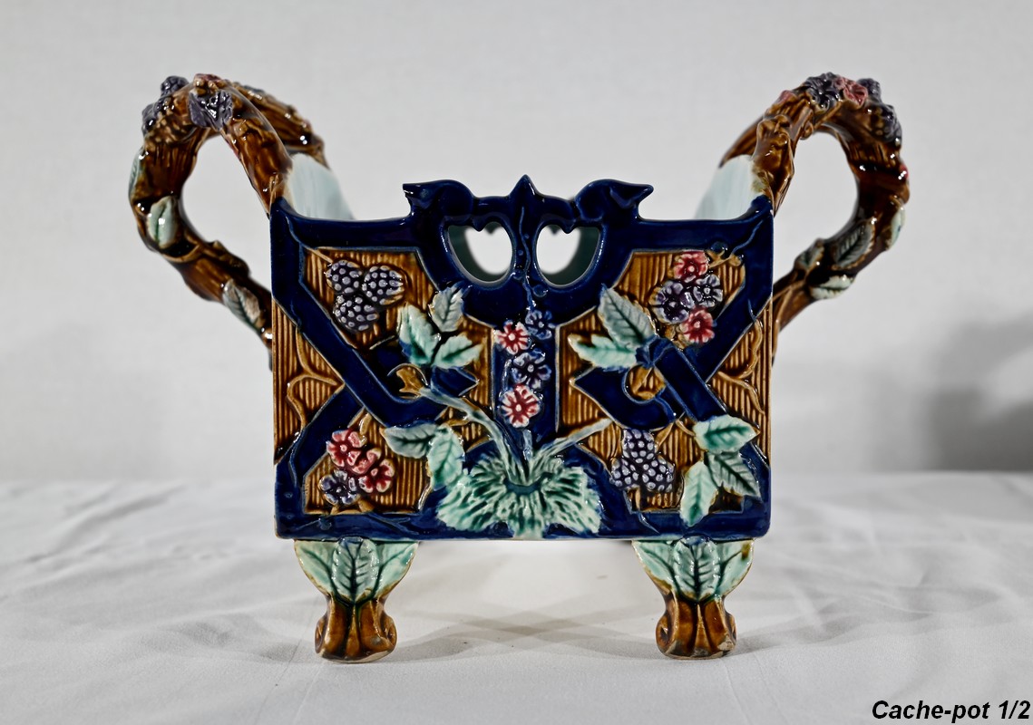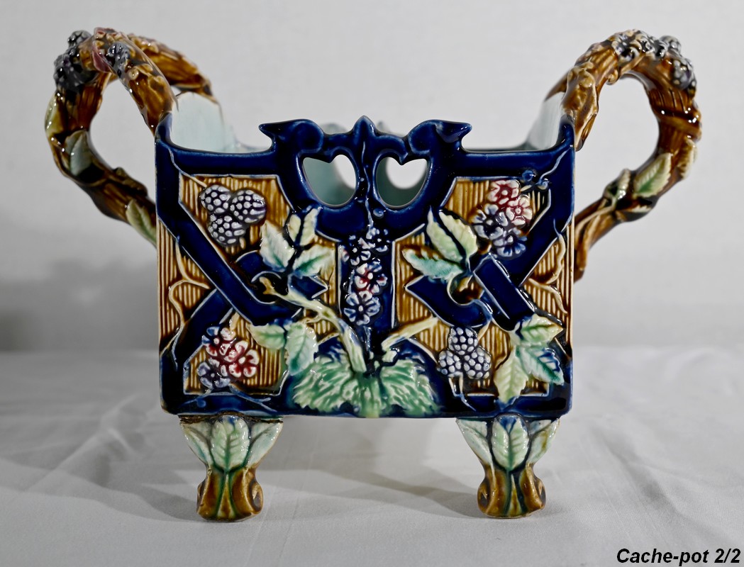 Sorties des fours de la manufacture Fives Lille, ces cache-pots arborent un décor identique, sur la panse et les anses, de mûres, de fleurs et de feuilles dans des tons pastel et marron. Chacun repose sur quatre petits pieds escargots dans le même esprit.