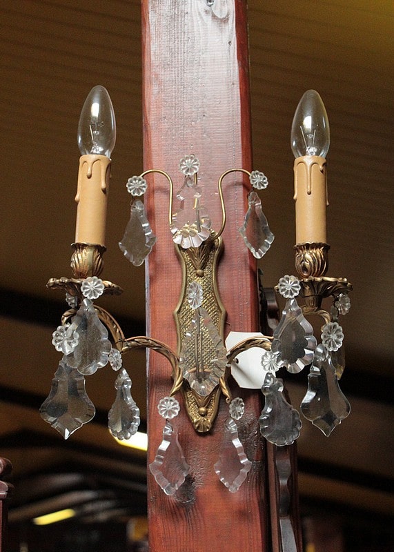 Paire d’appliques en bronze avec pampilles de cristal électrifiées, à 2 branches.