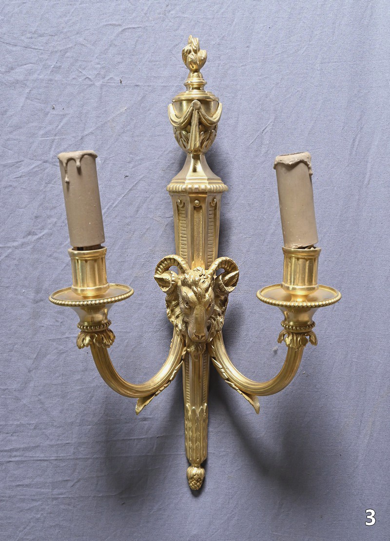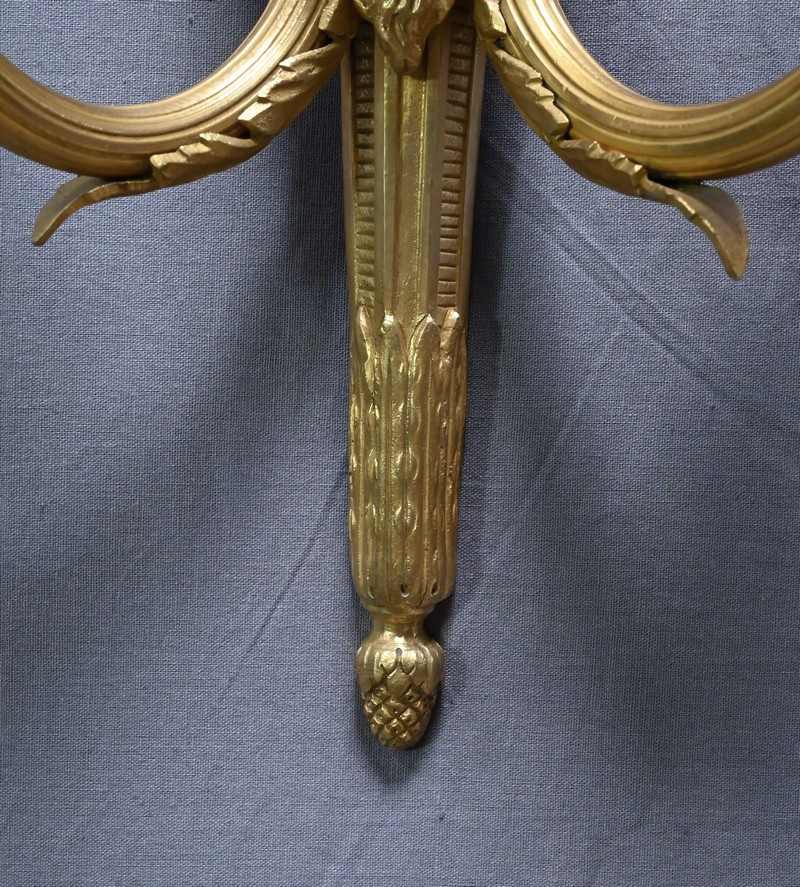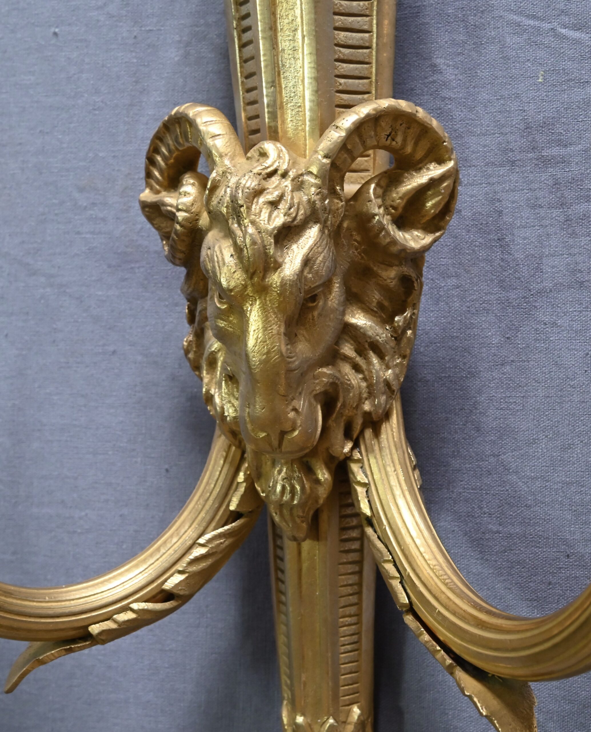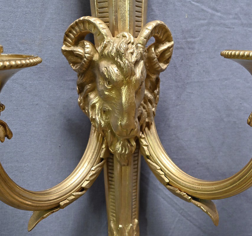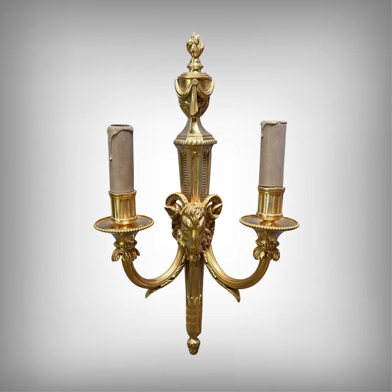 Chacune de ces appliques figurent des détails décoratifs saisissants : Les bougeoirs sont perlés et soulignés de rinceaux délicats, au centre trône une superbe tête de bélier, symbole de force et de raffinement. En haut de chaque applique, une urne stylisée avec flambeau, rehaussée d’un drapé sculpté, ajoute une dimension théâtrale à l’ensemble. Le fût strié se termine par des asperges inversées et une petite pomme de pin. Ces pièces décoratives transcendent la simple fonction d’éclairage : elles apportent une touche de noblesse à tout intérieur, qu’il soit classique ou résolument contemporain.