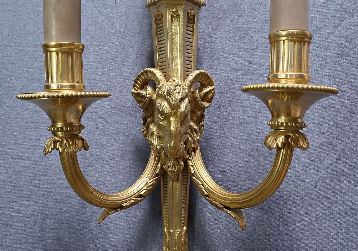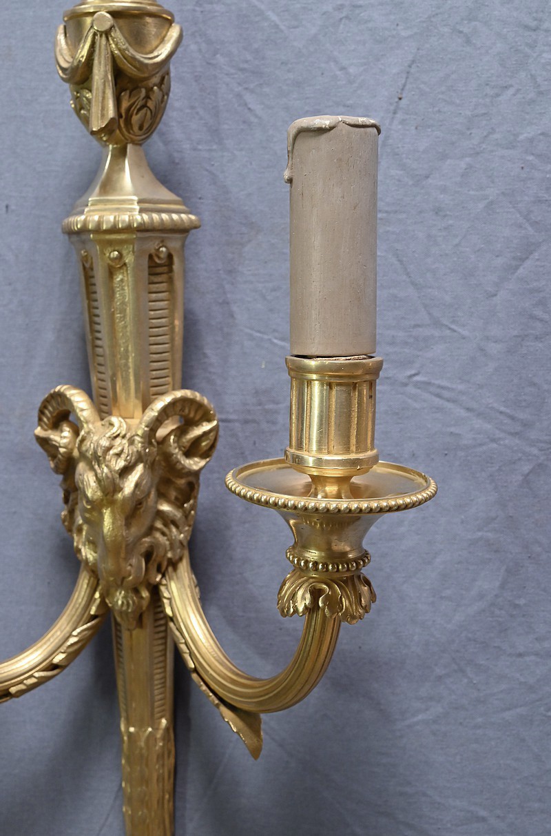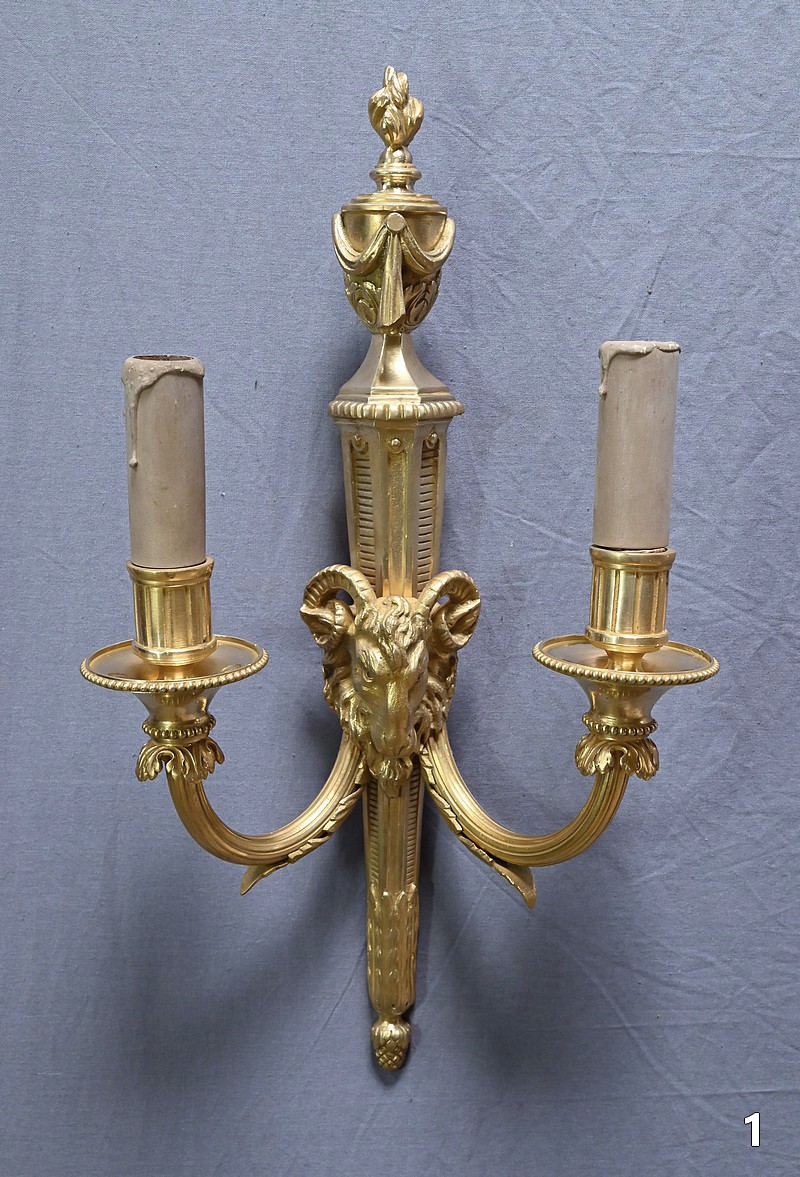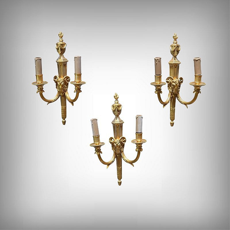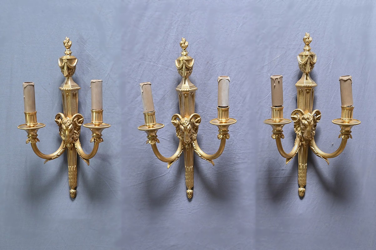 Chacune de ces appliques figurent des détails décoratifs saisissants : Les bougeoirs sont perlés et soulignés de rinceaux délicats, au centre trône une superbe tête de bélier, symbole de force et de raffinement. En haut de chaque applique, une urne stylisée avec flambeau, rehaussée d’un drapé sculpté, ajoute une dimension théâtrale à l’ensemble. Le fût strié se termine par des asperges inversées et une petite pomme de pin. Ces pièces décoratives transcendent la simple fonction d’éclairage : elles apportent une touche de noblesse à tout intérieur, qu’il soit classique ou résolument contemporain.