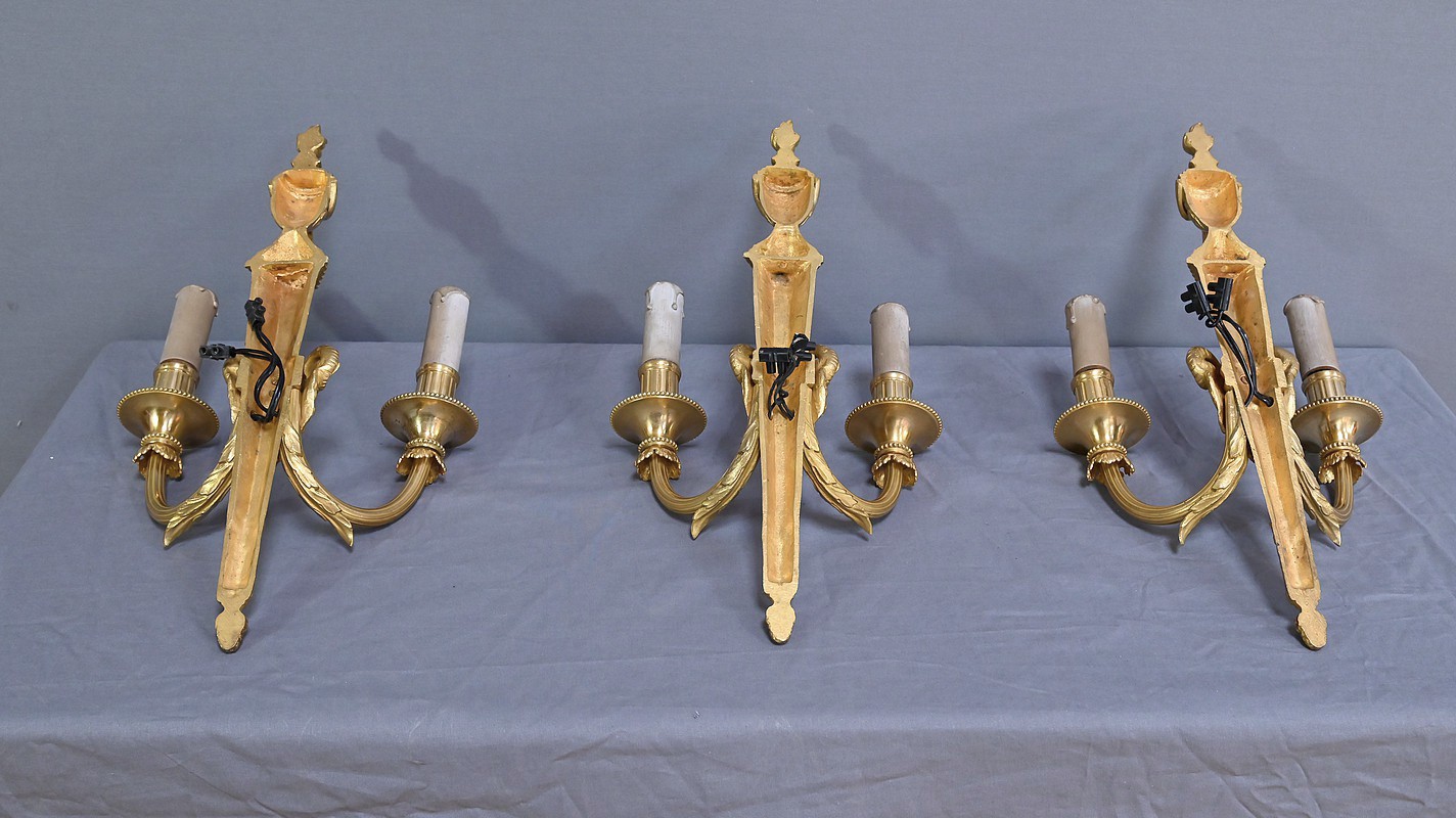 Ce magnifique ensemble de trois appliques murales incarne à la perfection l’élégance du style Louis XVI. Fabriquées au milieu du XIXe siècle, elles sont en bronze doré finement ciselé, révélant le savoir-faire des artisans de l’époque. Chaque applique présente deux bras de lumière, ornés de fausses bougies en bois qui dissimulent avec subtilité le pas de vis des ampoules, pour préserver l’esthétique classique tout en permettant un usage moderne grâce à une électrification réalisée postérieurement.