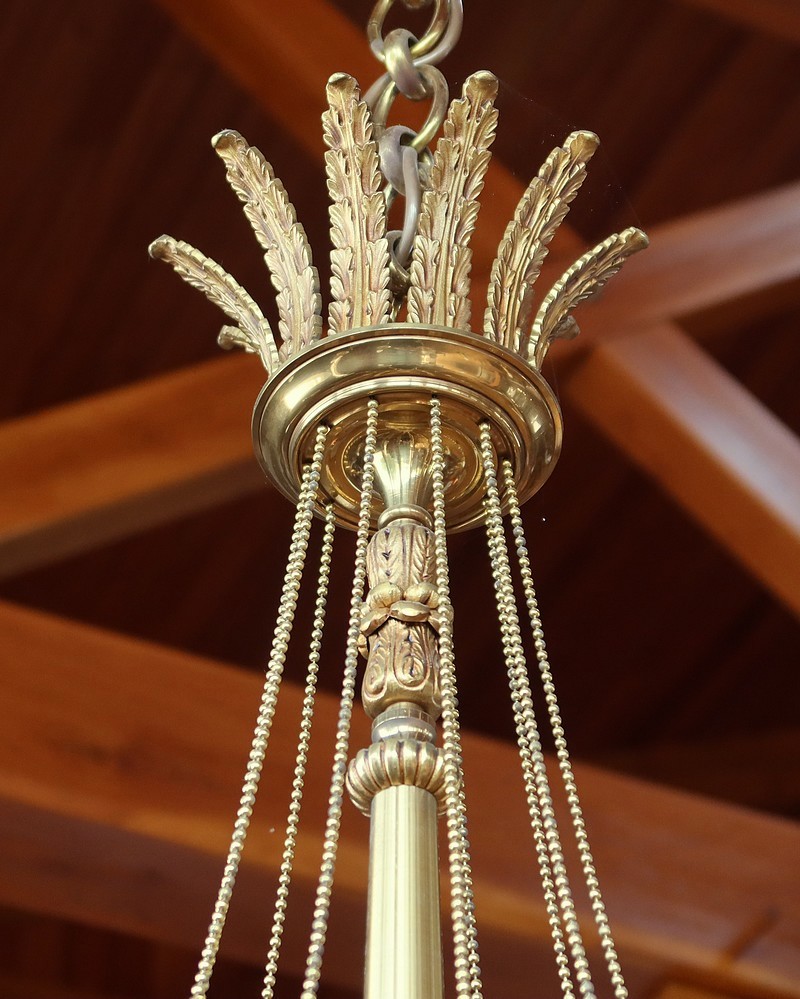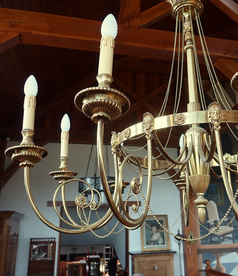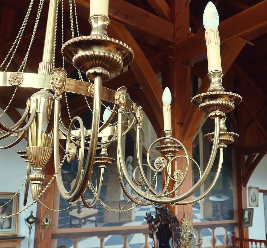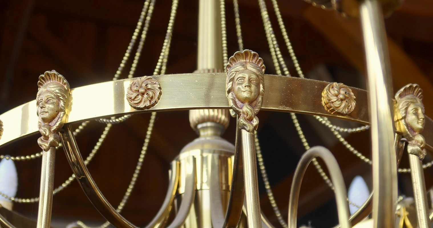 Magnifique ensemble de trois grands lustres identiques, en bronze et laiton, pour demeure prestigieuse.