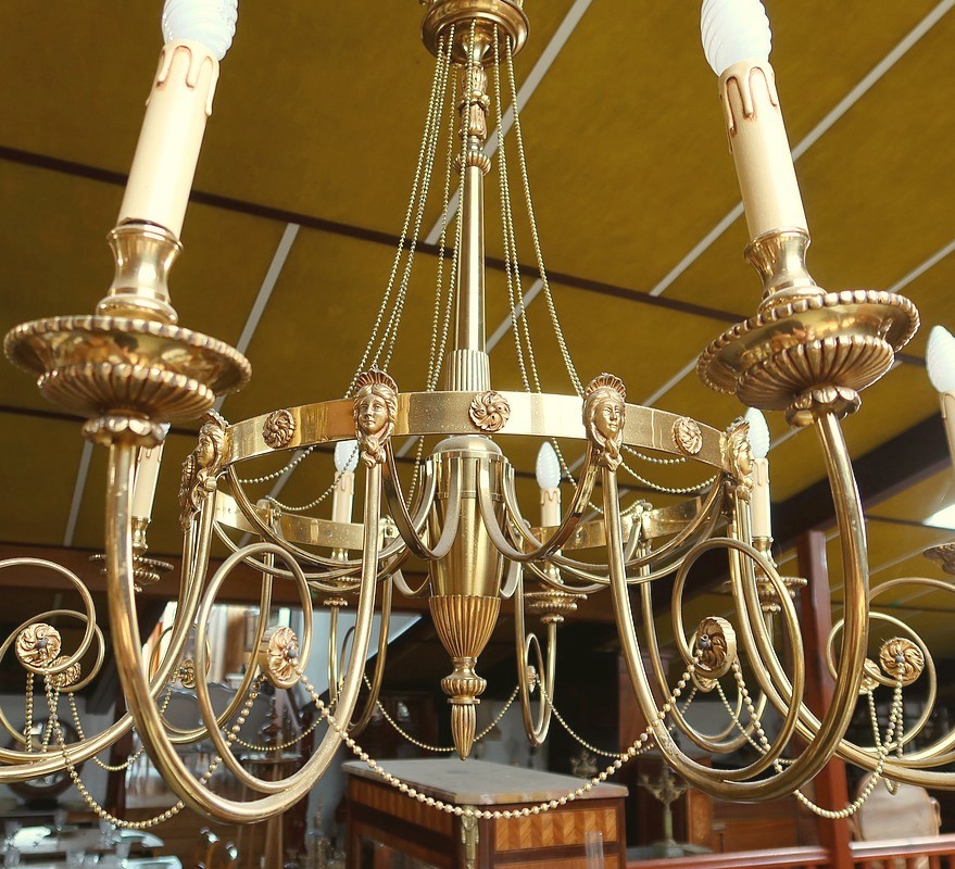 La partie centrale est constituée d’un large cercle orné de visages féminins souriants et séparés par des rosaces. Sous chacun de ces masques s’appuient 10 bras dédoublés en volute, reliés par de fines guirlandes de perles. Les porte-bougies et coupelles sont décorés de motifs ornementaux ciselés alternant feuilles et stries raffinées.