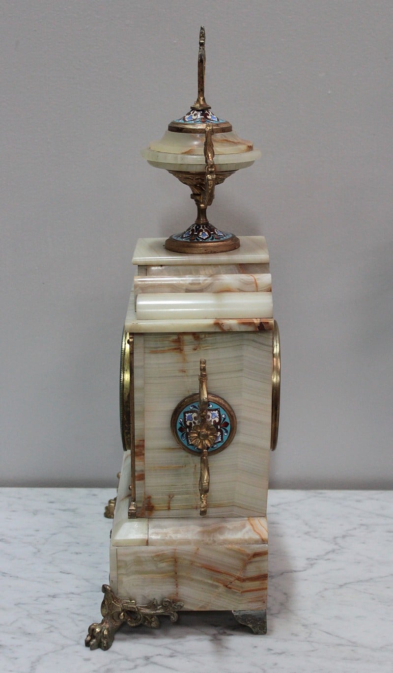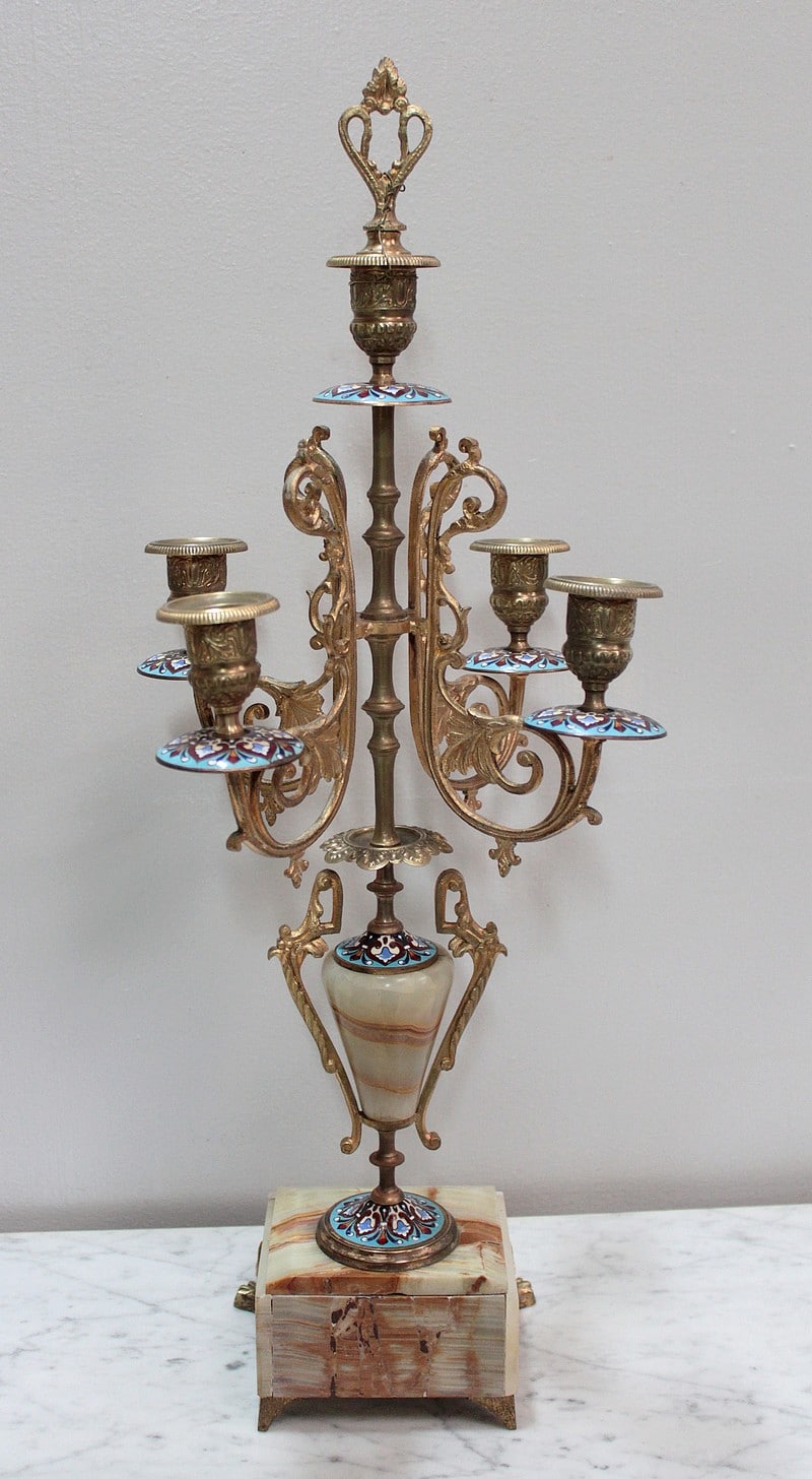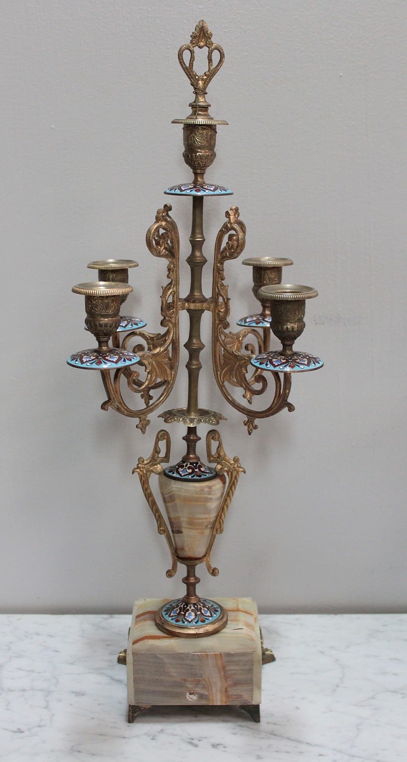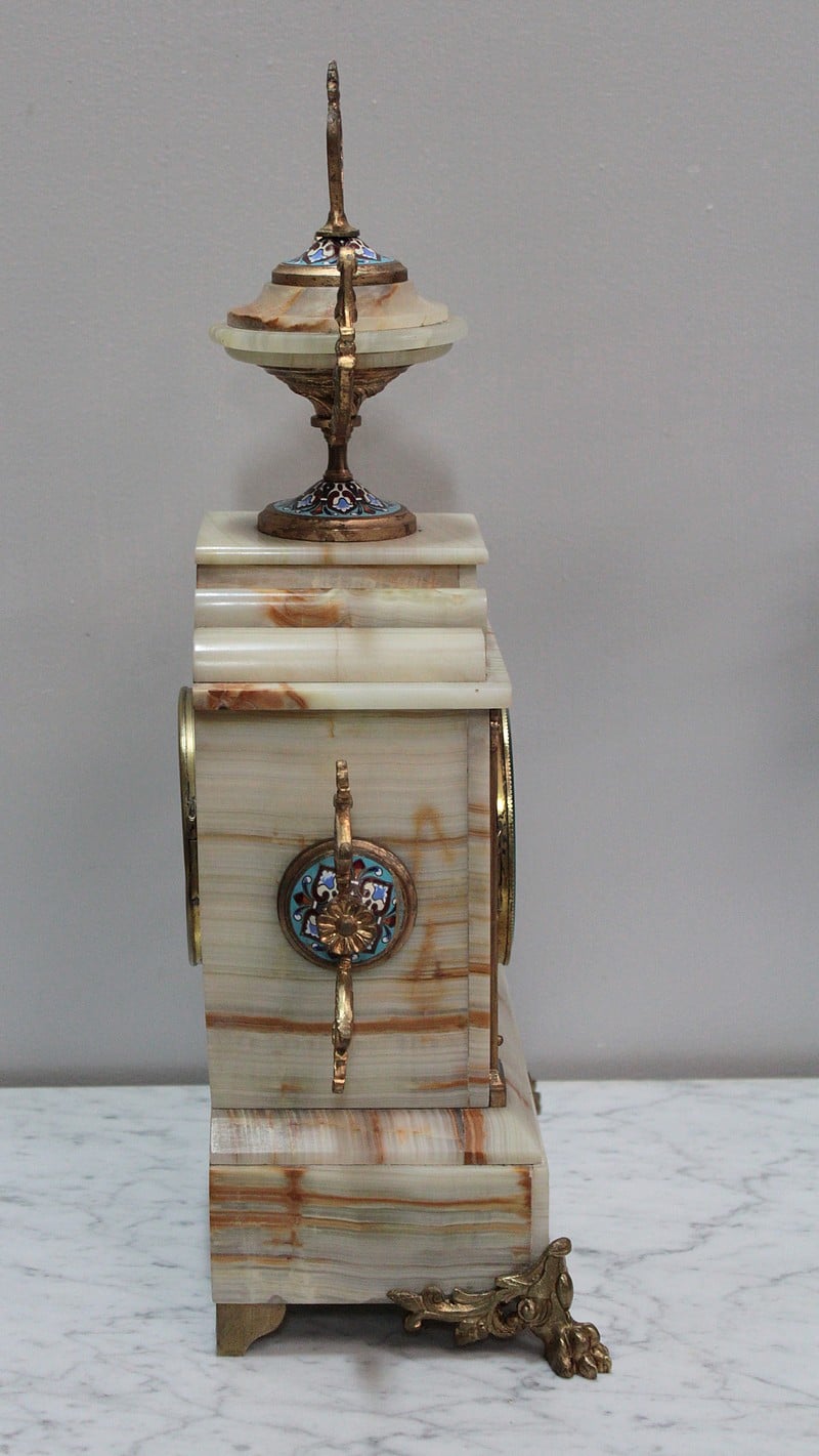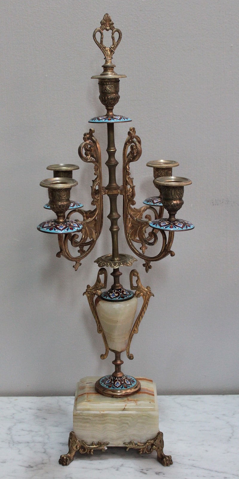 Élégante garniture de cheminée en Onyx couleur crème, bronze et laiton décorée d’émaux et composée d’une pendulette, de ses deux chandeliers assortis à 5 bras de lumière et de leurs éteignoirs respectifs.