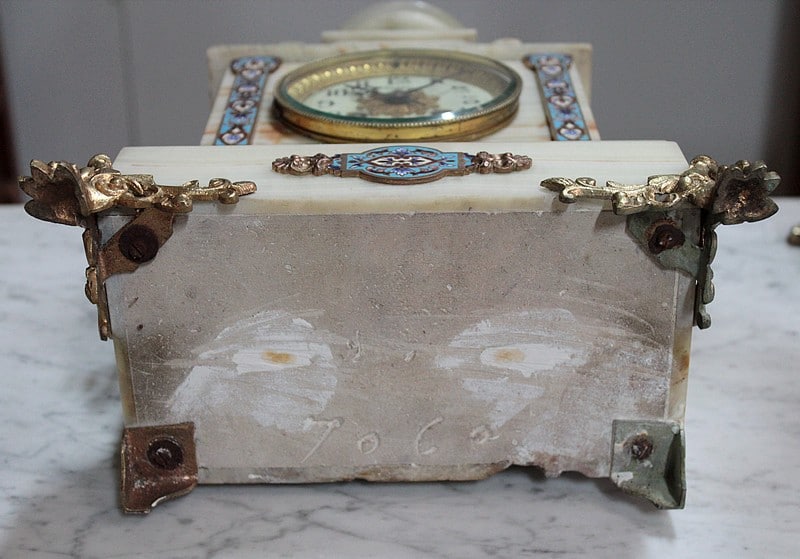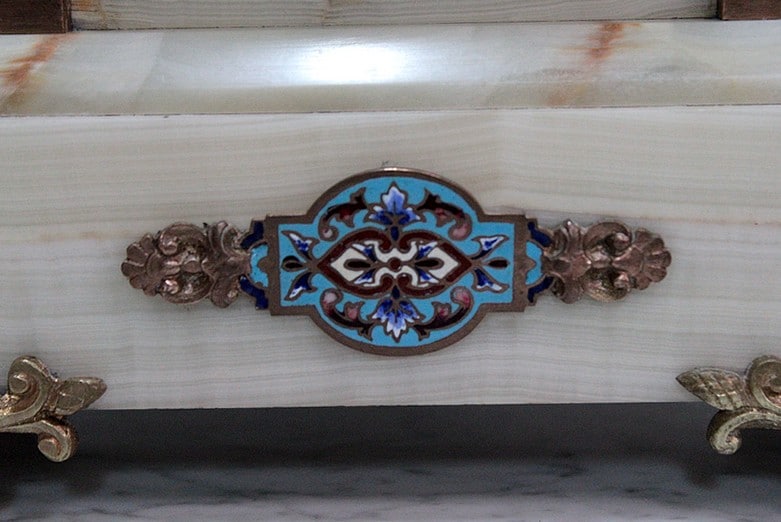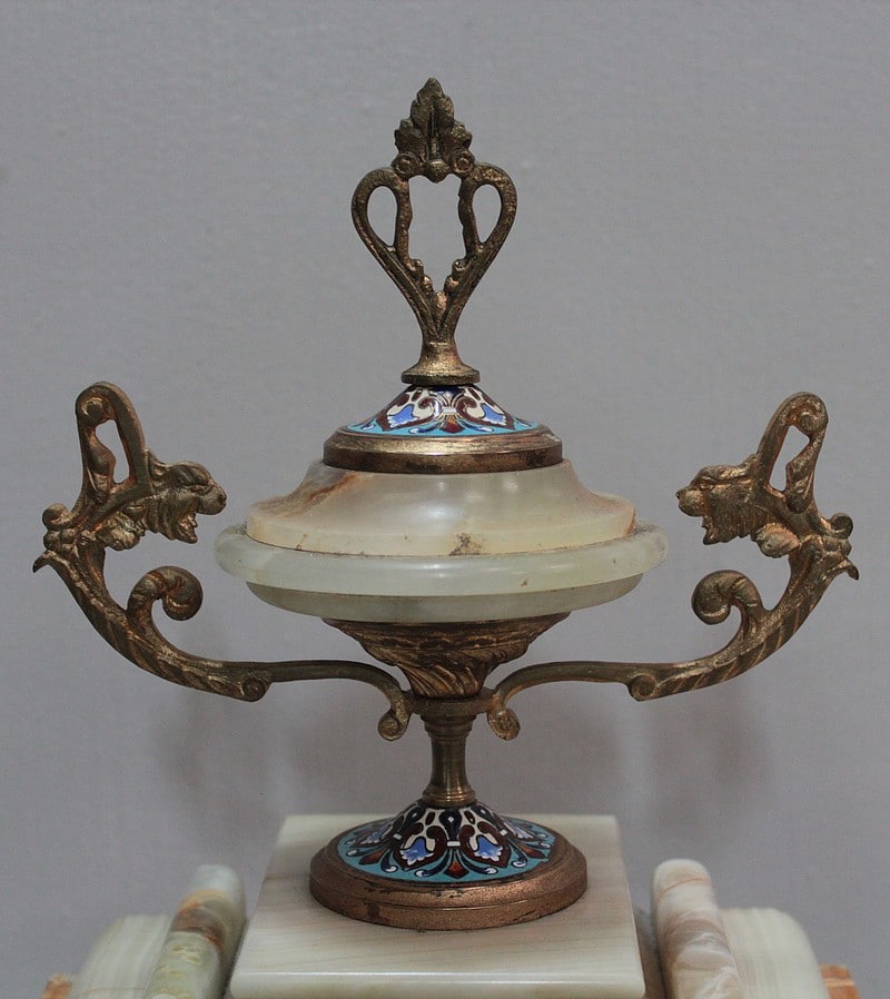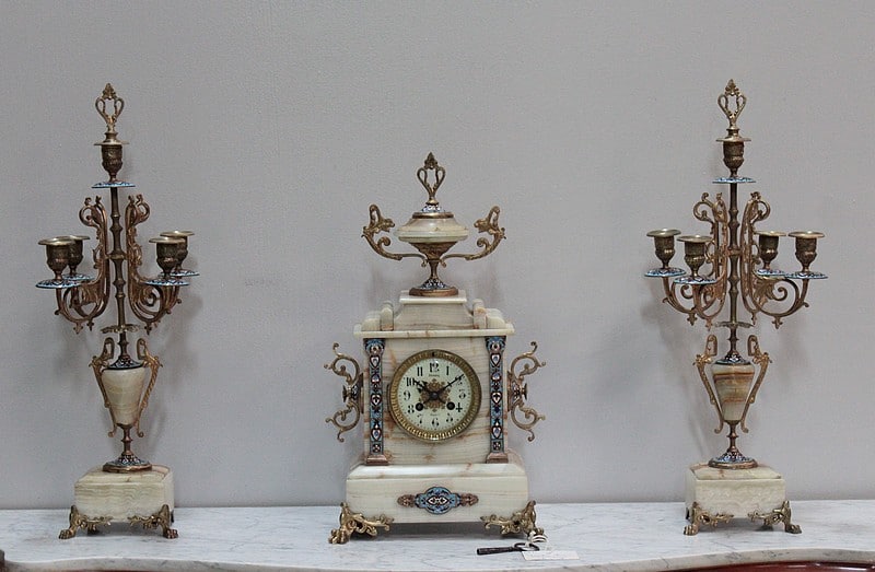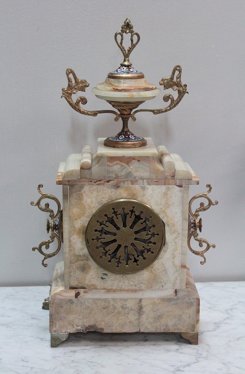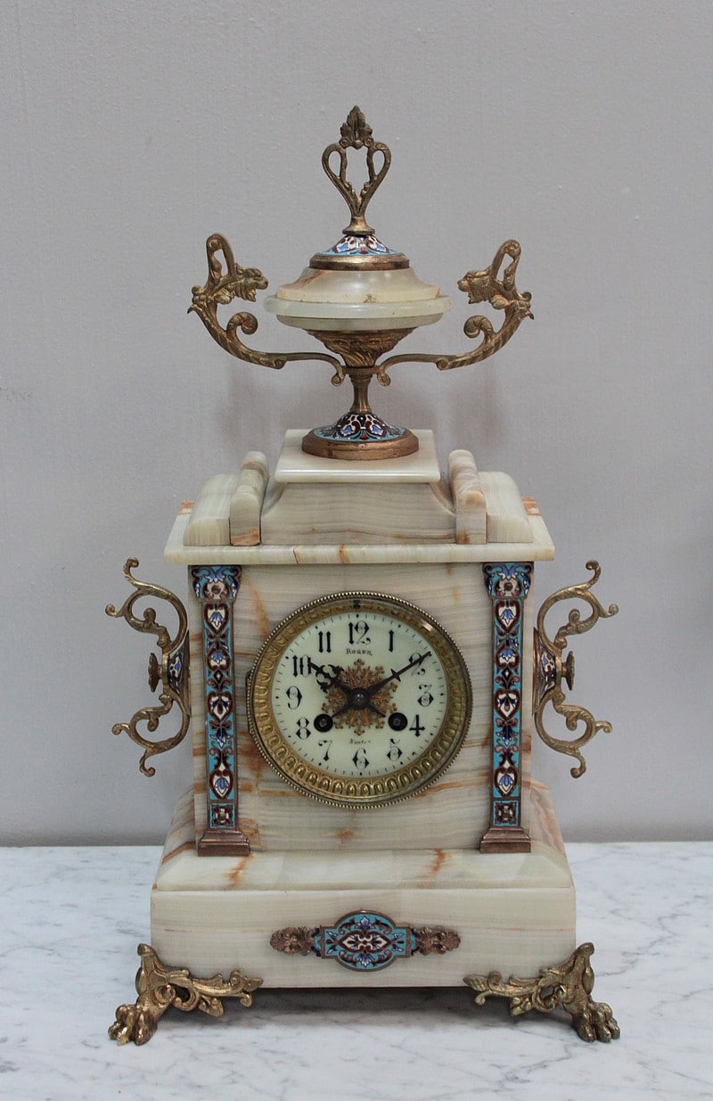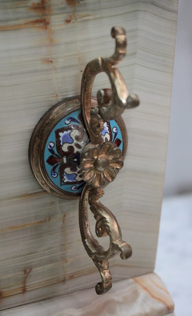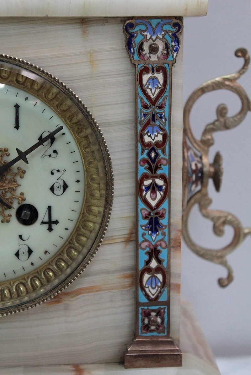 Élégante garniture de cheminée en Onyx couleur crème, bronze et laiton décorée d’émaux et composée d’une pendulette, de ses deux chandeliers assortis à 5 bras de lumière et de leurs éteignoirs respectifs.