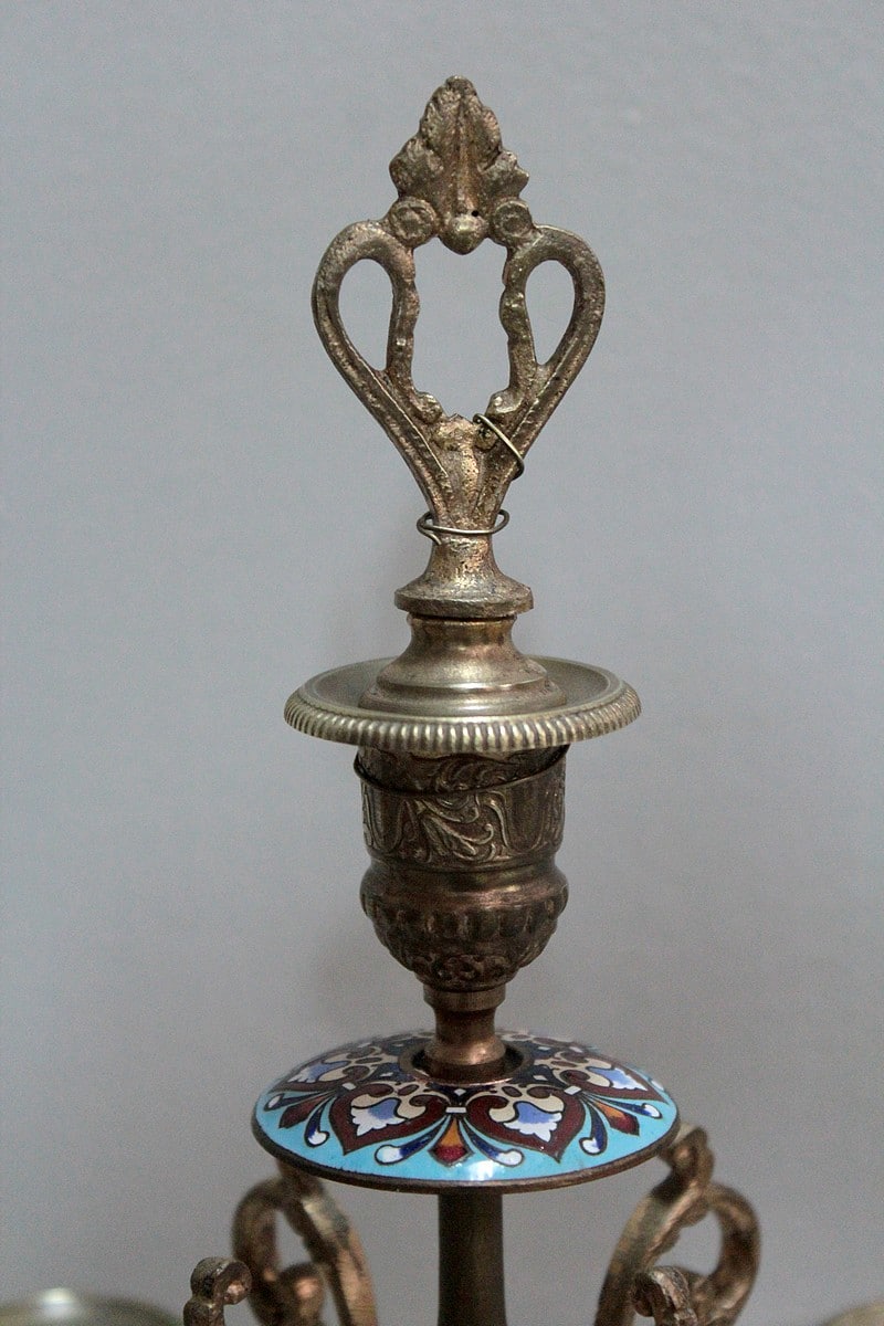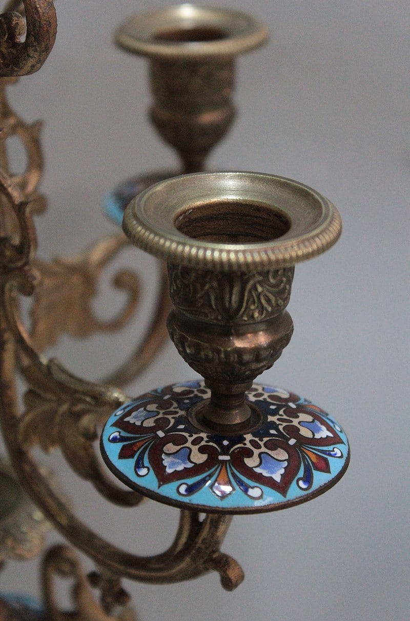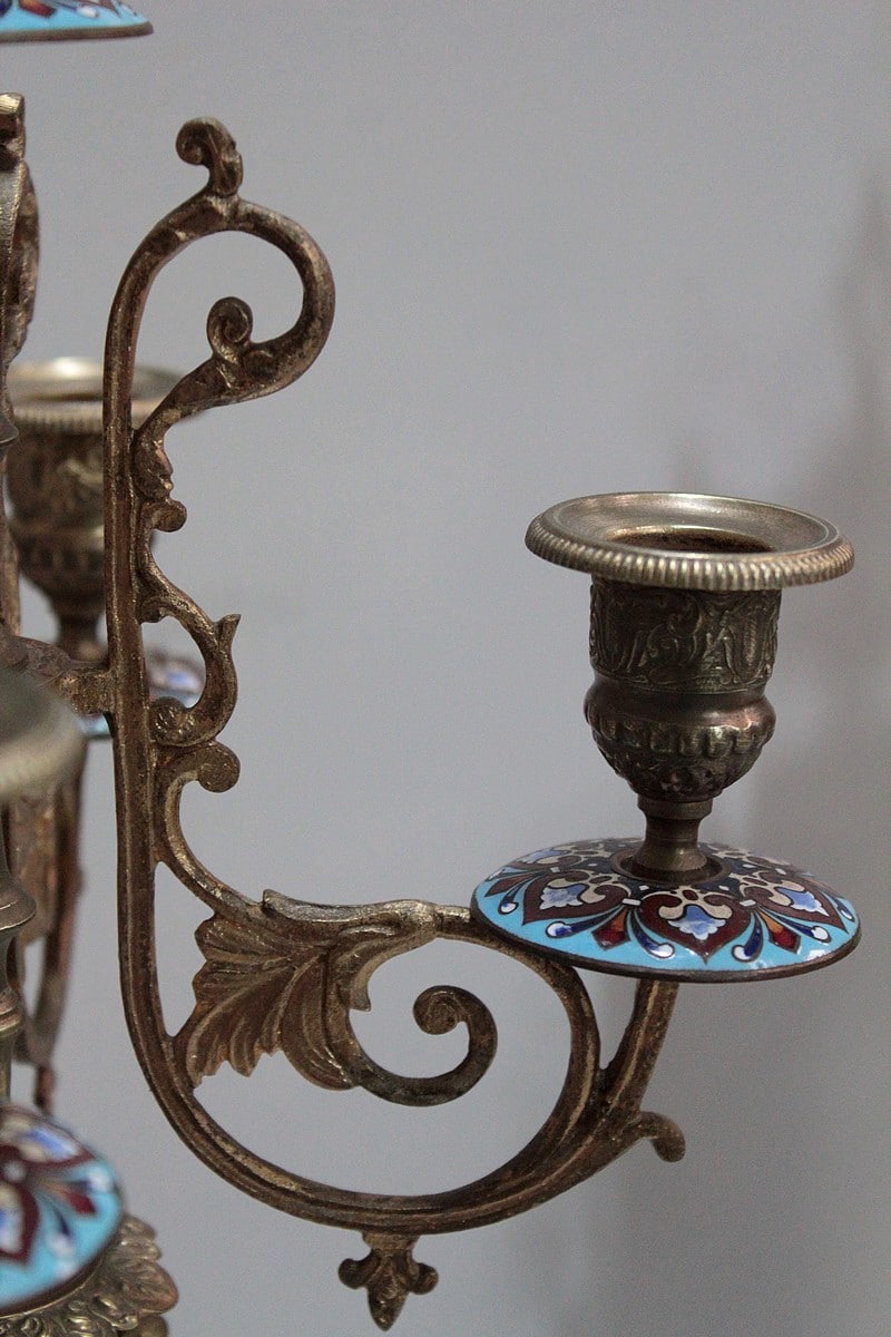 Les chandeliers en forme d’amphore reposent sur un socle carré. Leurs bras de lumière sont ornés de rinceaux aboutissant à des émaux sur la base du bougeoir.