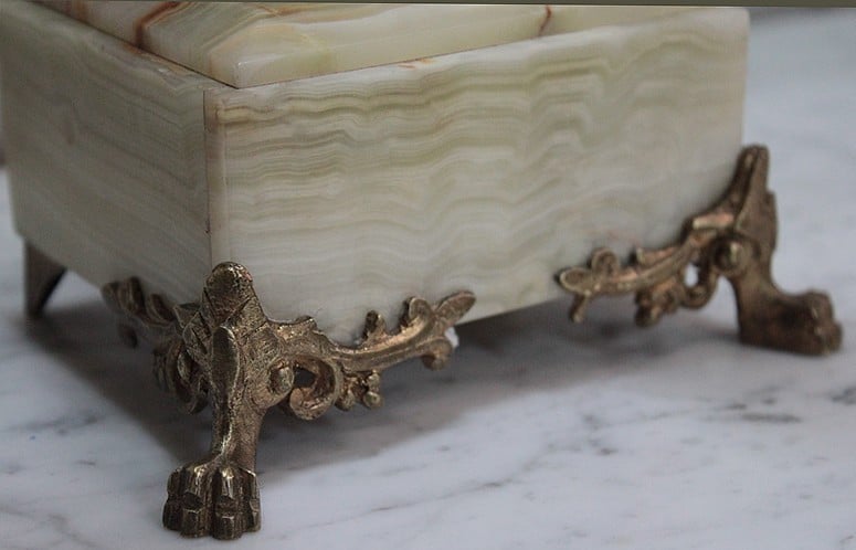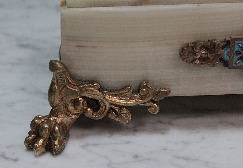 Elle repose sur 4 pieds, ceux de l’avant en forme de griffes et de rinceaux.