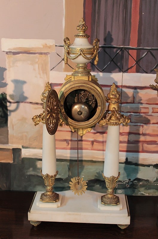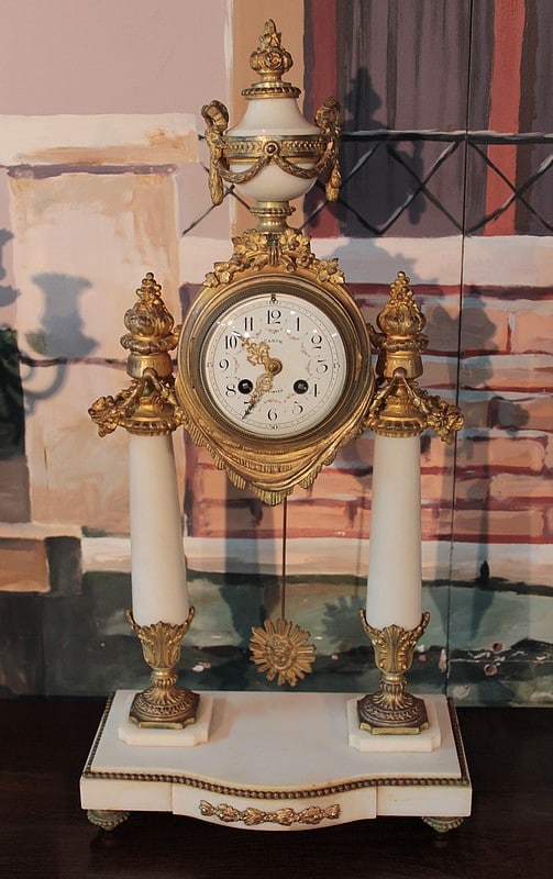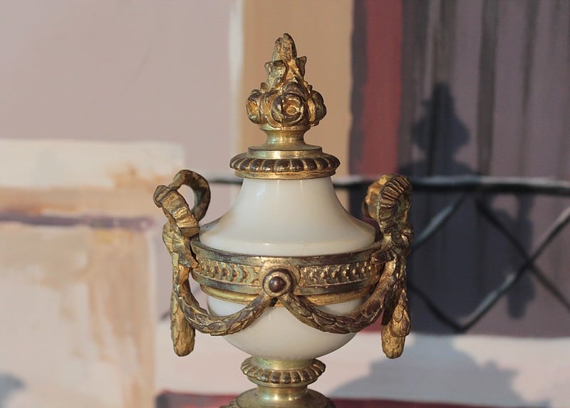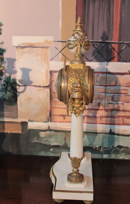 Garniture de cheminée Louis XVI en marbre blanc et bronze composée d’une pendule portique et de deux candélabres.