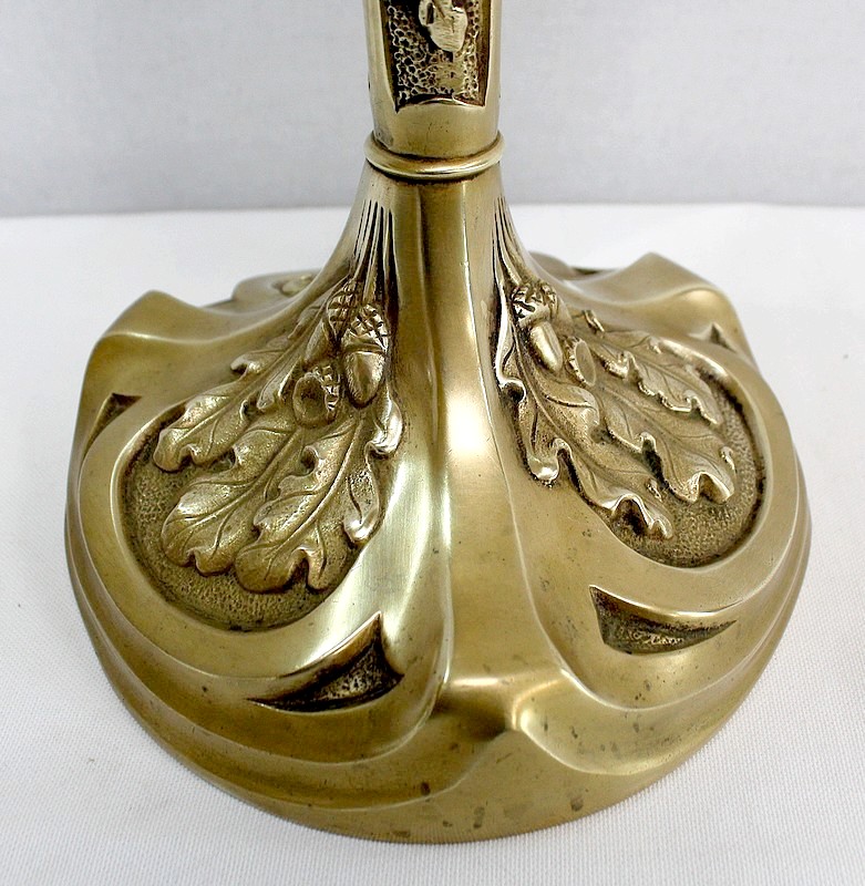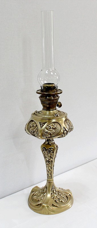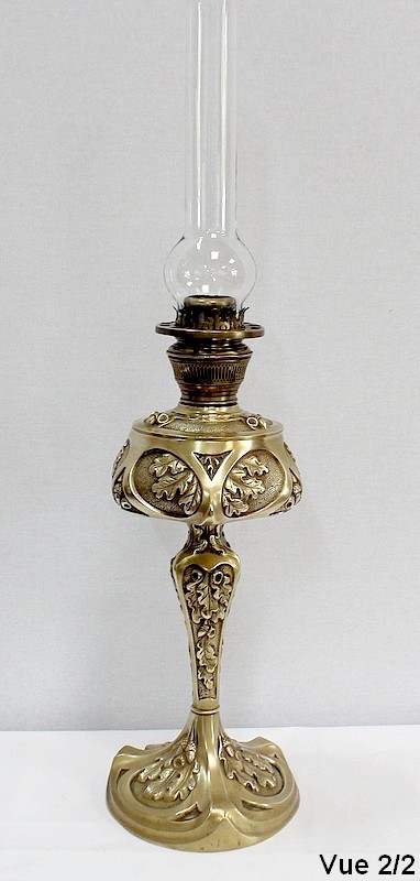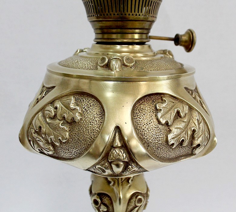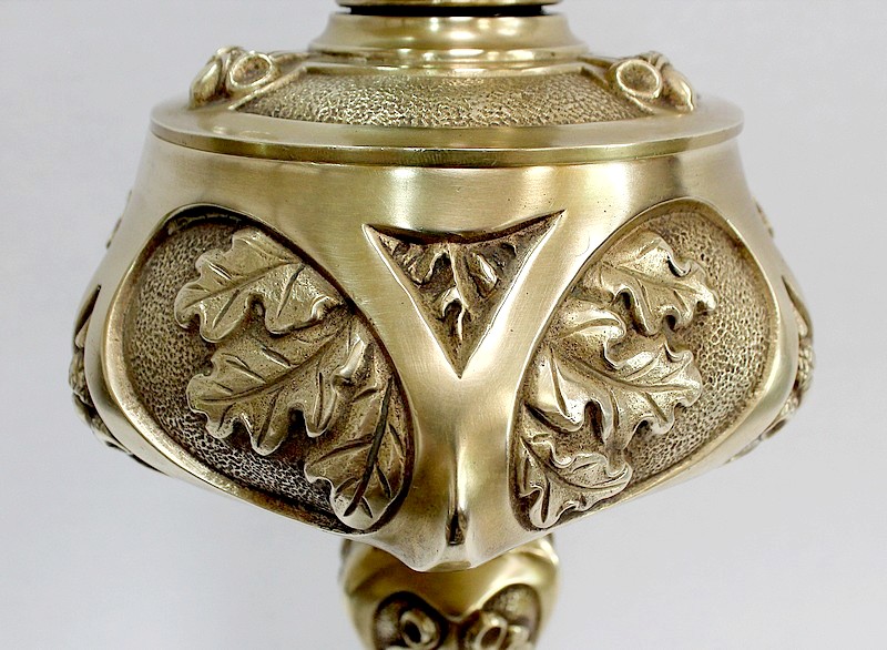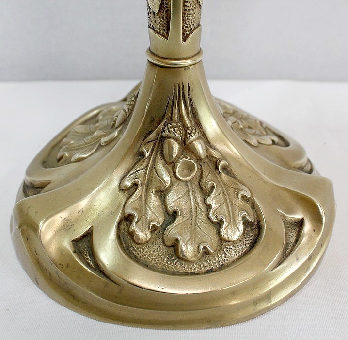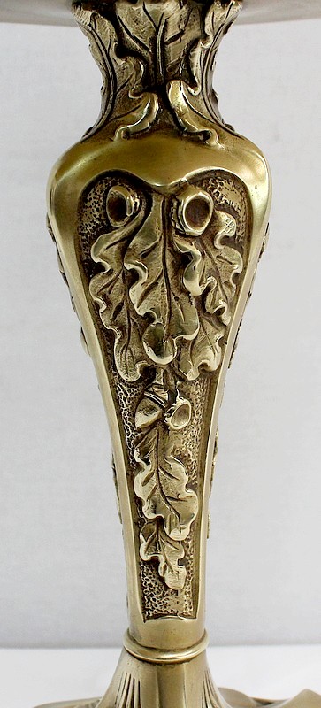 L’Ensemble de la Lampe est décoré d’Ornementations mettant en scène des Feuilles de Chêne et des Glands.