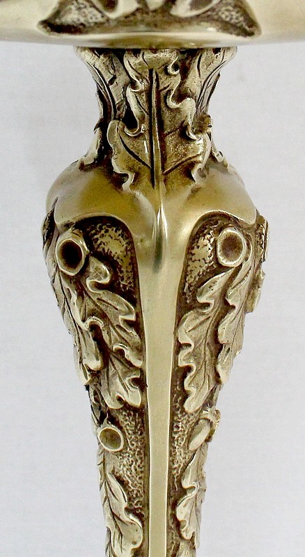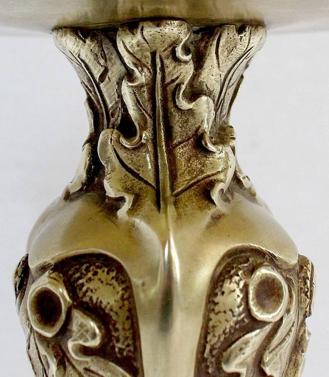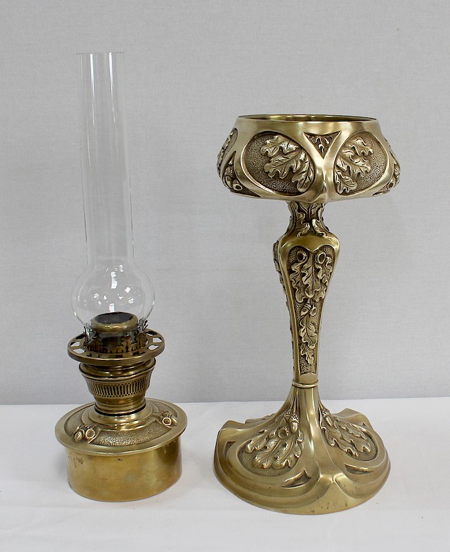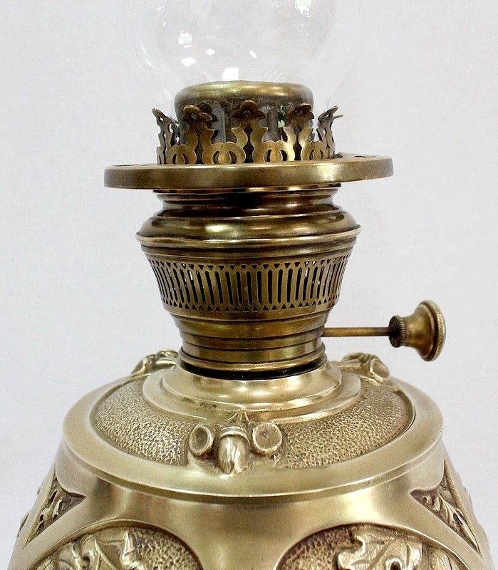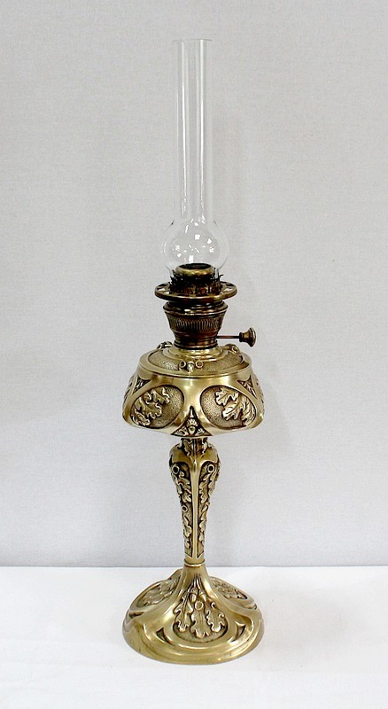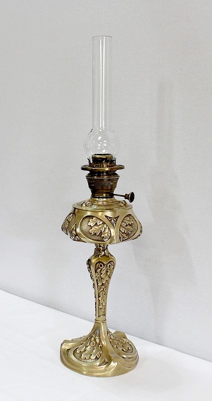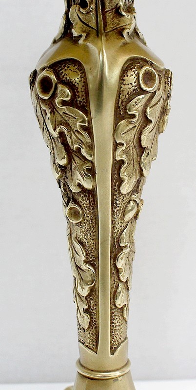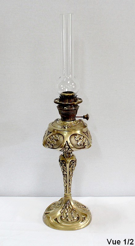 L’Ensemble de la Lampe est décoré d’Ornementations mettant en scène des Feuilles de Chêne et des Glands.