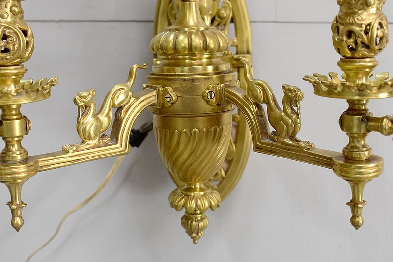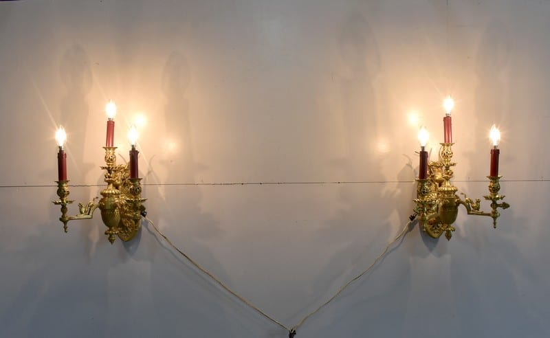 Importante paire d’appliques dans le goût Renaissance à 3 bras de lumière électrifiés en bronze, très lourdes.
