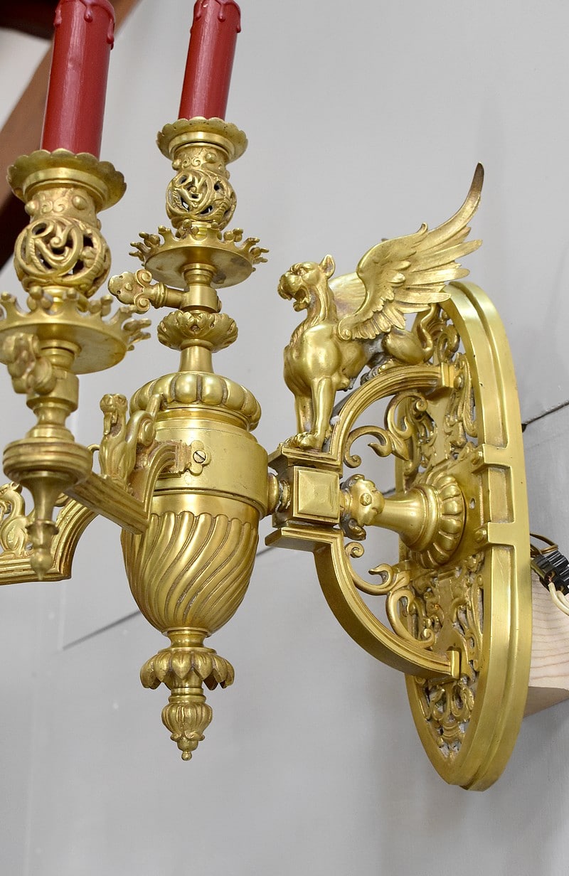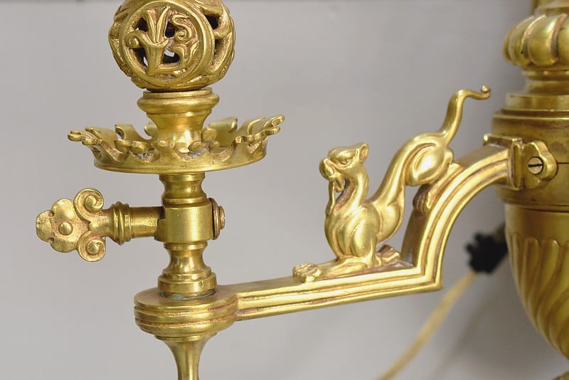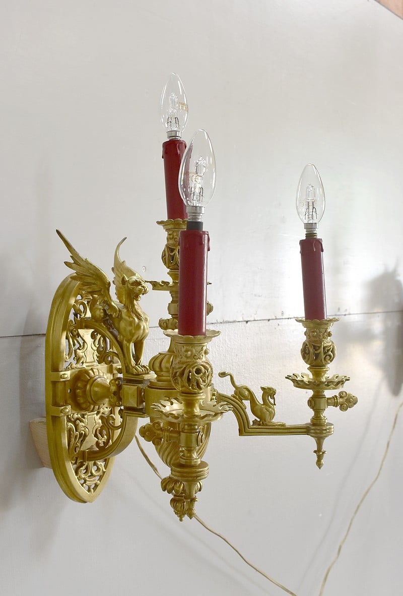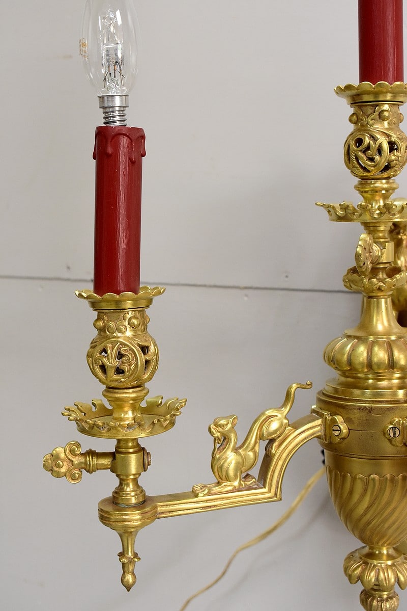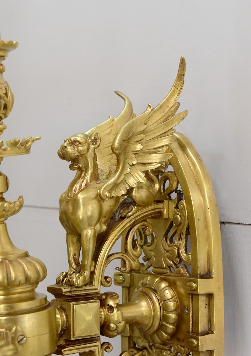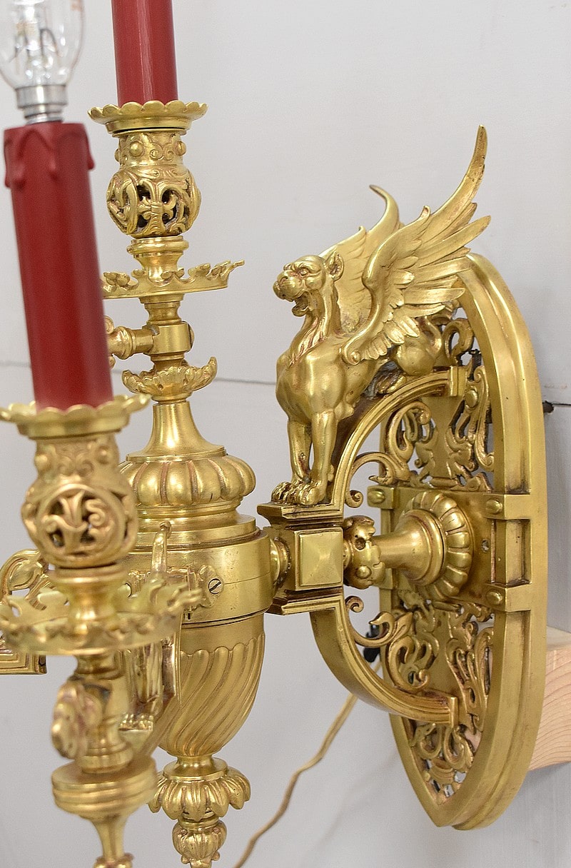 Leur socle vertical en forme d’amande est ajouré à décors d’arabesques et de rinceaux. Il est orné d’un important lion ailé faisant face au bras de lumière central.
