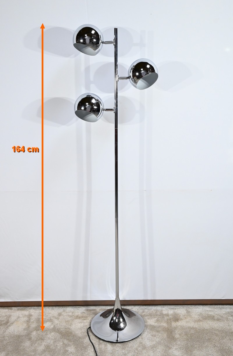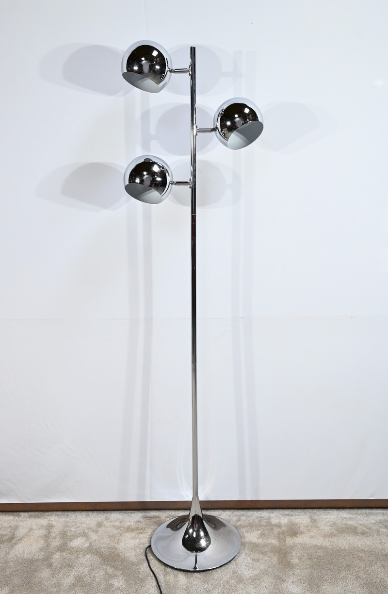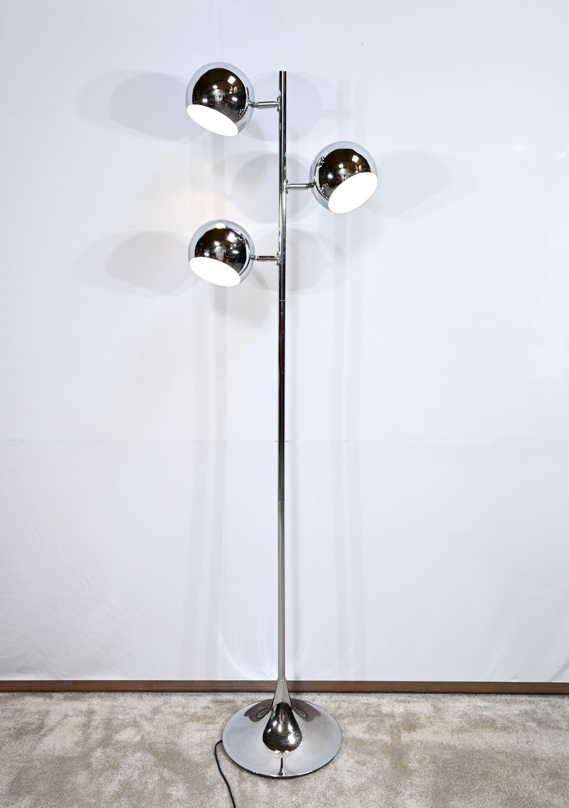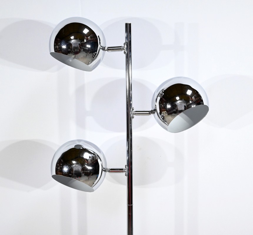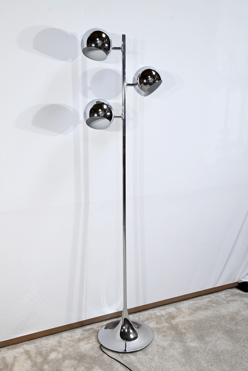Lampadaire en métal chromé à trois bras de lumière. Les abat-jours sont rotatifs permettant de moduler les sources lumineuses. Le pied tubulaire repose sur une base circulaire en métal chromé.