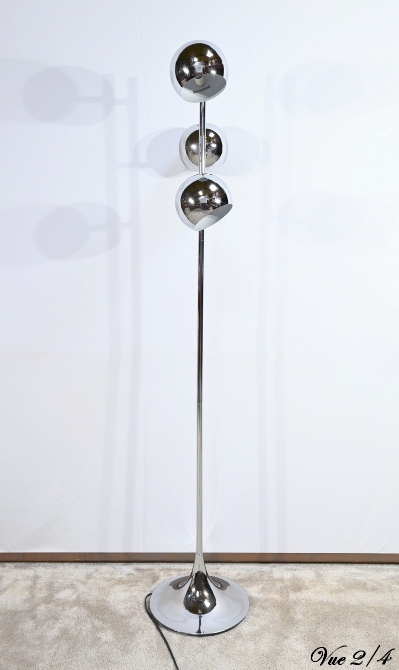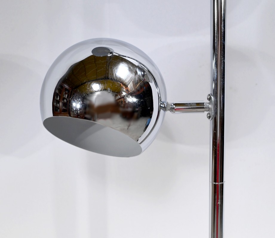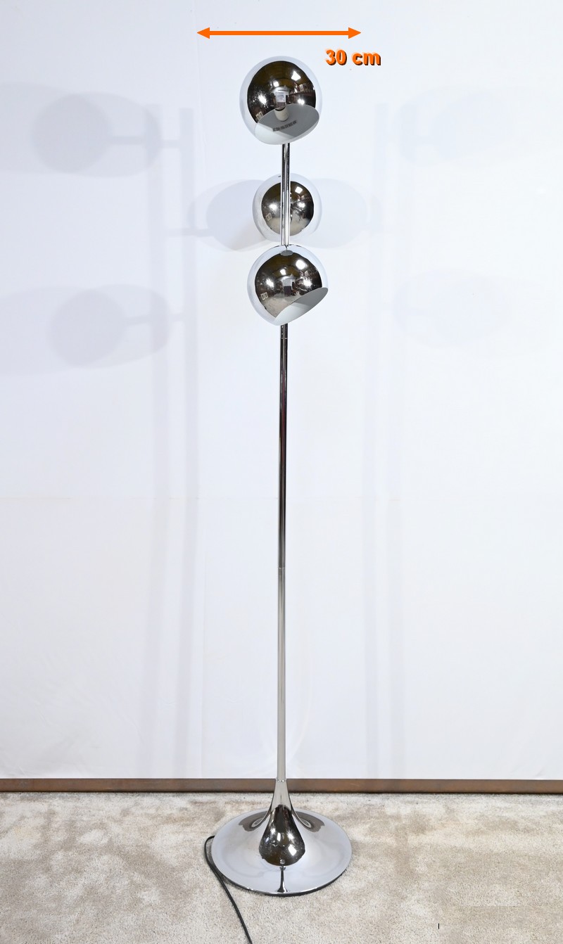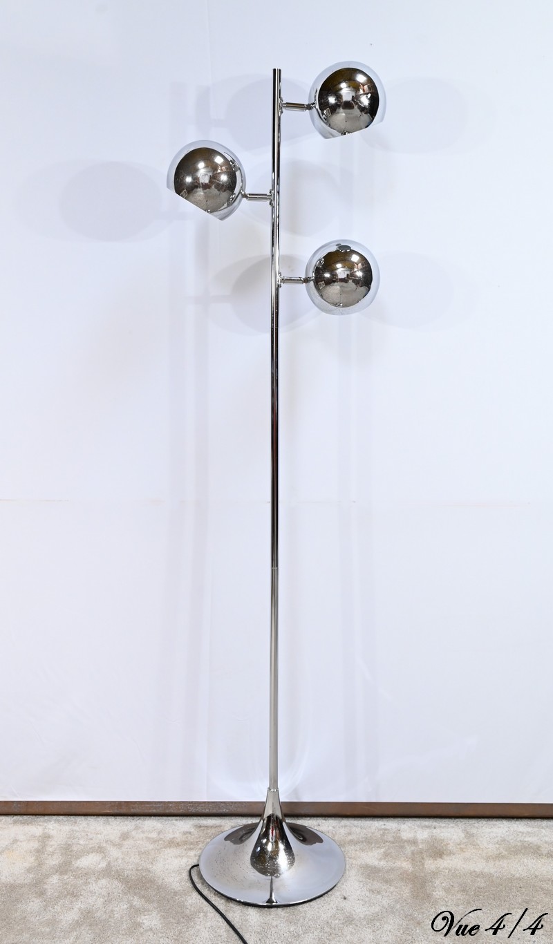 Lampadaire en métal chromé à trois bras de lumière. Les abat-jours sont rotatifs permettant de moduler les sources lumineuses. Le pied tubulaire repose sur une base circulaire en métal chromé.