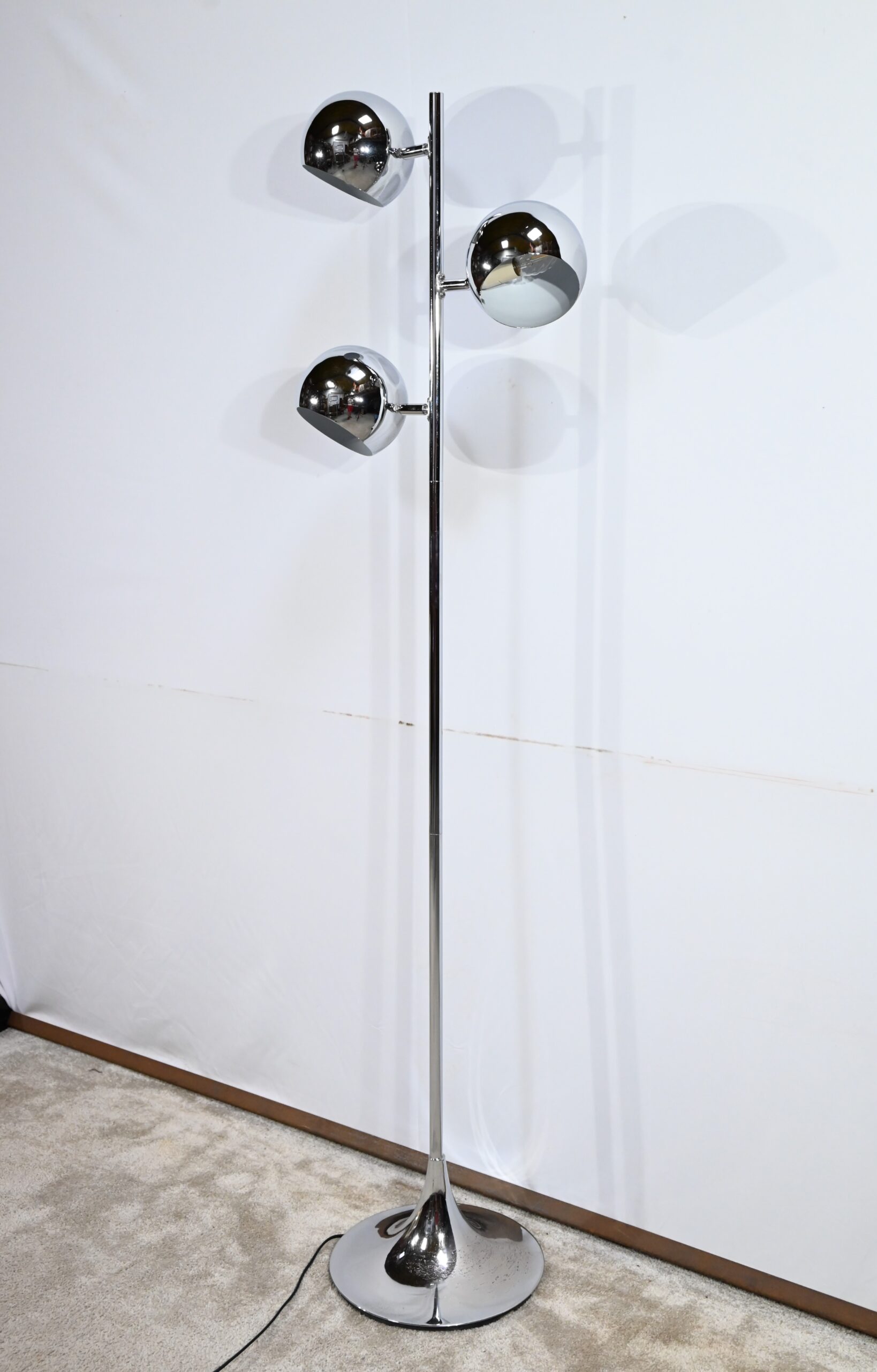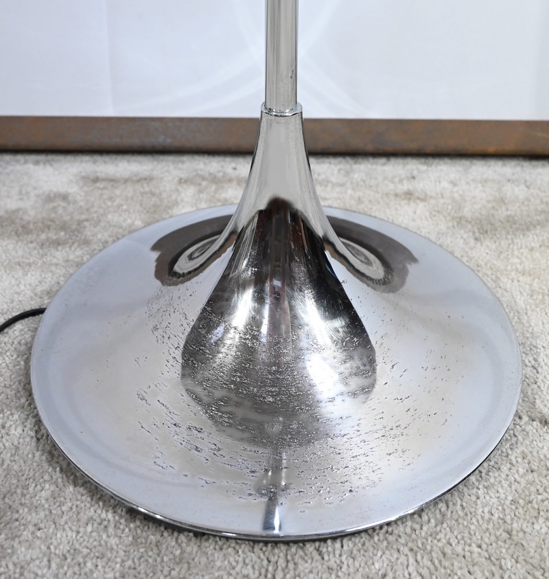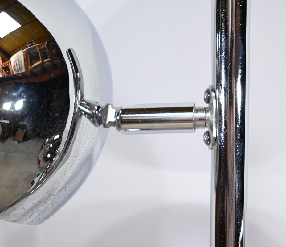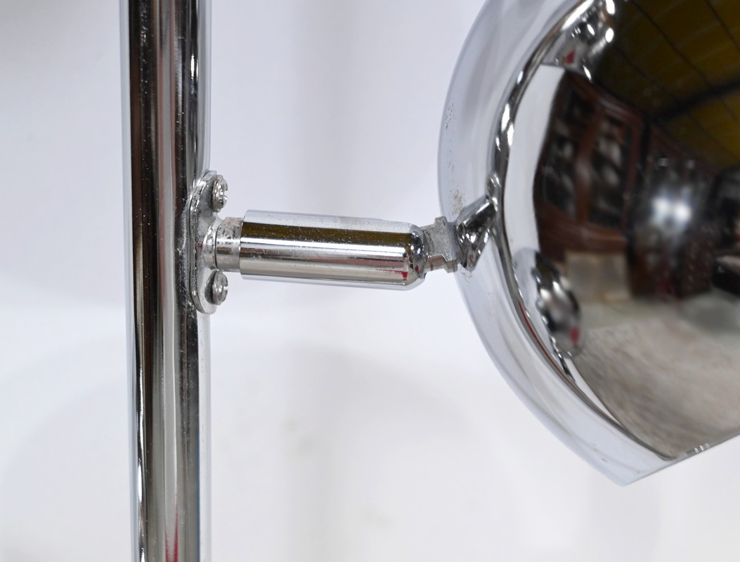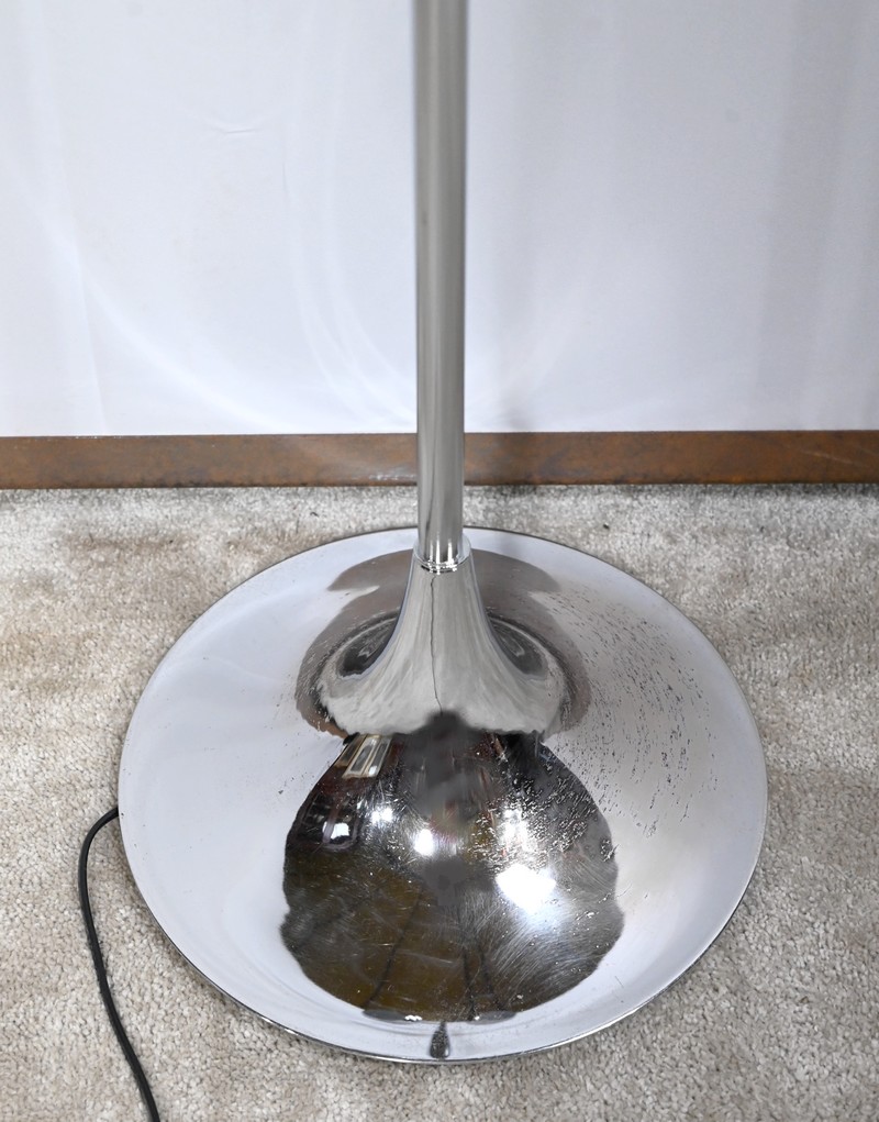 Lampadaire en métal chromé à trois bras de lumière. Les abat-jours sont rotatifs permettant de moduler les sources lumineuses. Le pied tubulaire repose sur une base circulaire en métal chromé.