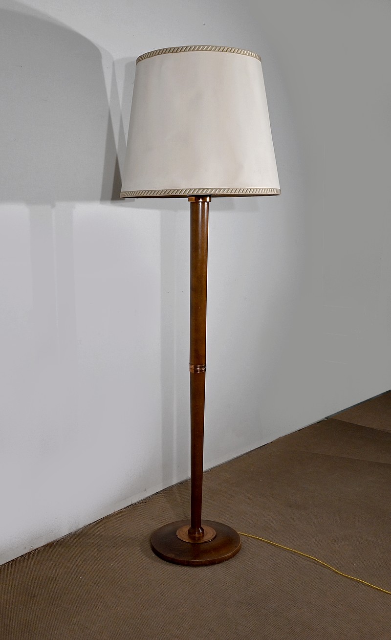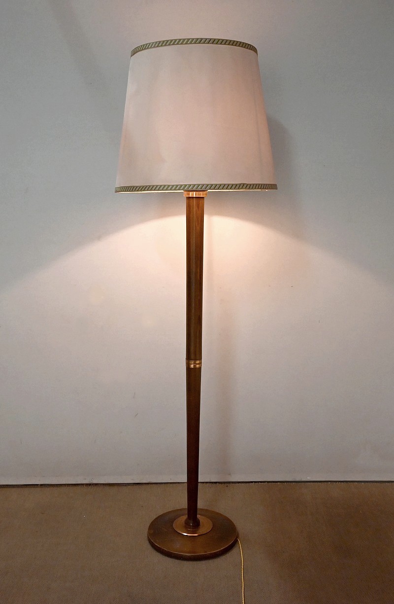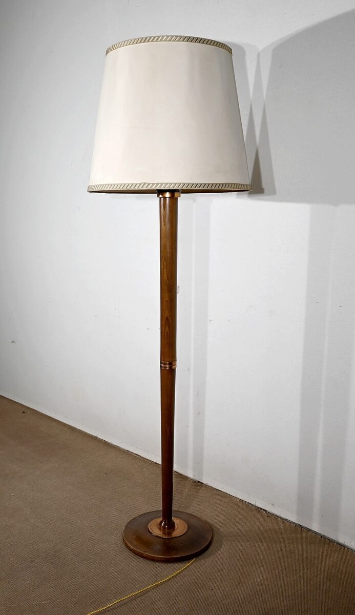 Ce lampadaire possède un fût cylindrique s’affinant vers le bas, reposant sur une platine en cuivre strié. La base est circulaire et moulurée, quant à la partie supérieure, elle présente d’élégantes cannelures.