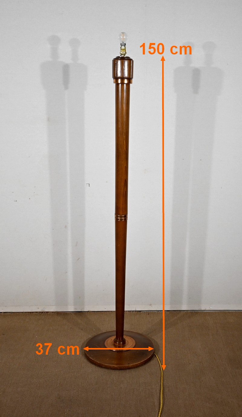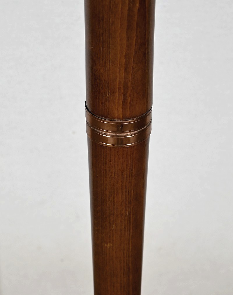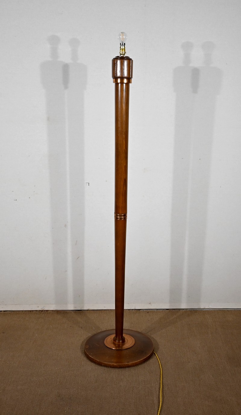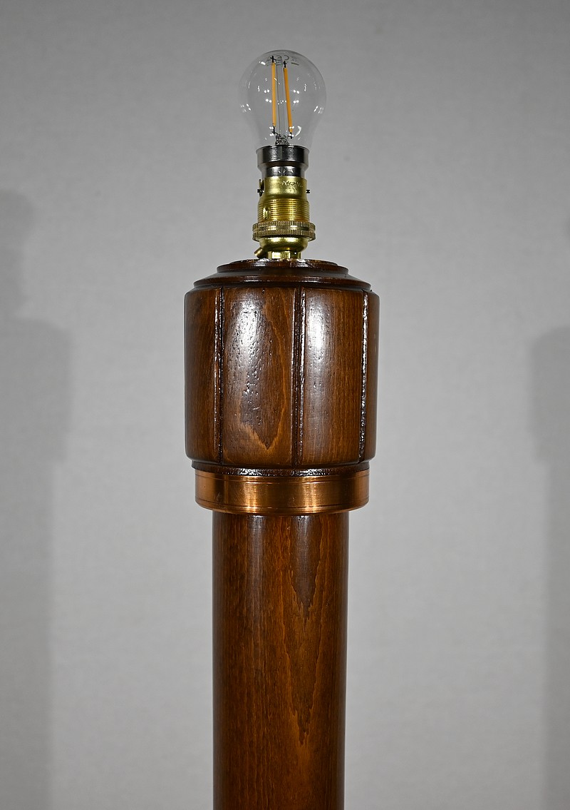 Grande lampe sur pied en hêtre, au design unique, agrémentée de bagues en cuivre.