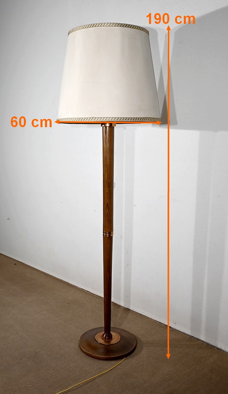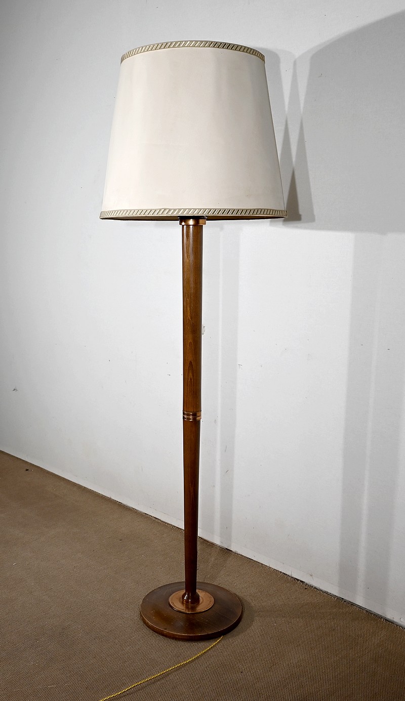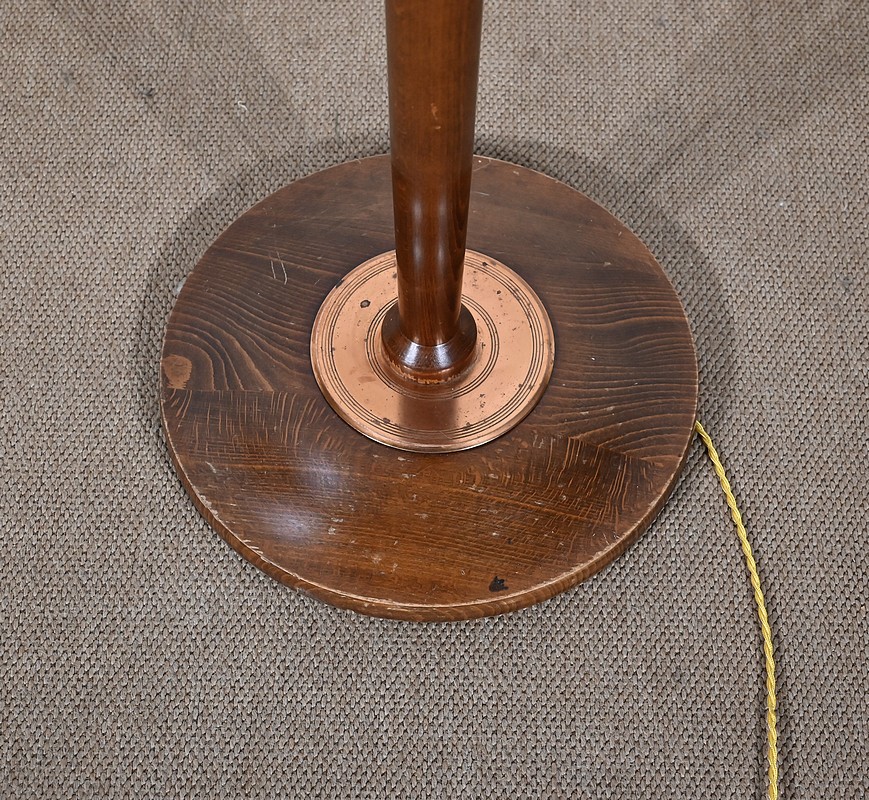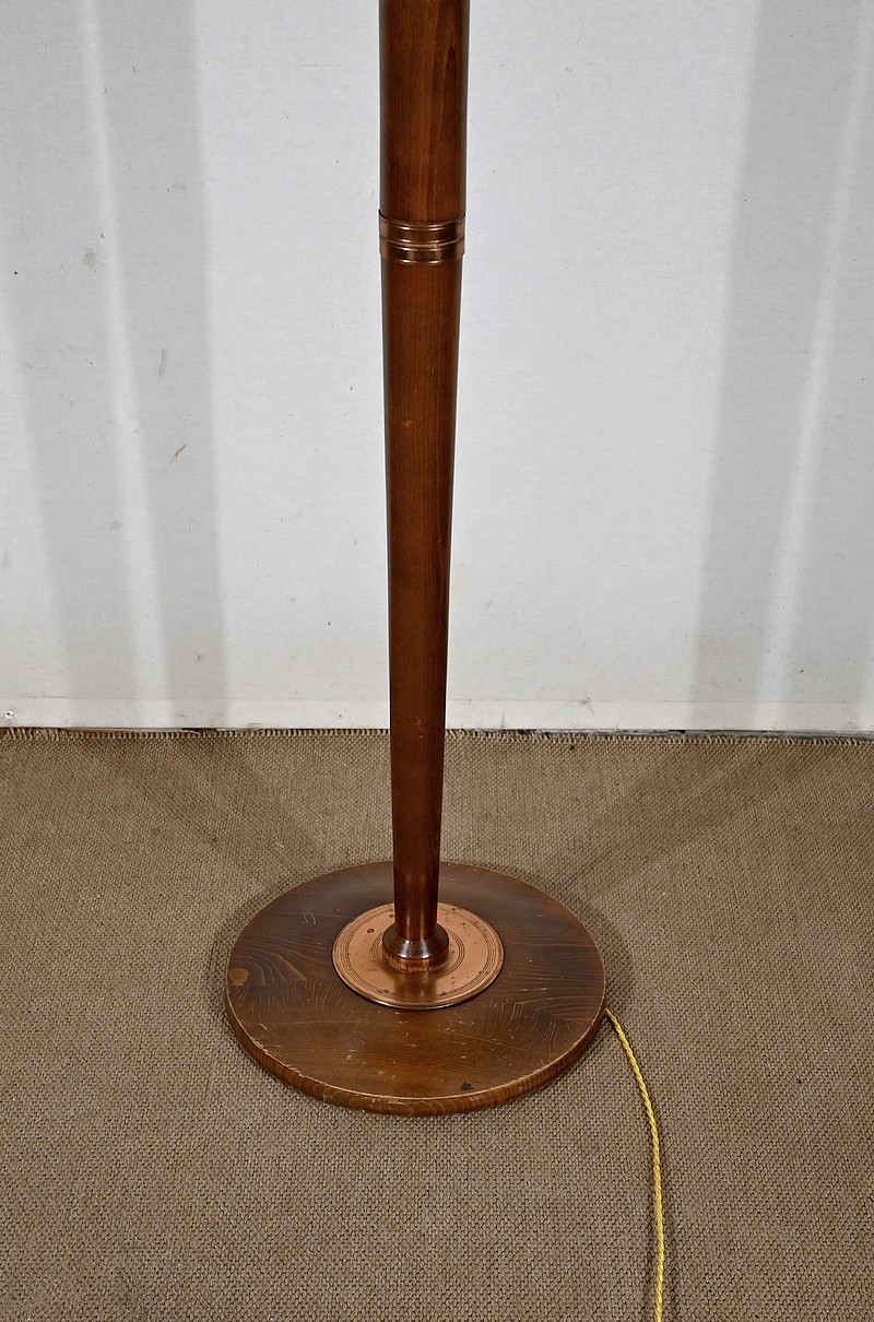 Grande lampe sur pied en hêtre, au design unique, agrémentée de bagues en cuivre.