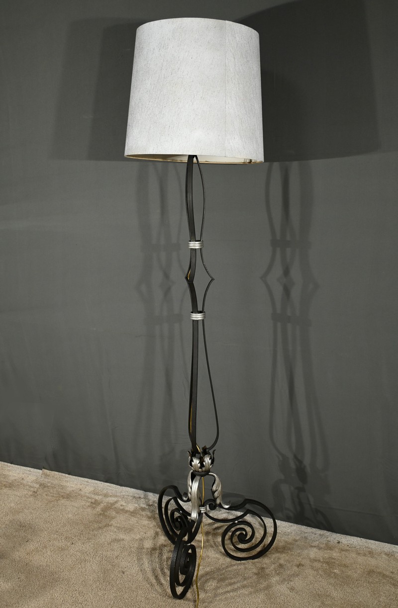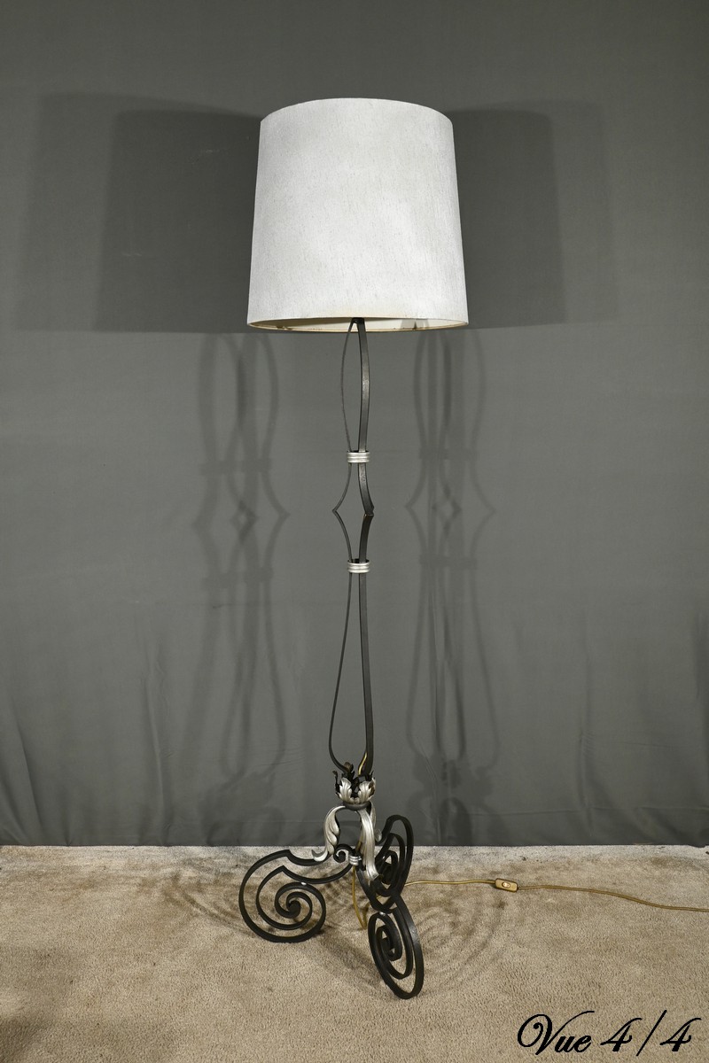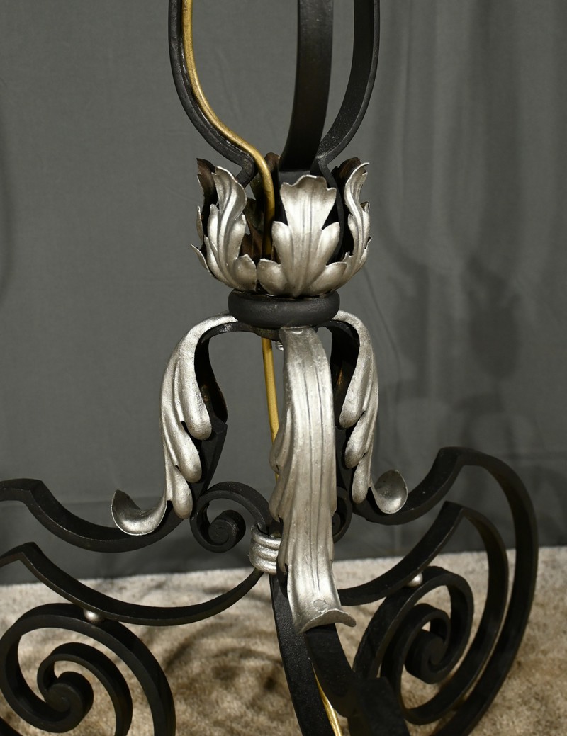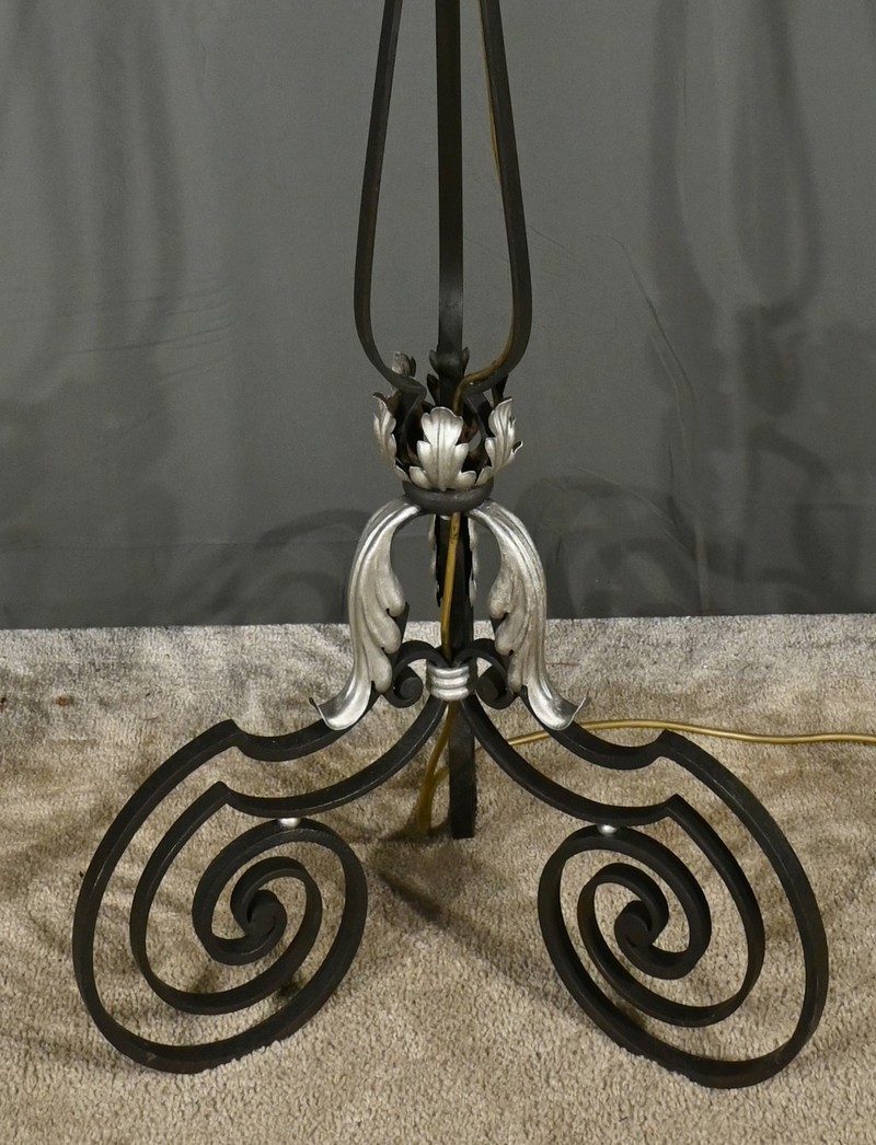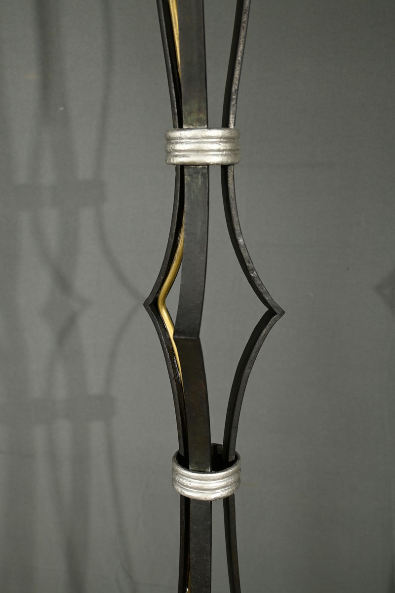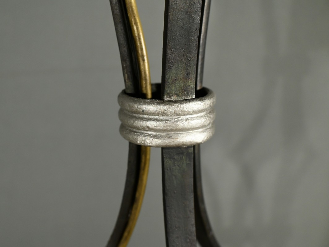 Ce lampadaire en fer forgé, datant des années 1940, est une véritable œuvre d’art, alliant élégance et robustesse.