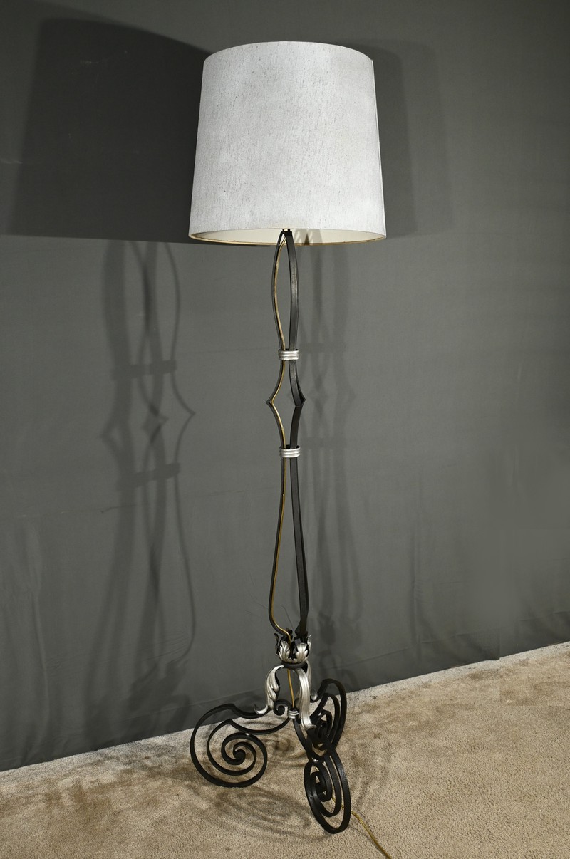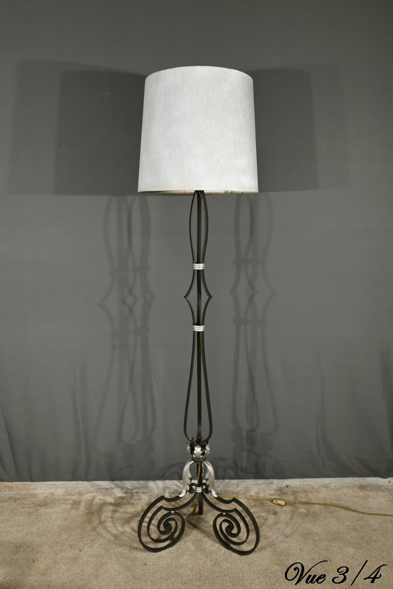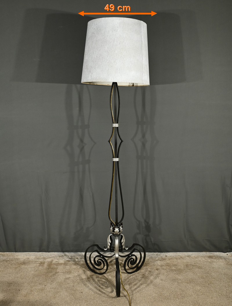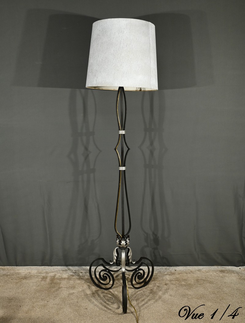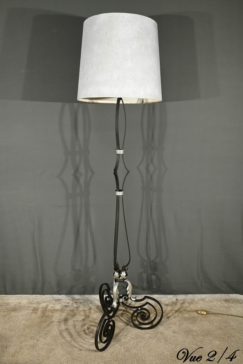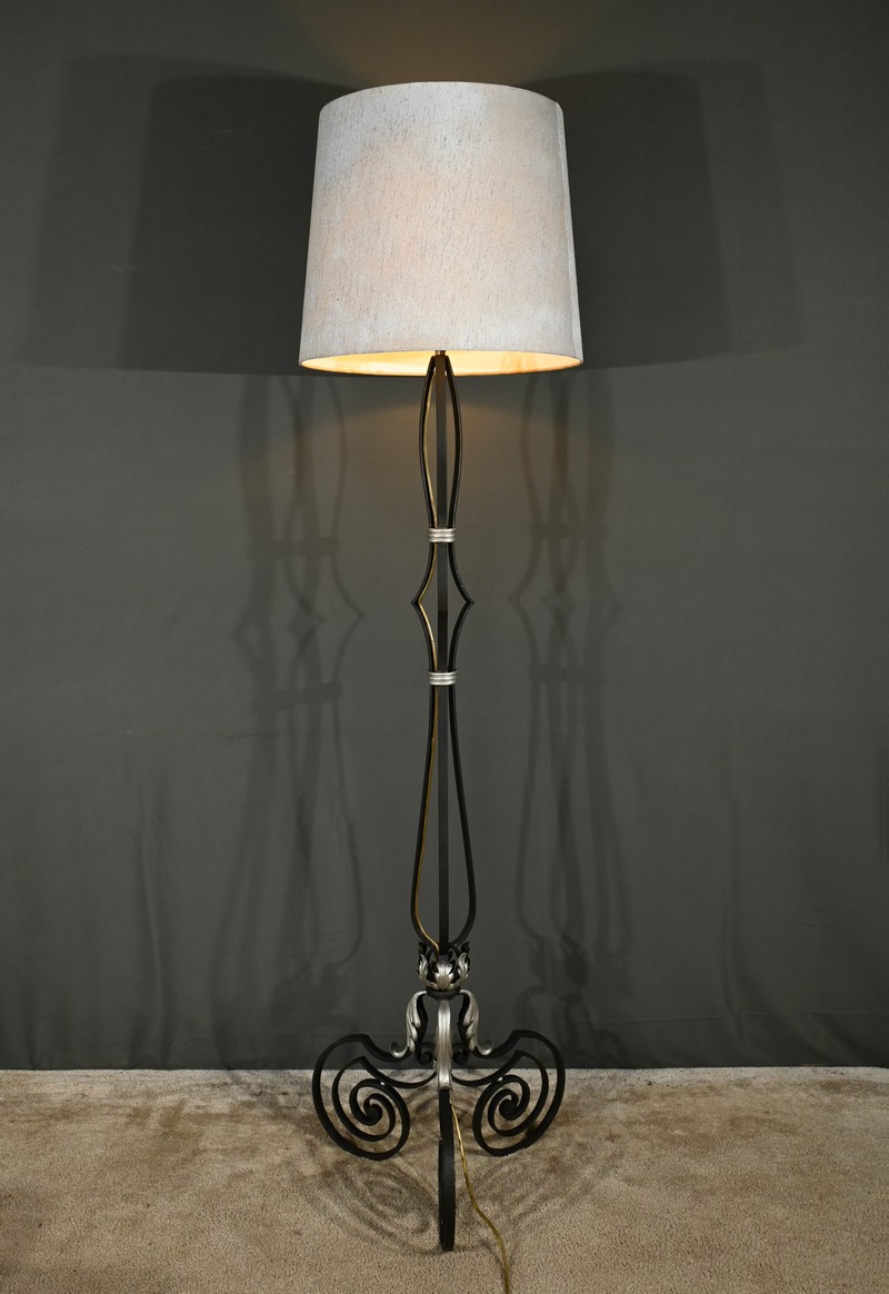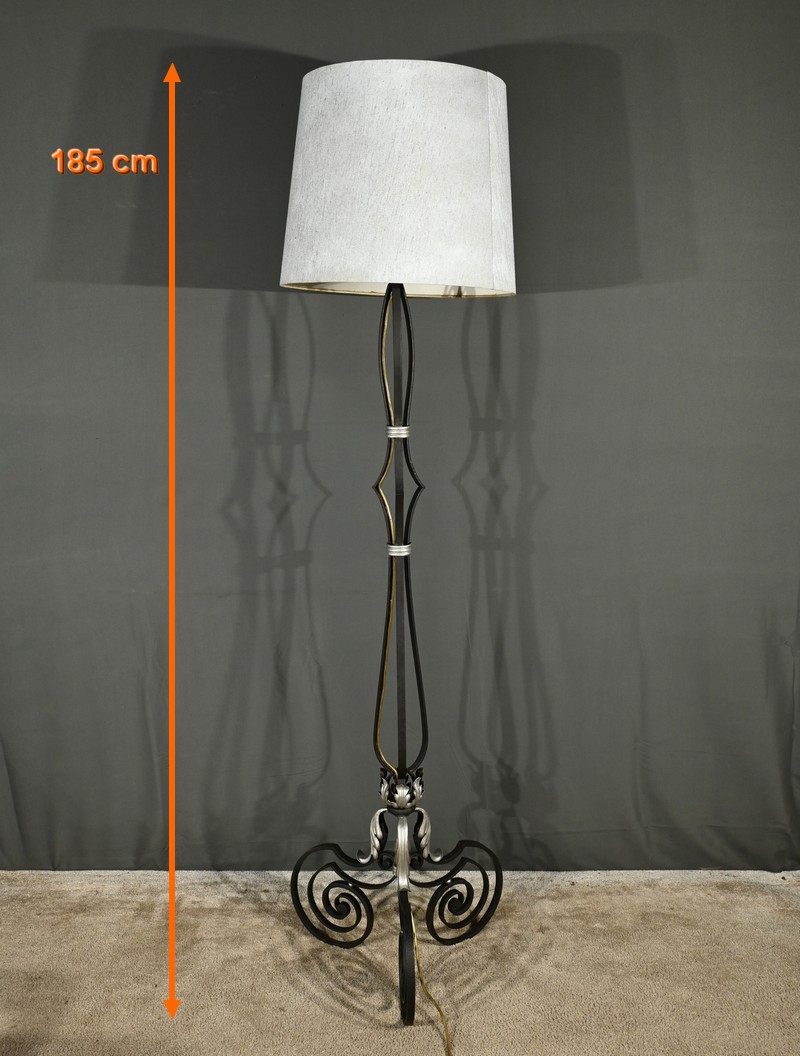 Ce lampadaire en fer forgé, datant des années 1940, est une véritable œuvre d’art, alliant élégance et robustesse.