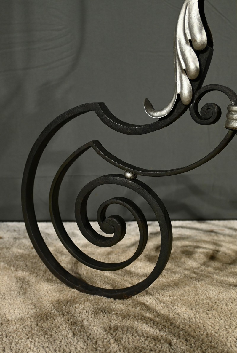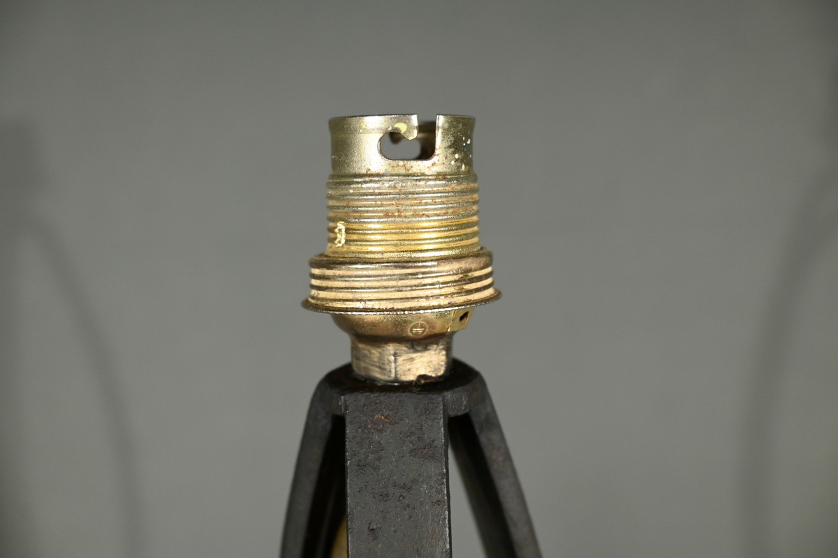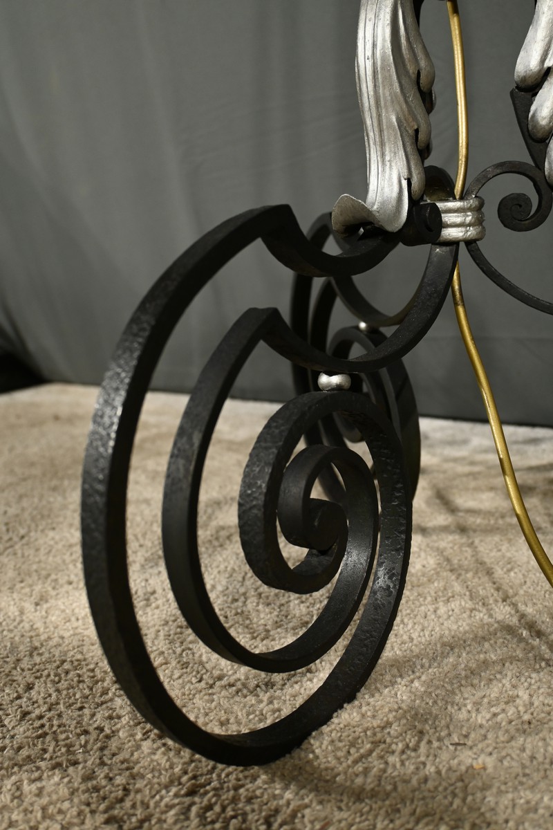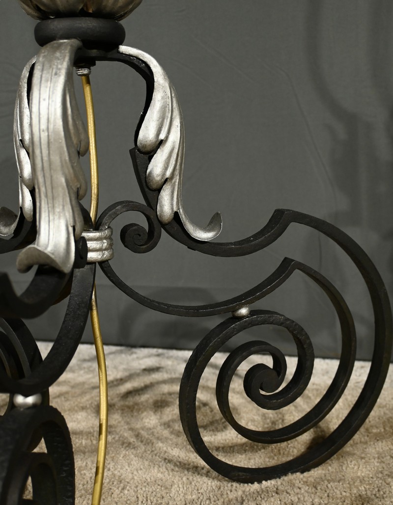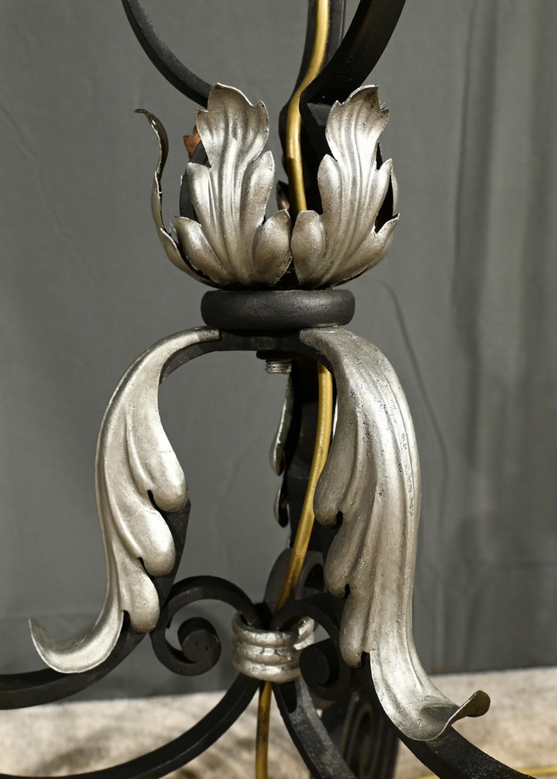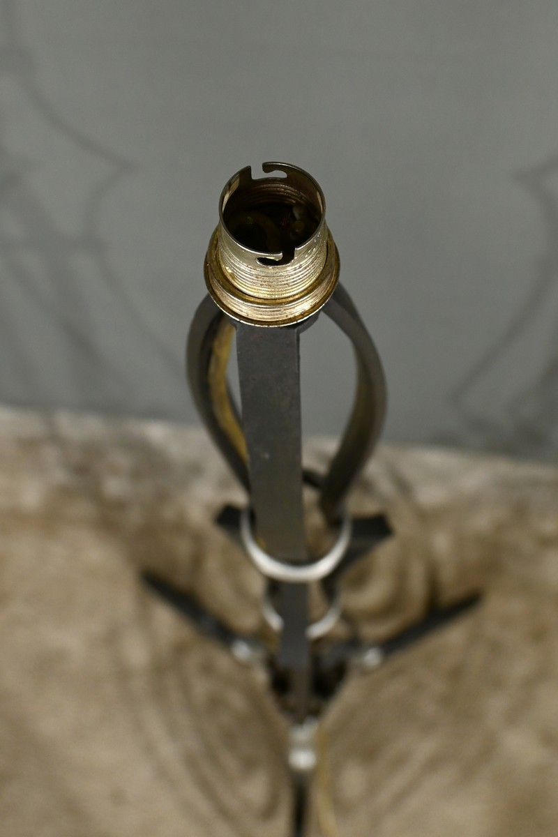 Ce lampadaire en fer forgé, datant des années 1940, est une véritable œuvre d’art, alliant élégance et robustesse.
