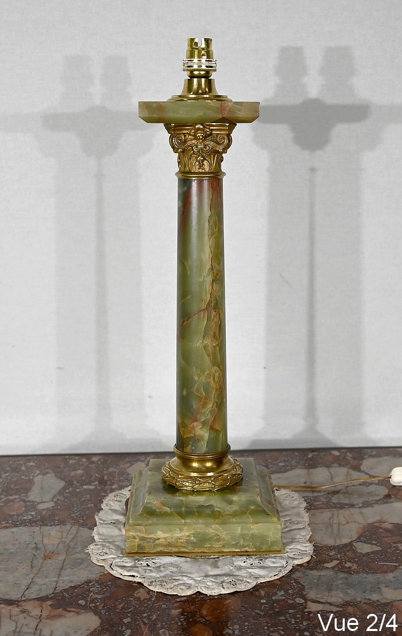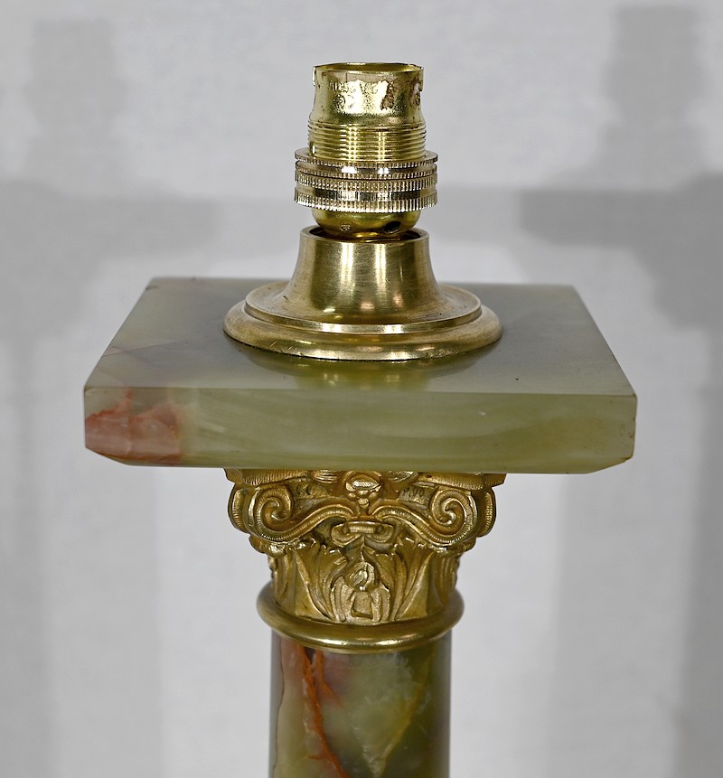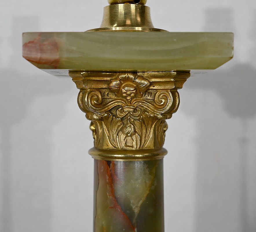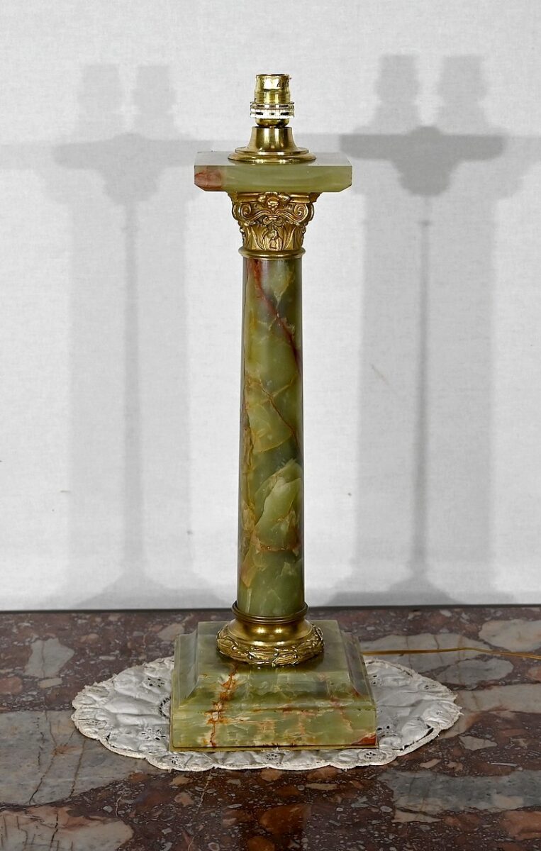 Lampe de style Empire comportant un long fût cylindrique en onyx vert au veinage bordeaux subtil.