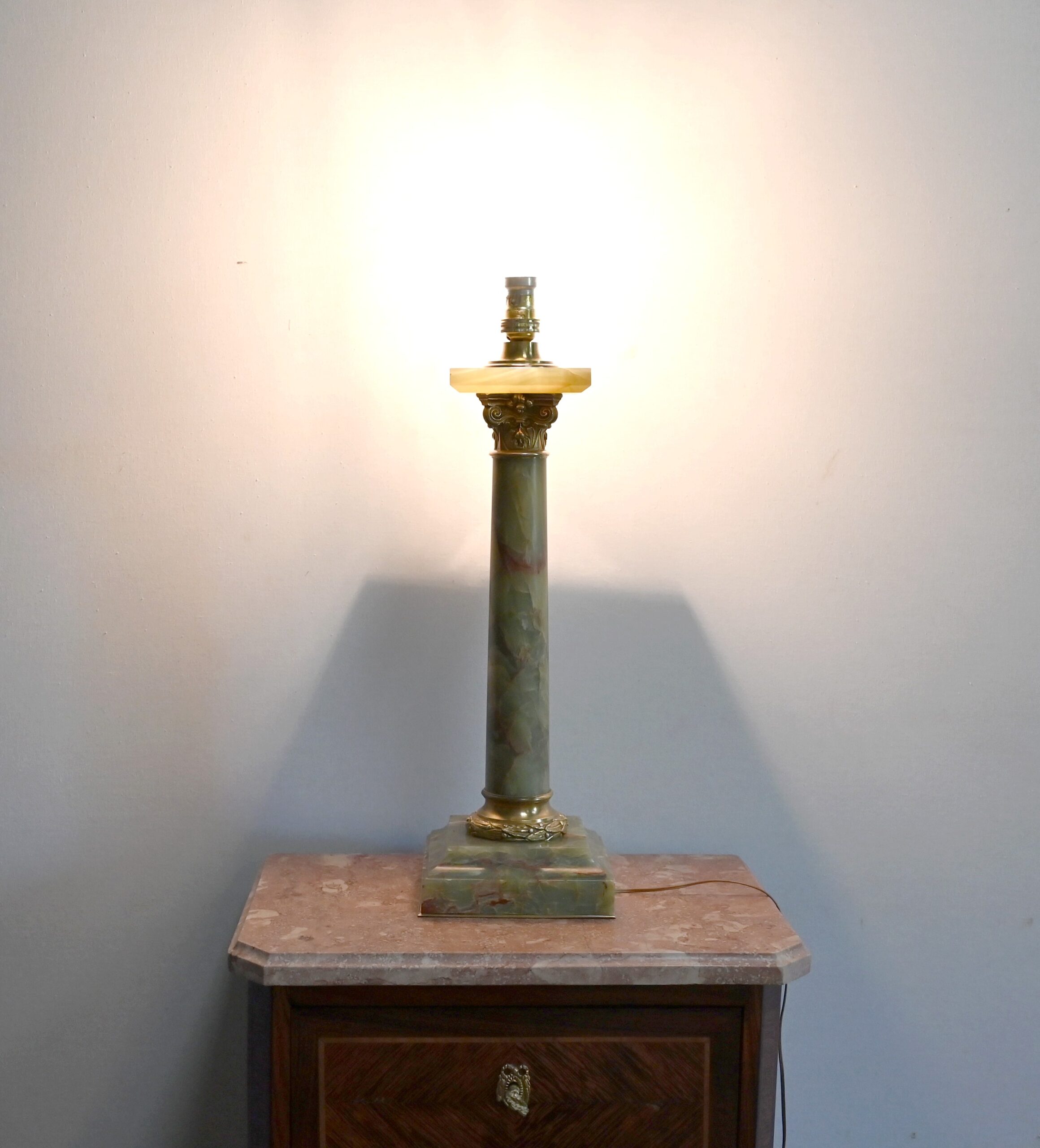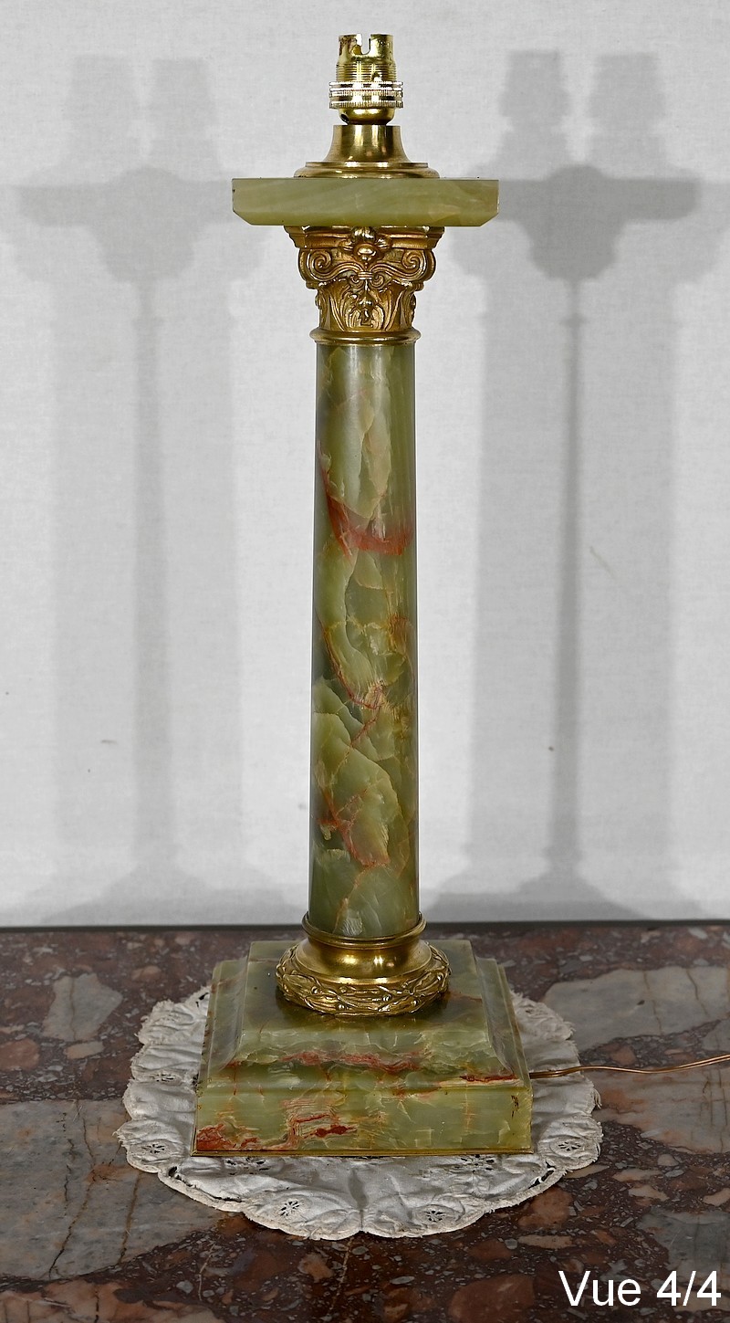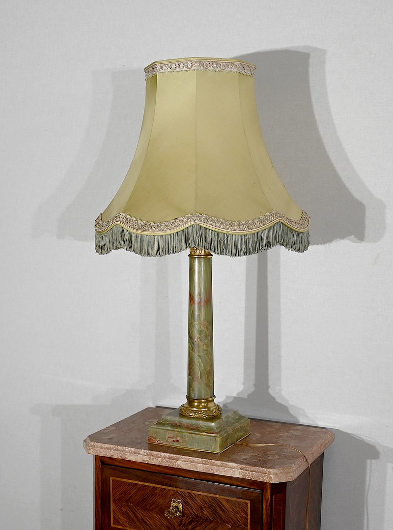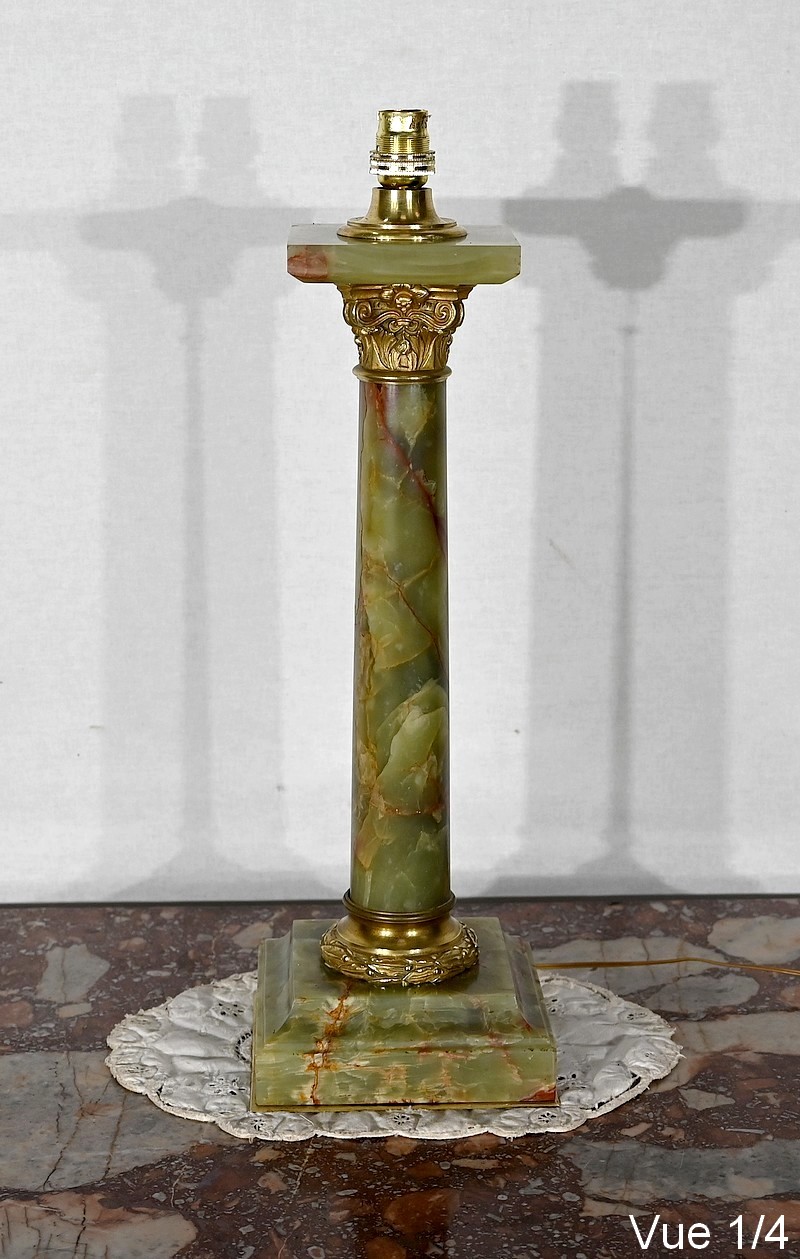 Lampe de style Empire comportant un long fût cylindrique en onyx vert au veinage bordeaux subtil.