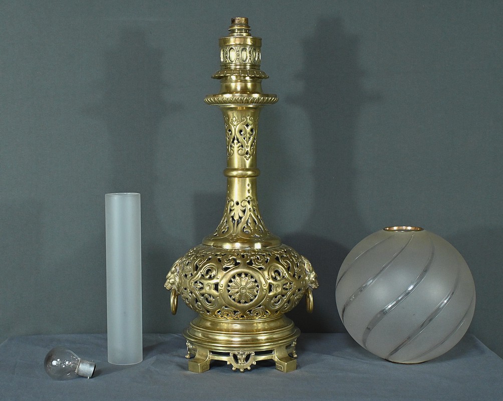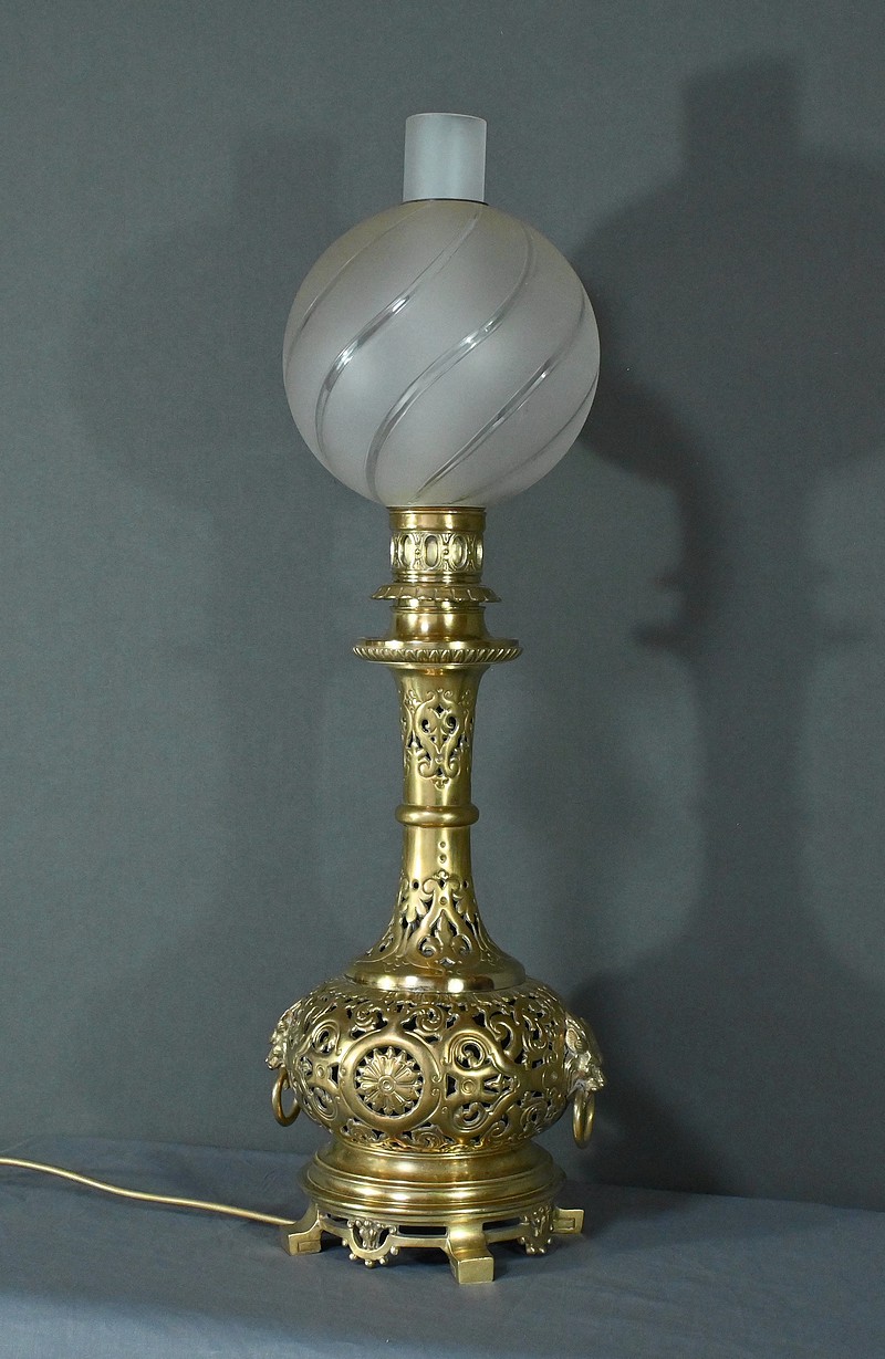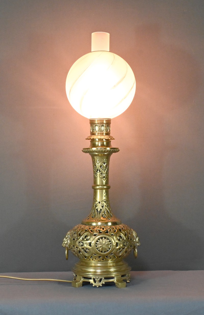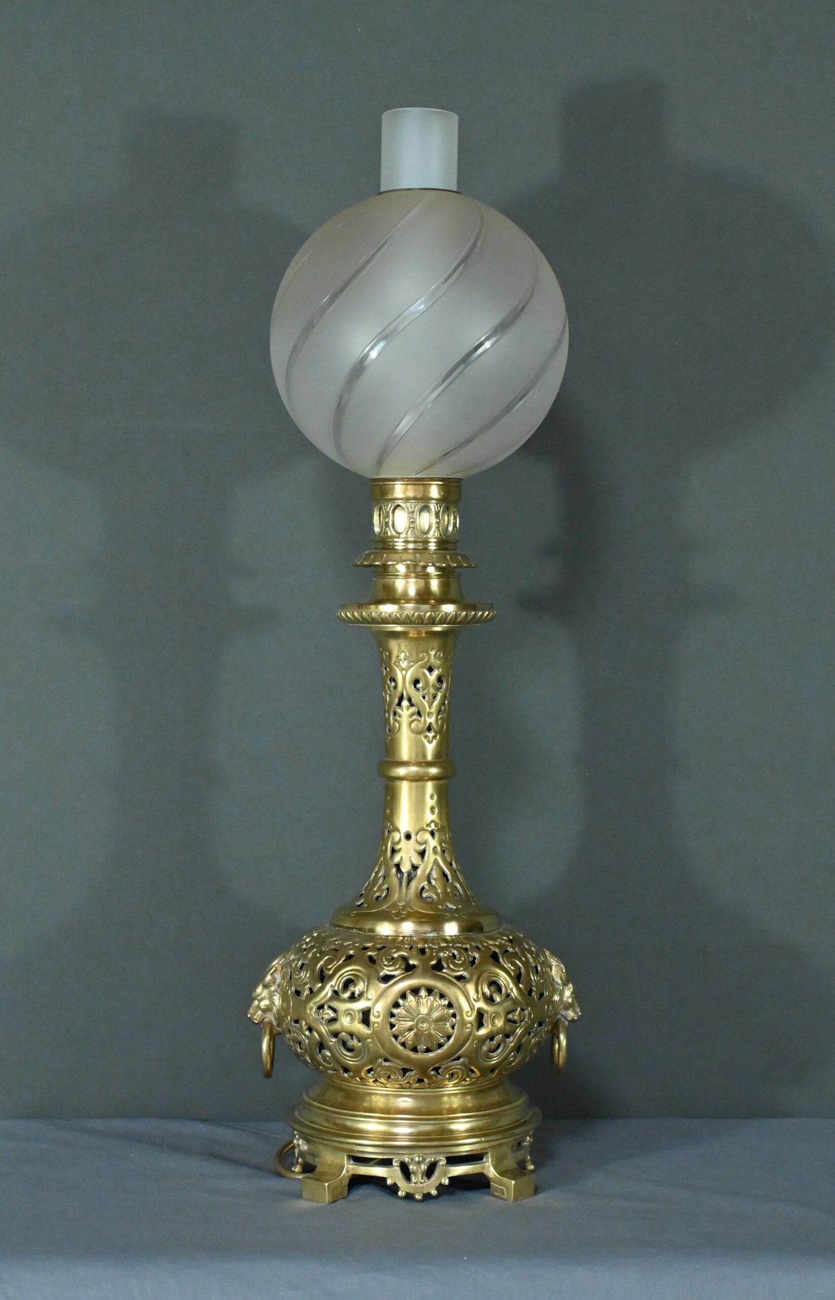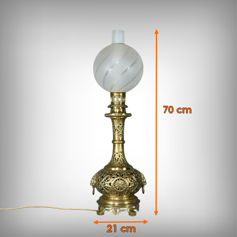 Grande lampe à pétrole électrifiée, réalisée en laiton massif vers 1920. Son fût ajouré est orné de têtes de lion avec anneaux sur les côtés. Cette lampe finement ouvragée de volutes et de feuillage témoigne du savoir-faire artisanal de l’époque, tandis que son globe en verre dépoli orné de délicats motifs en spirale diffuse une lumière douce et chaleureuse. Entièrement électrifiée et en parfait état pour une utilisation moderne, elle allie le charme de l’ancien au confort d’aujourd’hui. Cette pièce unique s’intègre parfaitement dans une décoration de style vintage et ravira les amateurs d’authenticité et de raffinement.