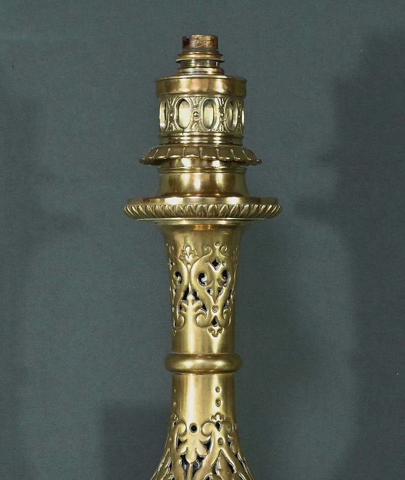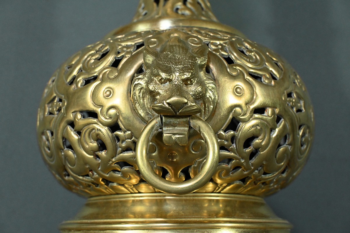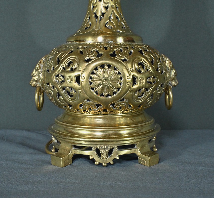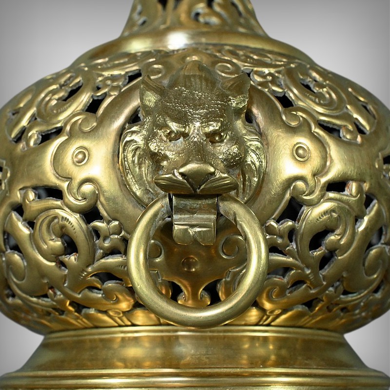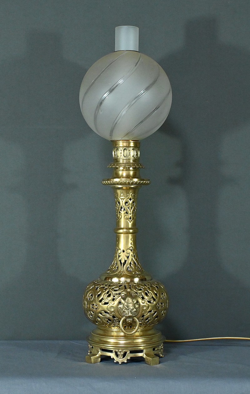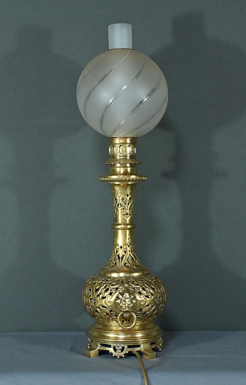 Grande lampe à pétrole électrifiée, réalisée en laiton massif vers 1920. Son fût ajouré est orné de têtes de lion avec anneaux sur les côtés. Cette lampe finement ouvragée de volutes et de feuillage témoigne du savoir-faire artisanal de l’époque, tandis que son globe en verre dépoli orné de délicats motifs en spirale diffuse une lumière douce et chaleureuse. Entièrement électrifiée et en parfait état pour une utilisation moderne, elle allie le charme de l’ancien au confort d’aujourd’hui. Cette pièce unique s’intègre parfaitement dans une décoration de style vintage et ravira les amateurs d’authenticité et de raffinement.