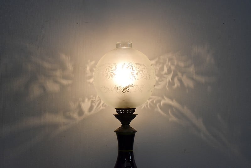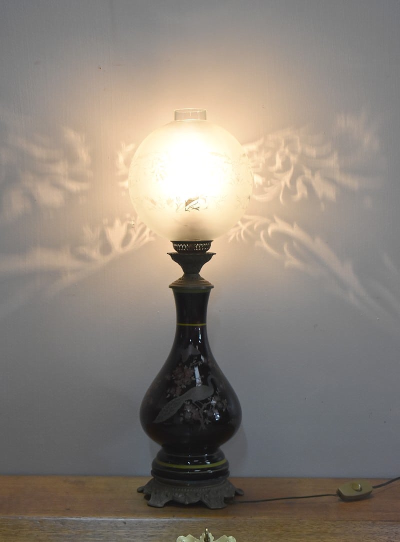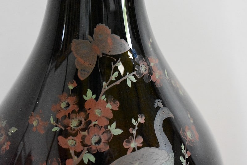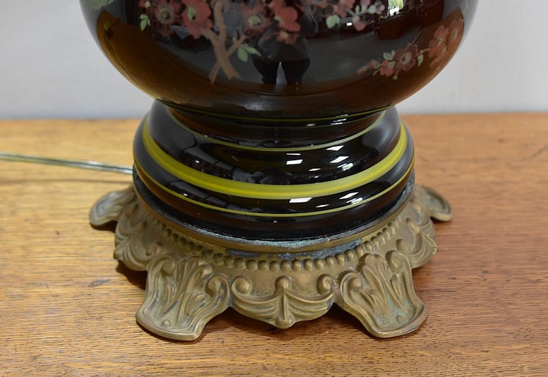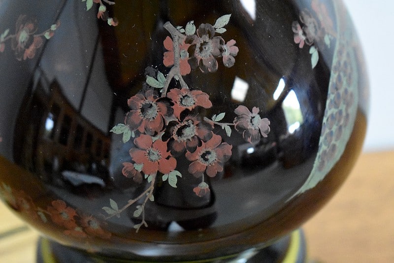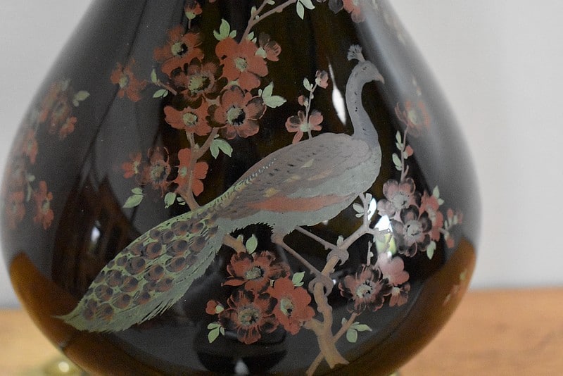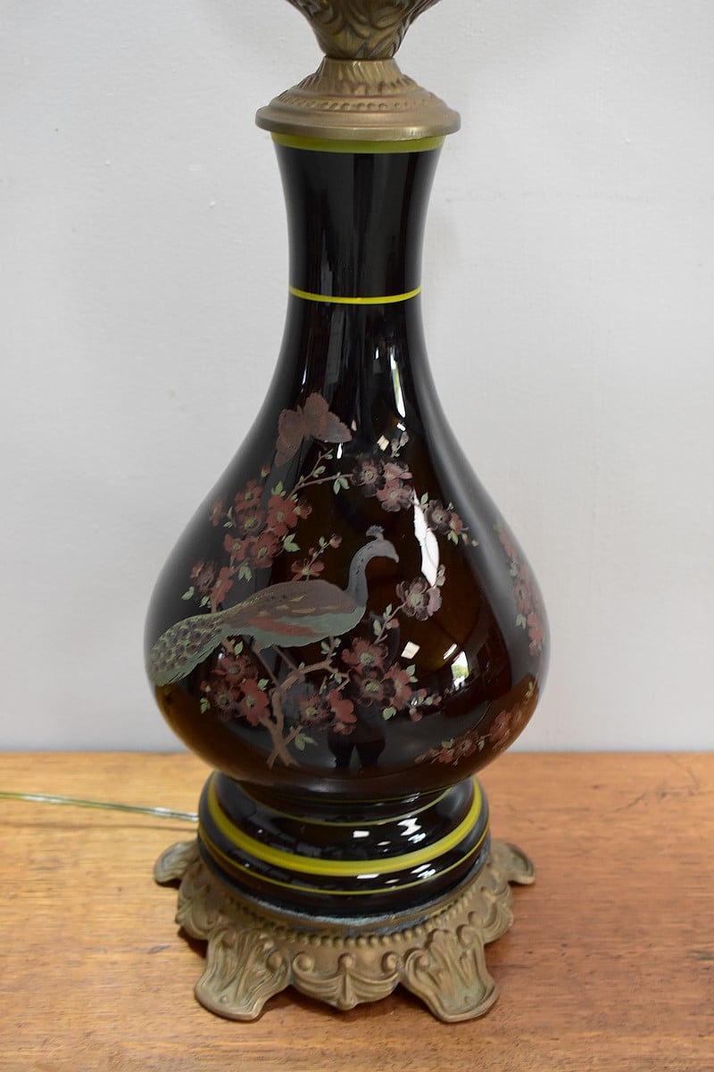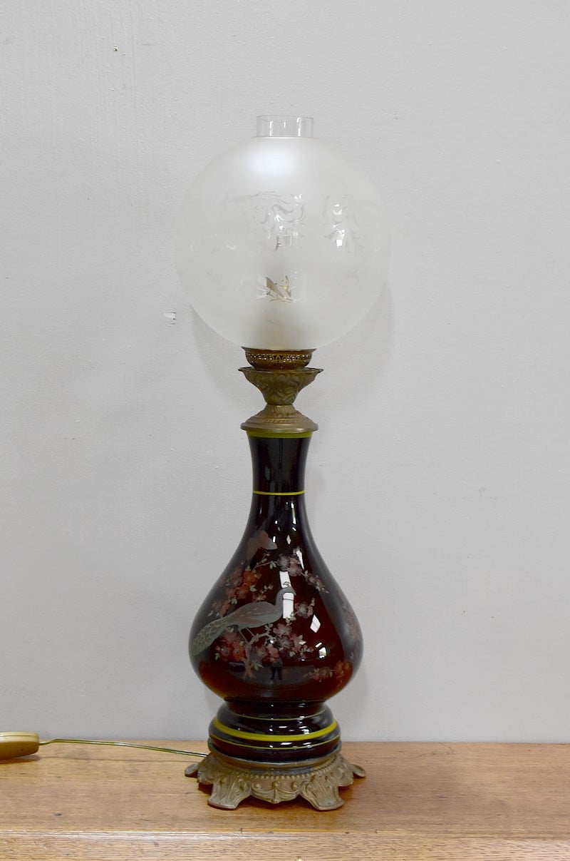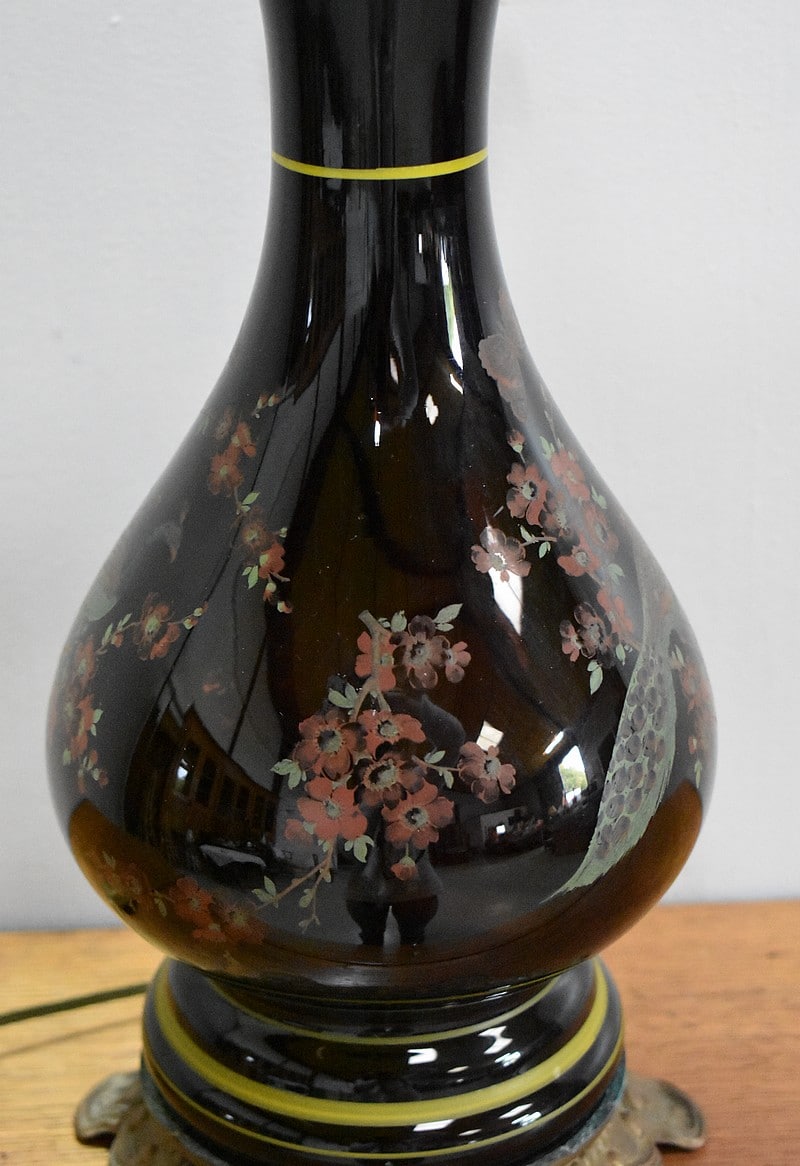 Lampe à pétrole électrifiée dont le fût en bouteille en verre teinté est à décors de fleurs de cerisiers et de paons sur fond noir.