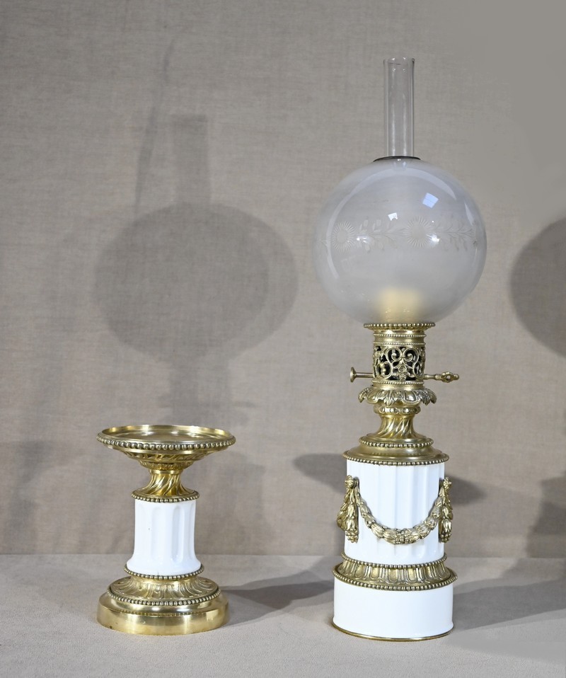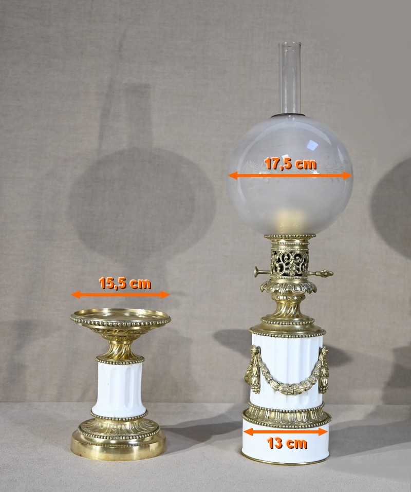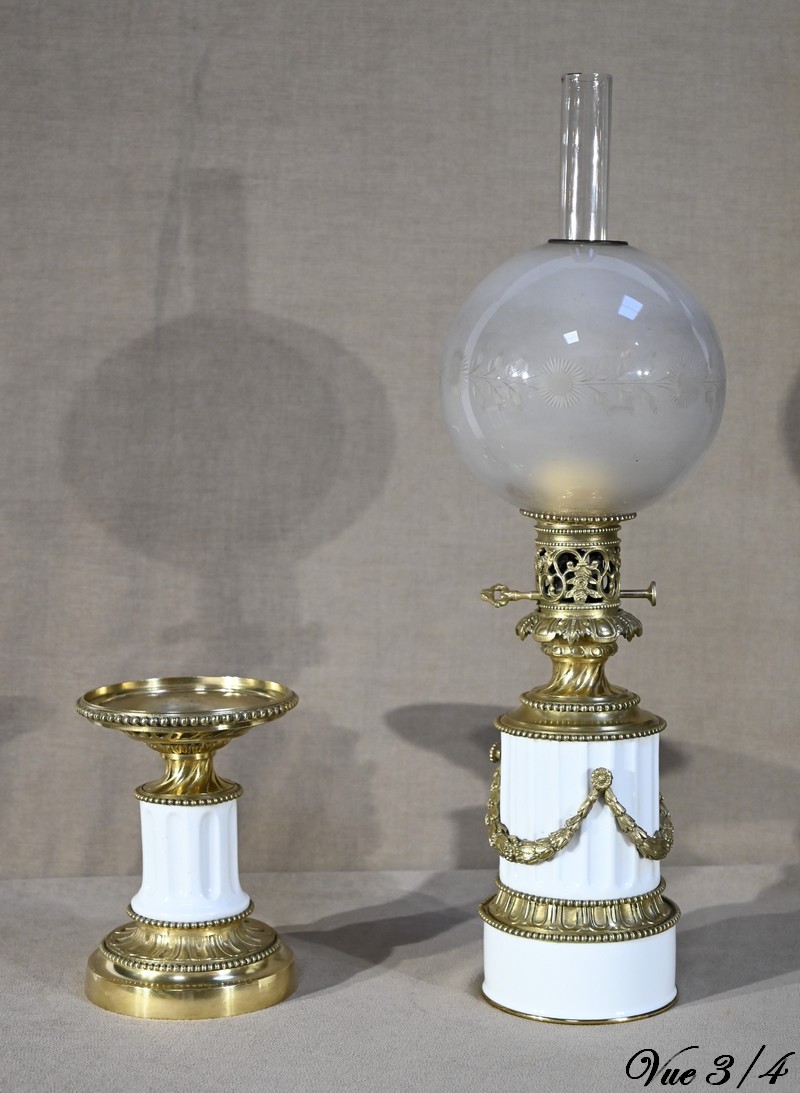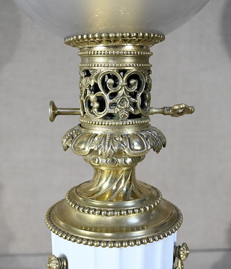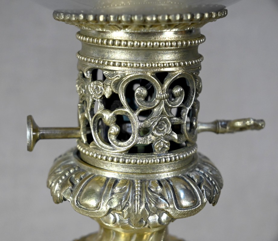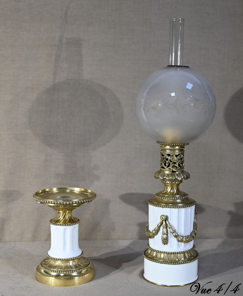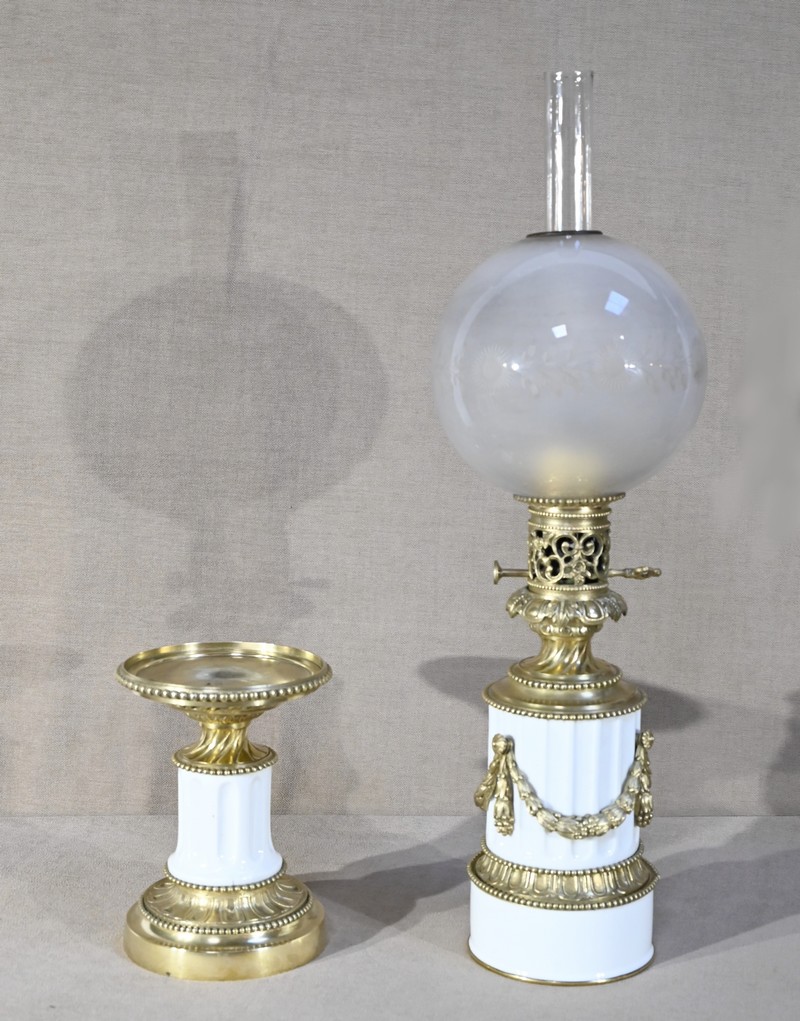 Le réservoir de lampe, aux larges cannelures, est ceint de fines guirlandes en bronze doré et souligné de perlés et de godrons.