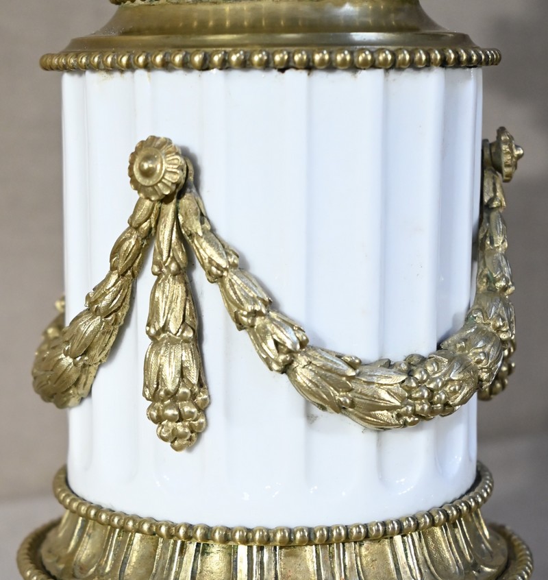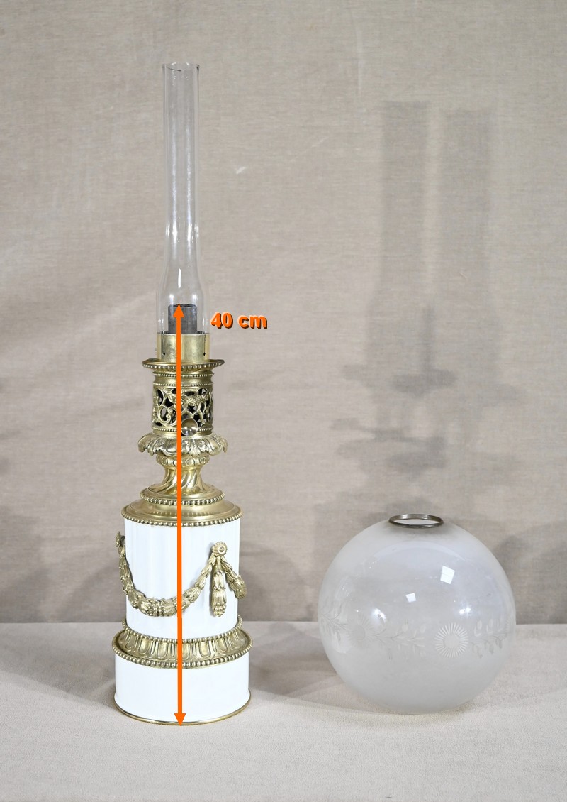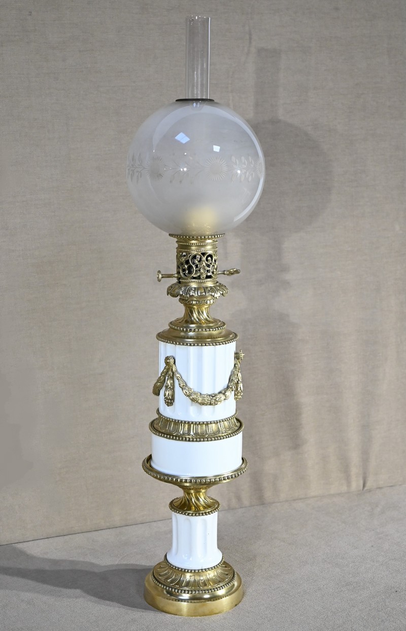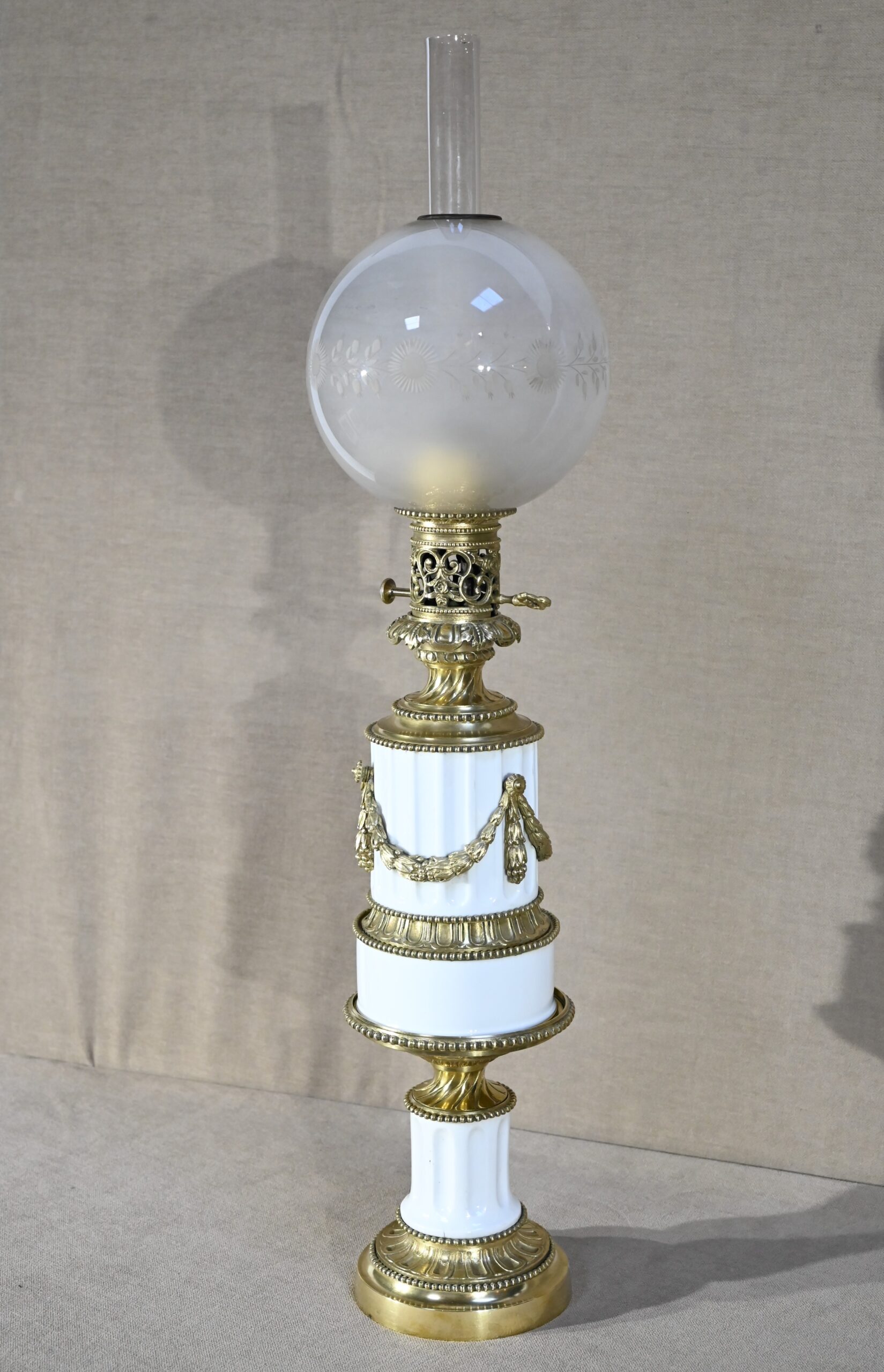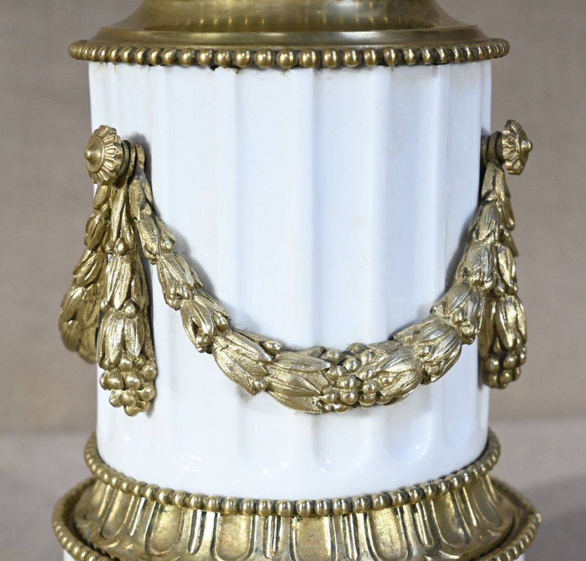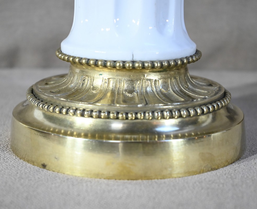 Le réservoir de lampe, aux larges cannelures, est ceint de fines guirlandes en bronze doré et souligné de perlés et de godrons.