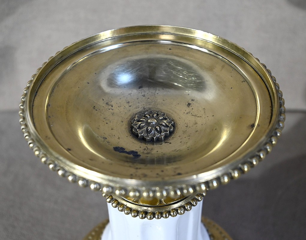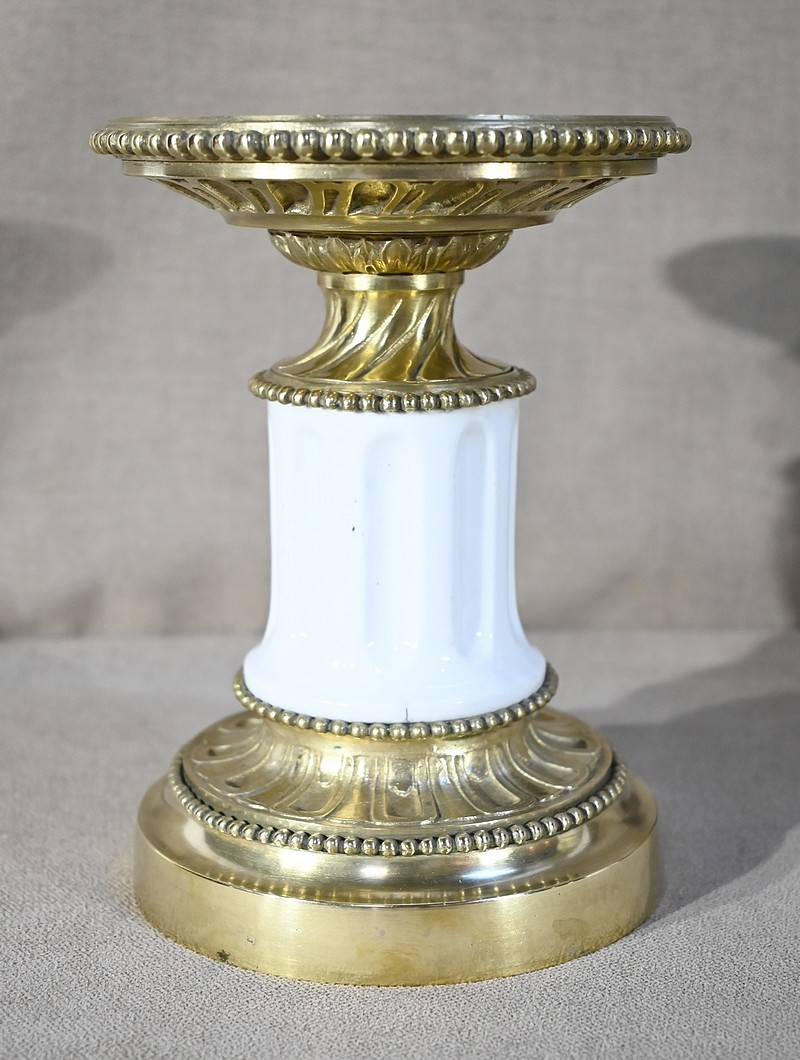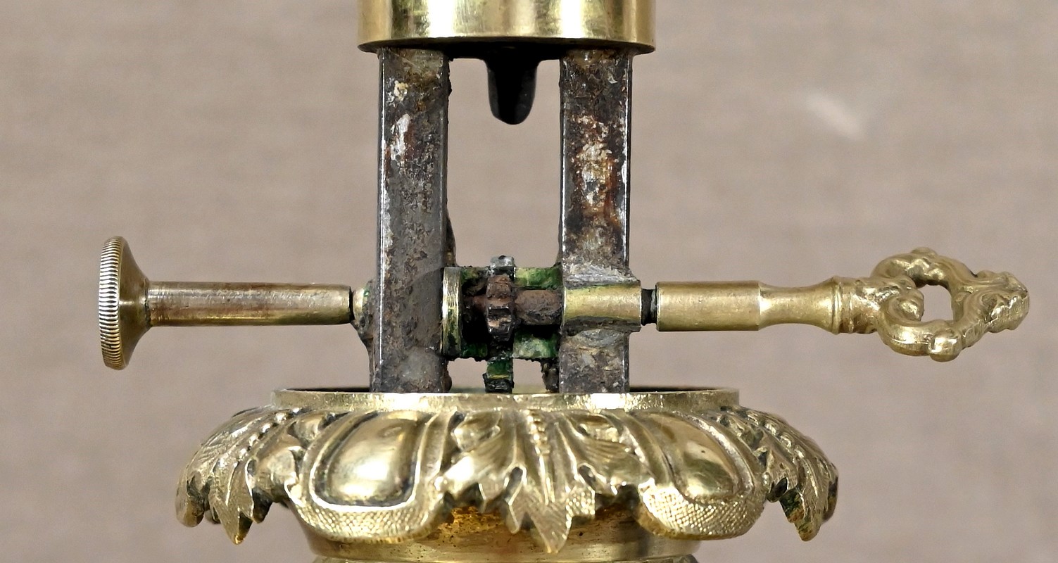 Au-dessus, le piédouche est ciselé à décors de petits oves, il soutient un bec de lampe à motifs de feuilles d’acanthe, de volutes, de perlés et de roses.